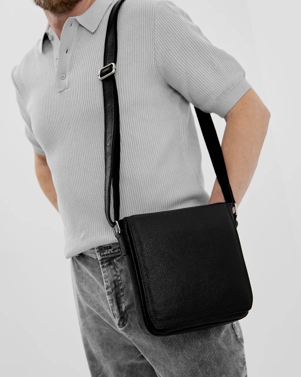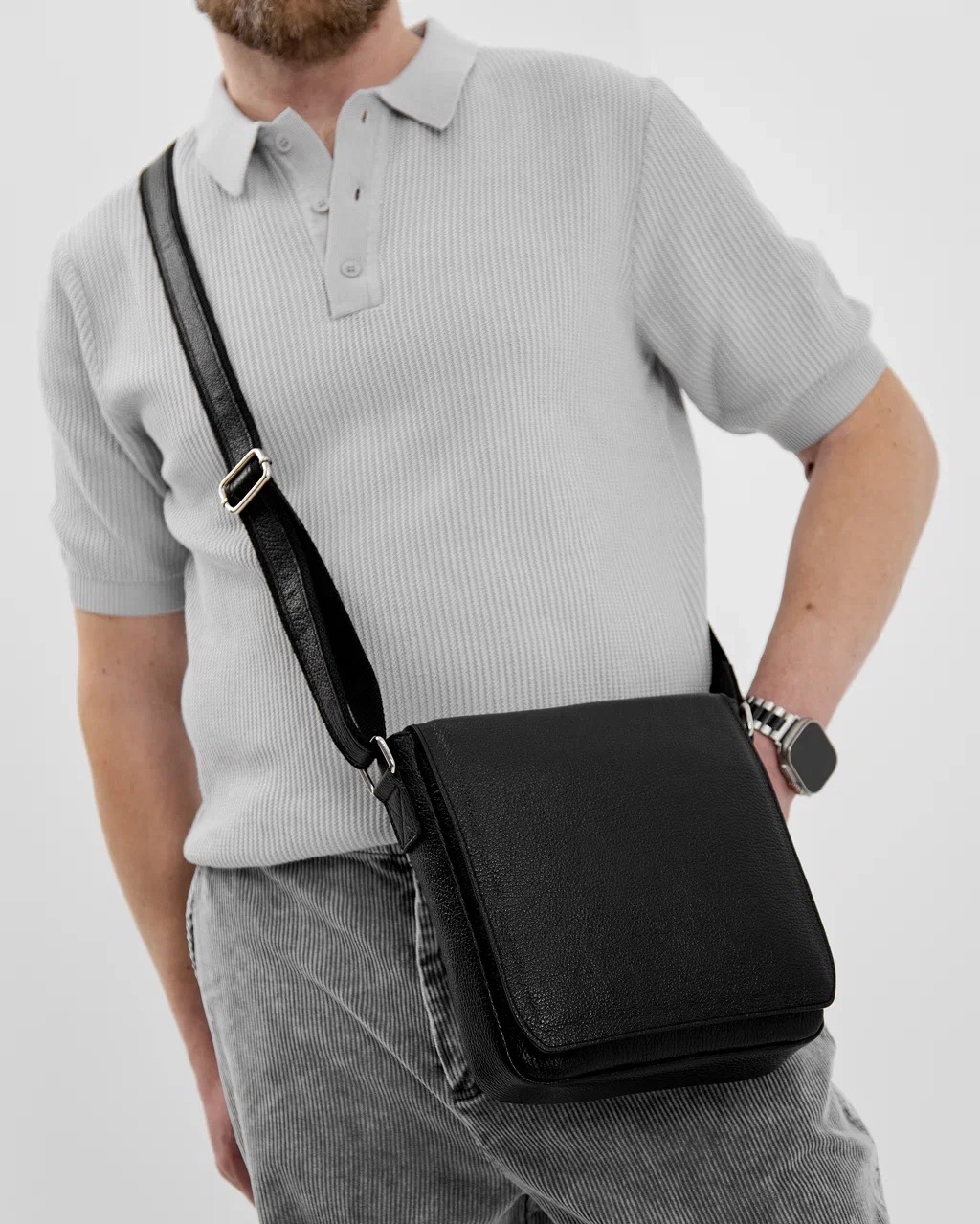 Сумка закрывается на магнитную кнопку и молнию. В комплекте: регулируемый по длине ремень до 145 см.