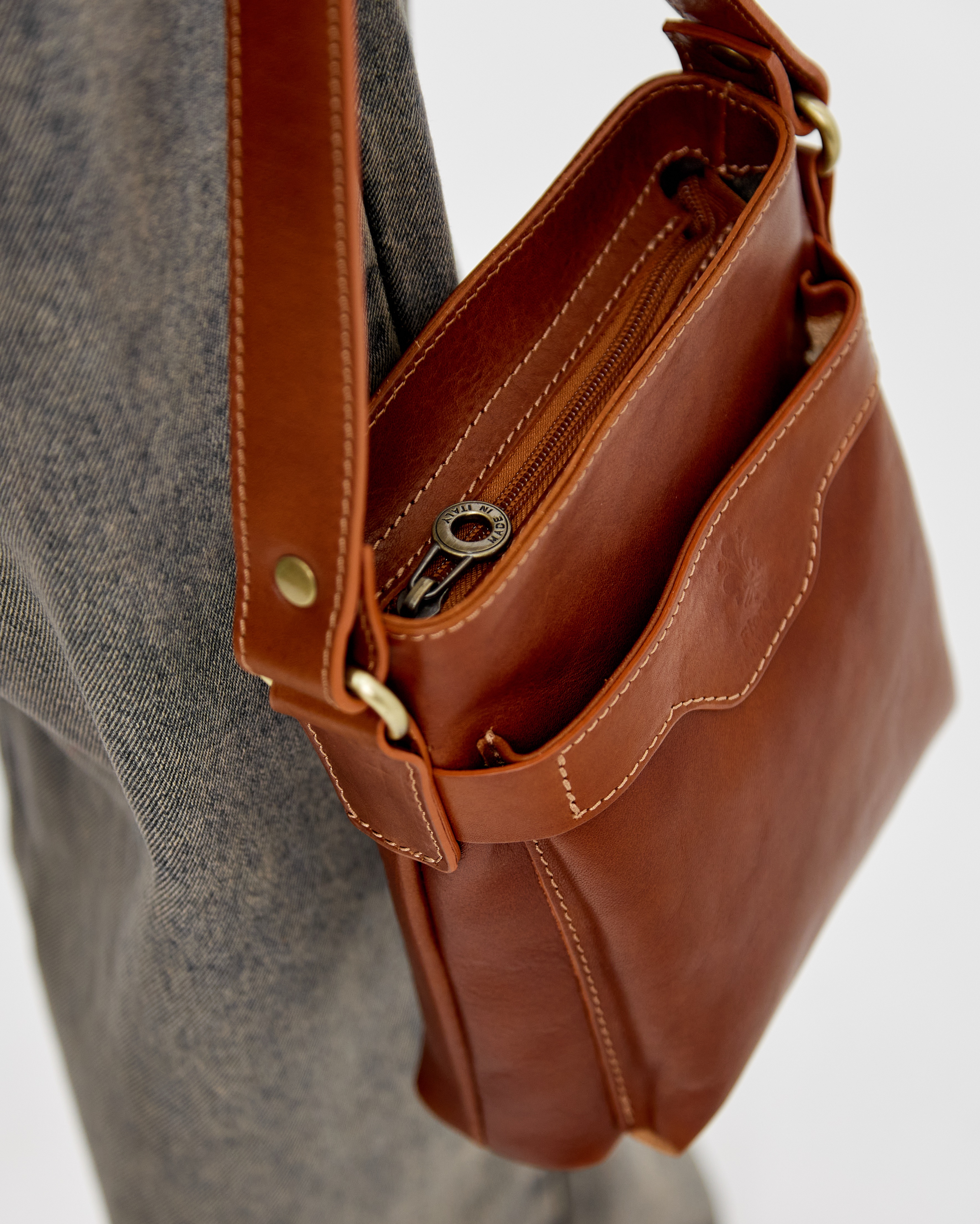 Внутри: одно отделение и карман на молнии. Снаружи: карман на молнии и на магнитной кнопке. Сумка закрывается на молнию. В комплекте: регулируемый по длине ремень до 135 см.