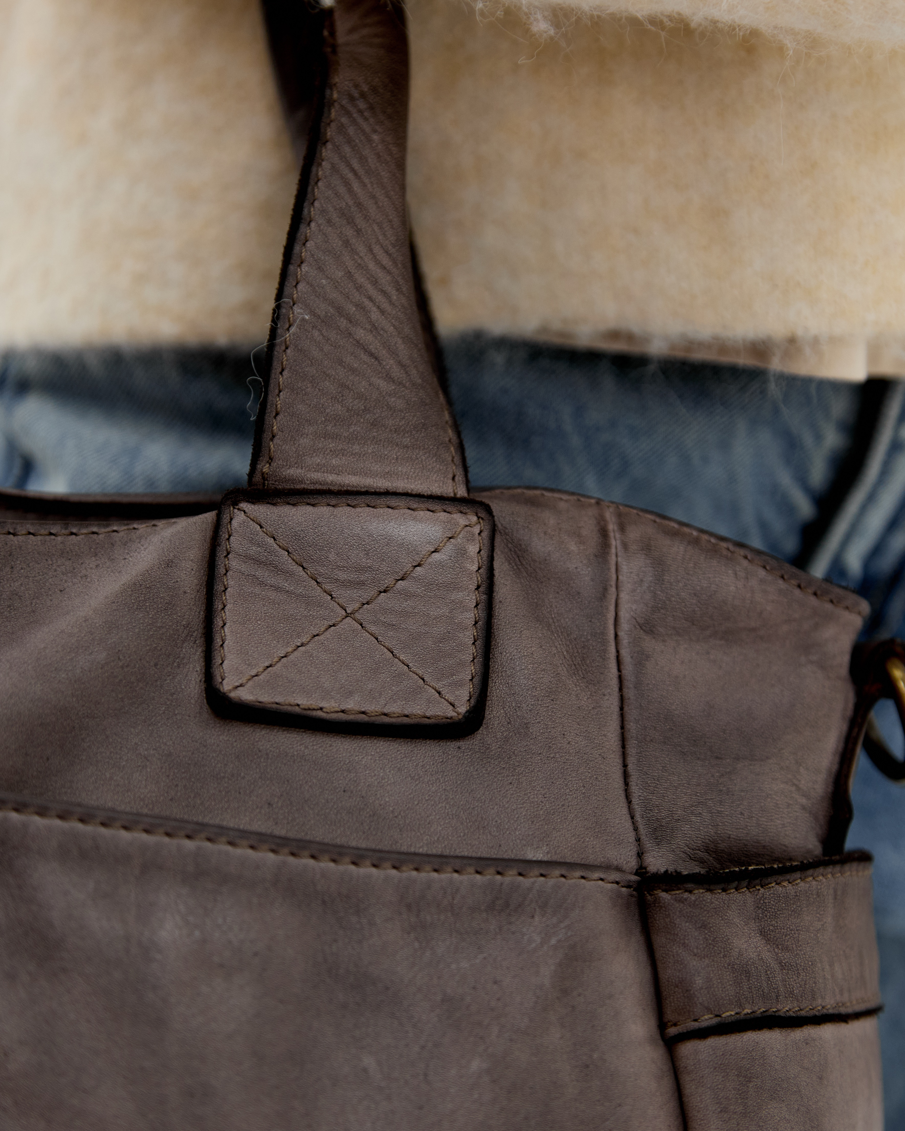 Сумка выполнена из натуральной зернистой кожи и декорирована фурнитурой латунного цвета.