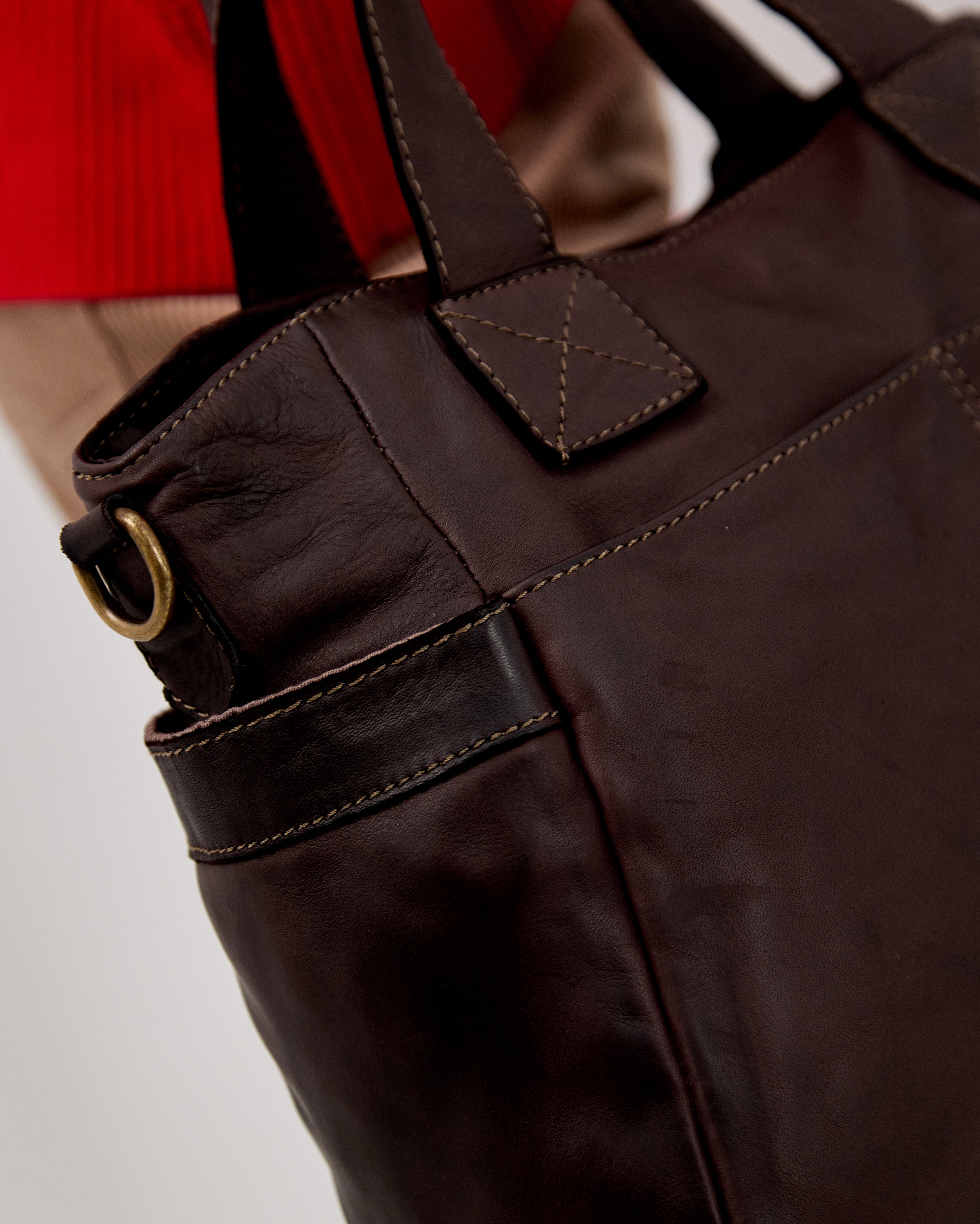 Сумка выполнена из натуральной зернистой кожи и декорирована фурнитурой латунного цвета.