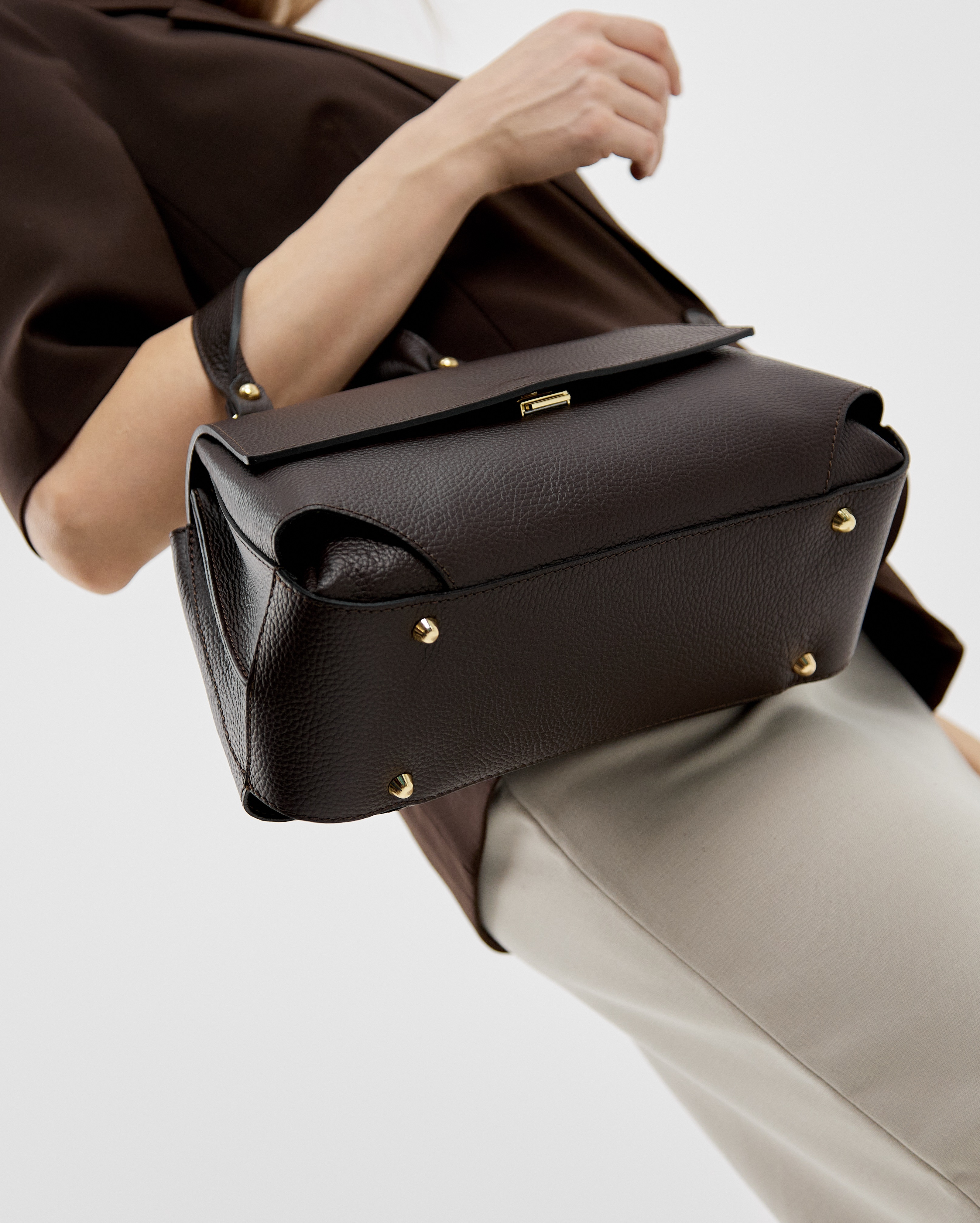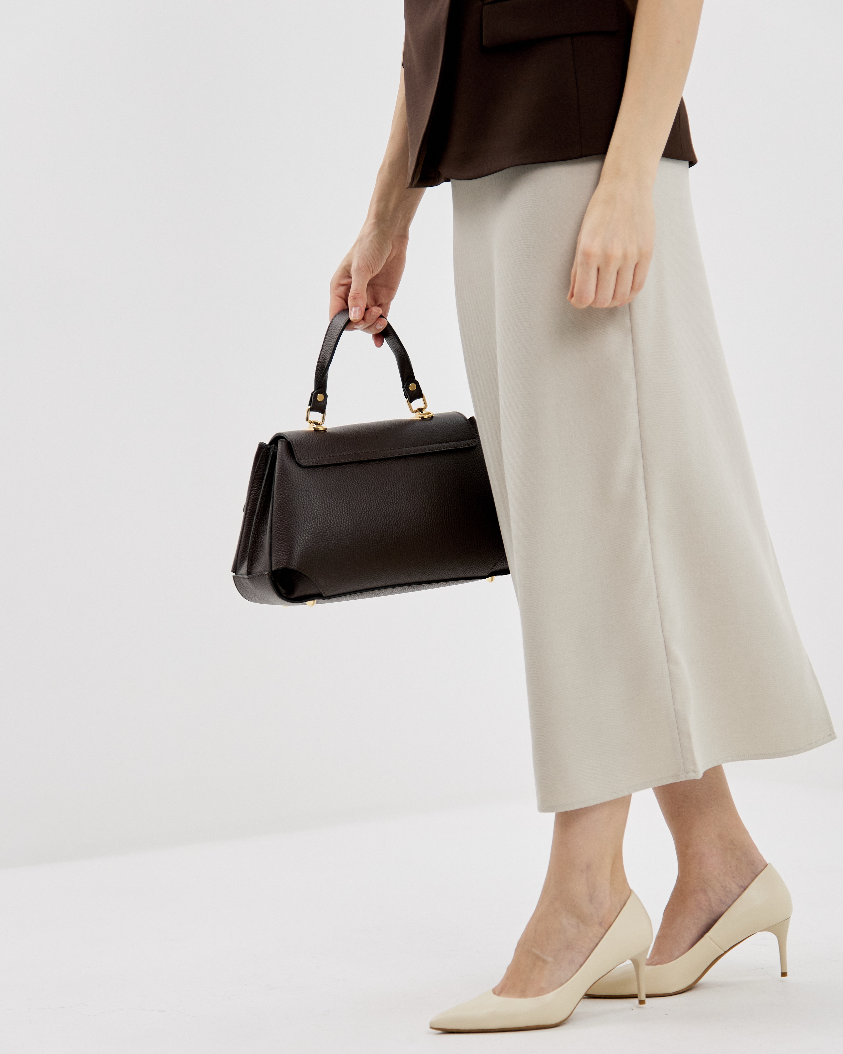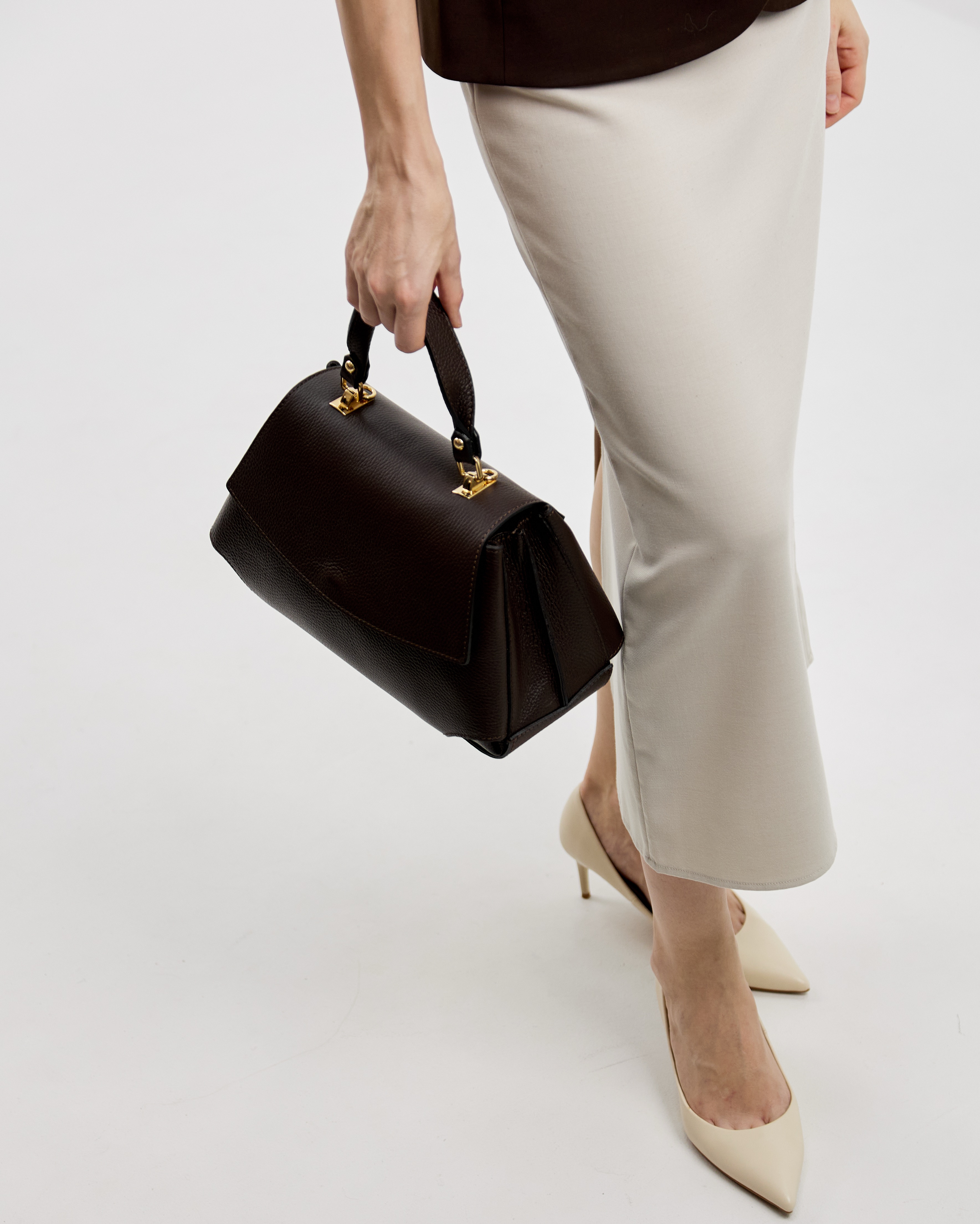Сумка выполнена из натуральной зернистой кожи. Фурнитура выполнена в золотом цвете. Сумка закрывается на прочный механизм, что обеспечивает легкий доступ к содержимому сумки.
