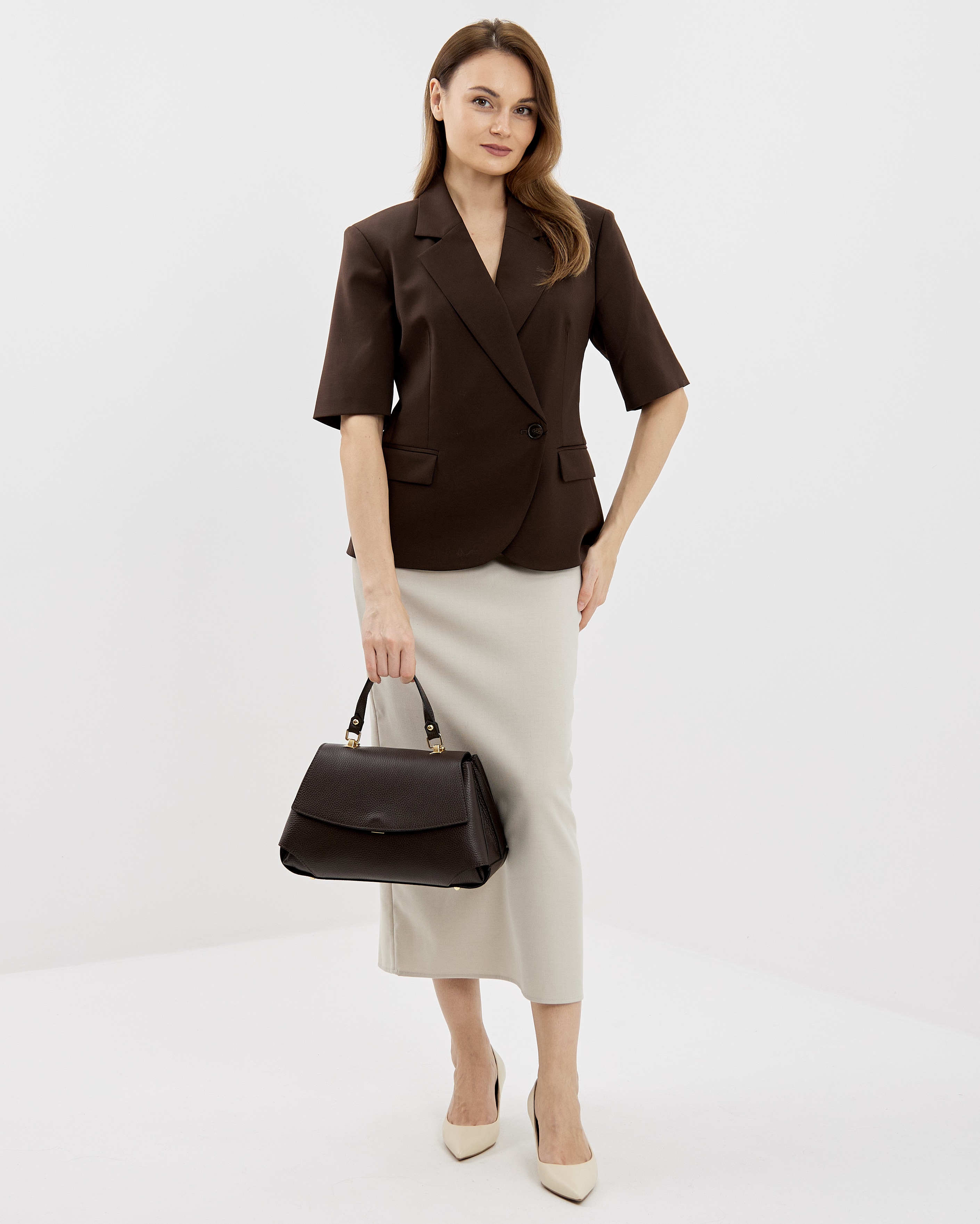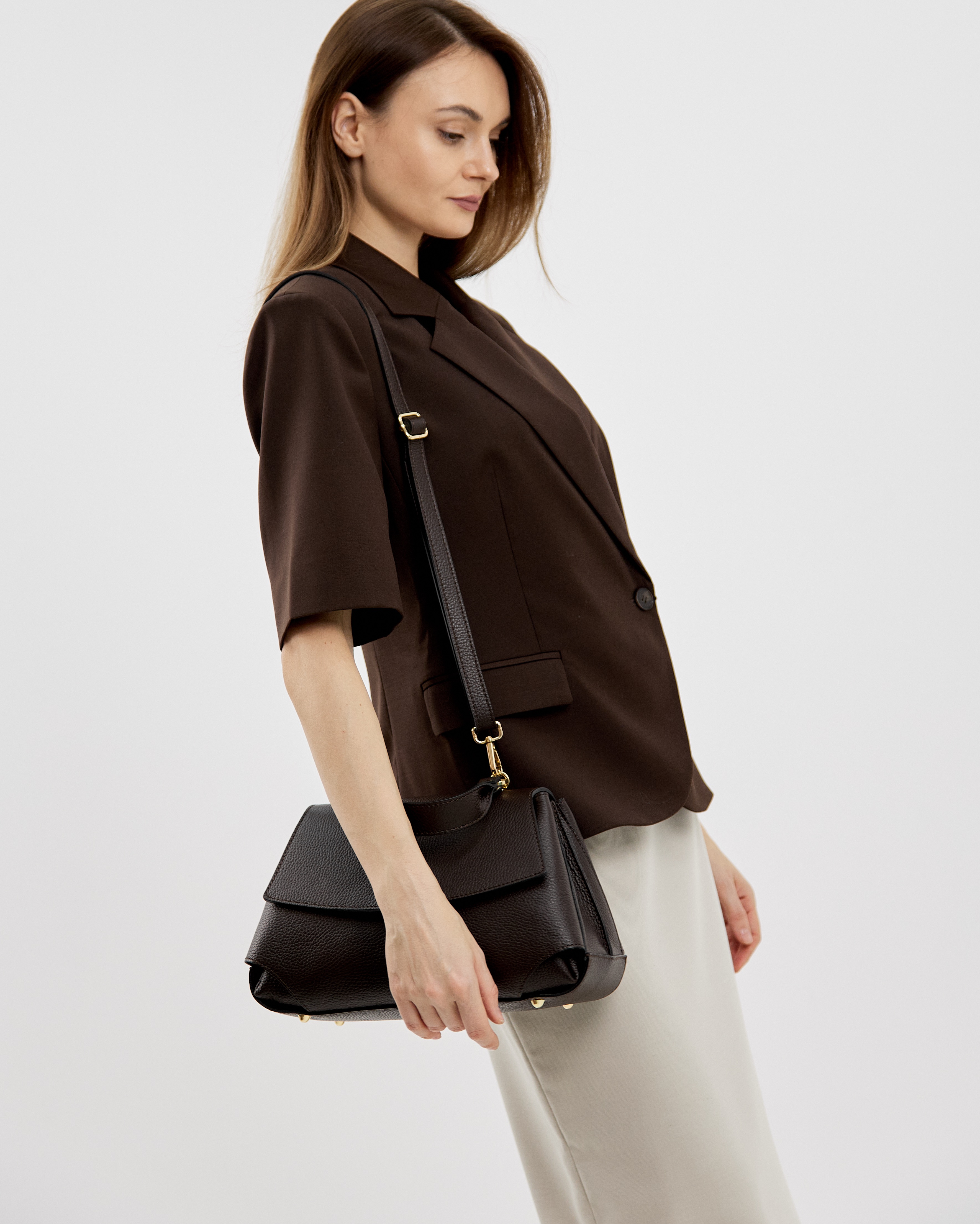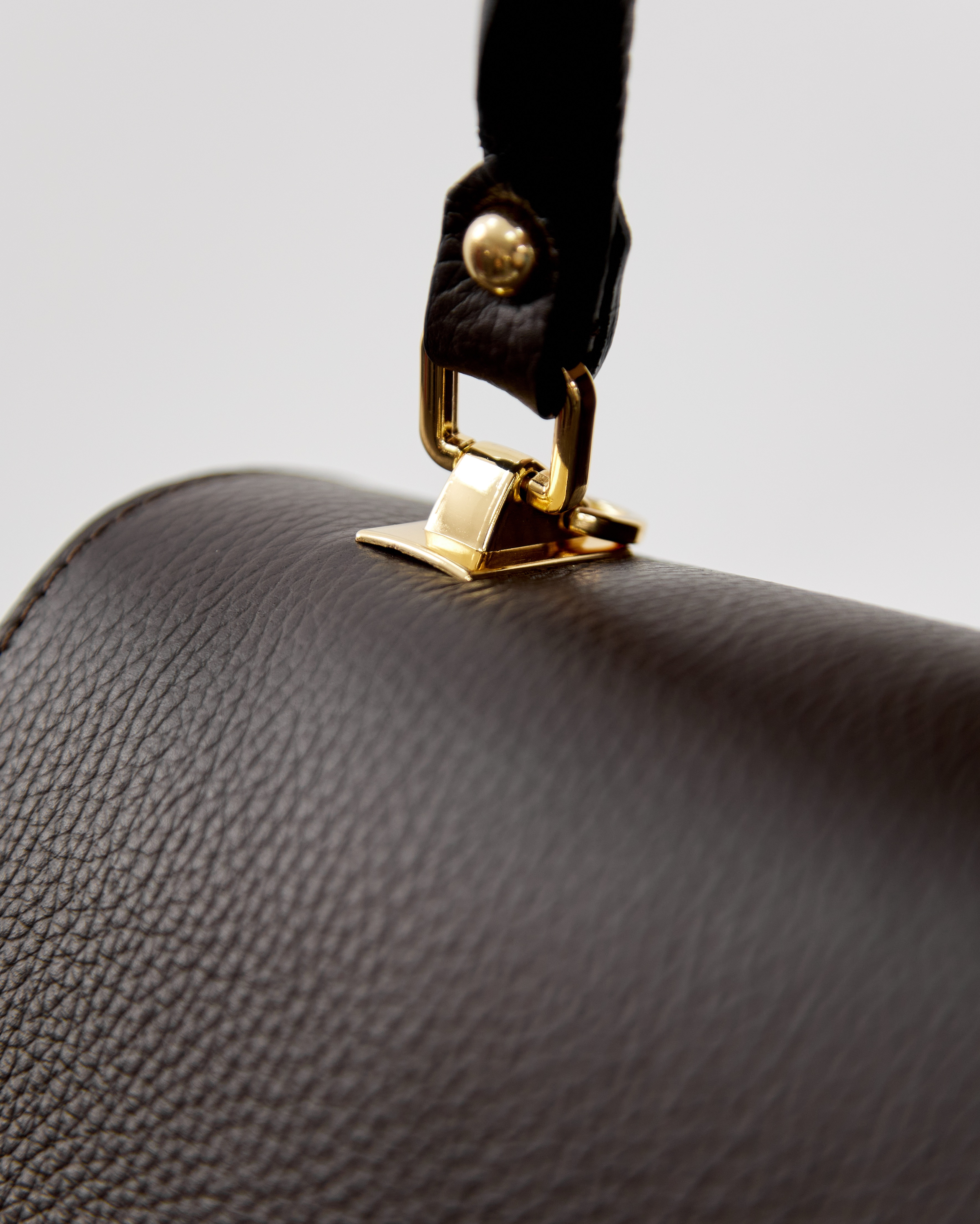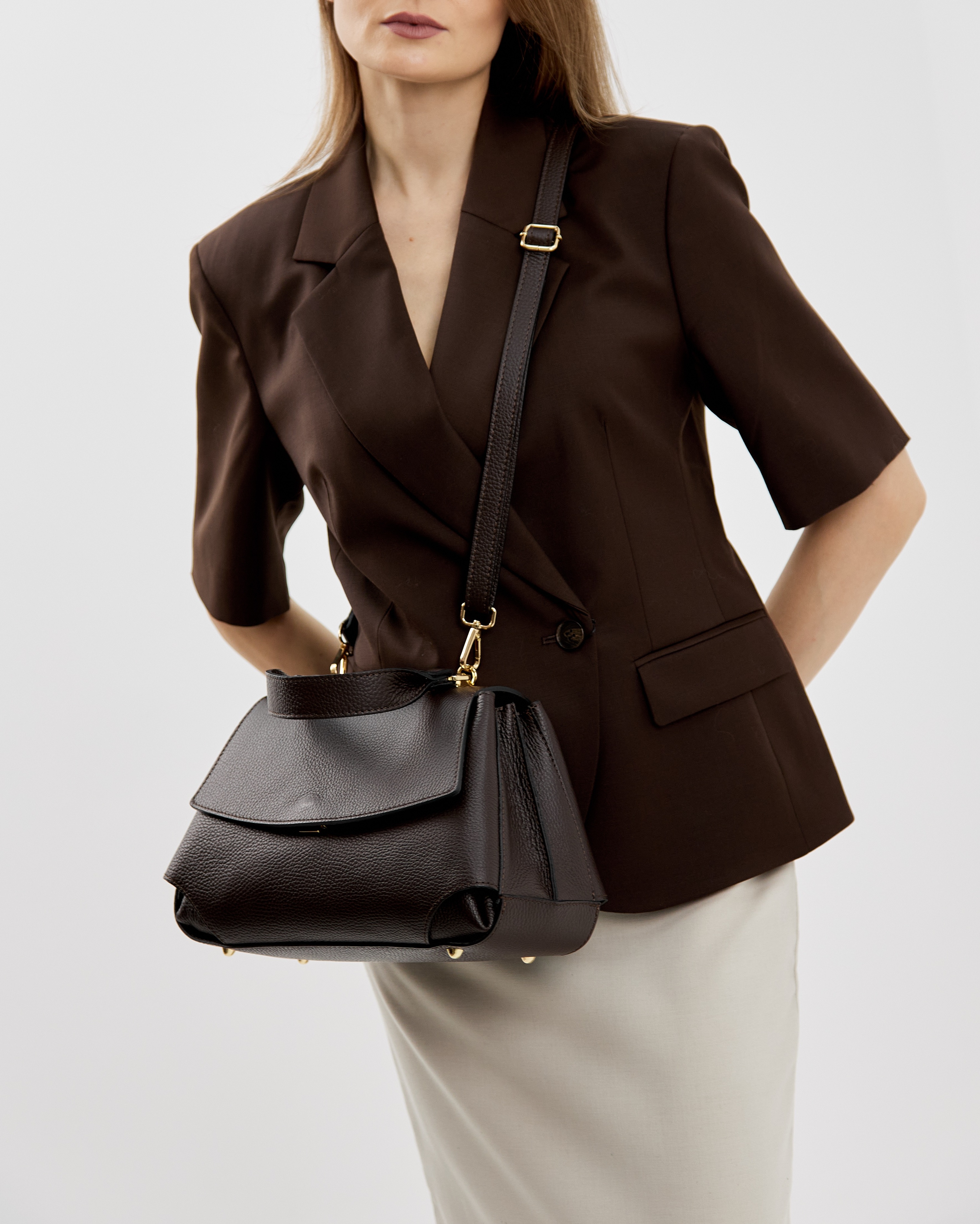 Сумка выполнена из натуральной зернистой кожи. Фурнитура выполнена в золотом цвете. Сумка закрывается на прочный механизм, что обеспечивает легкий доступ к содержимому сумки.