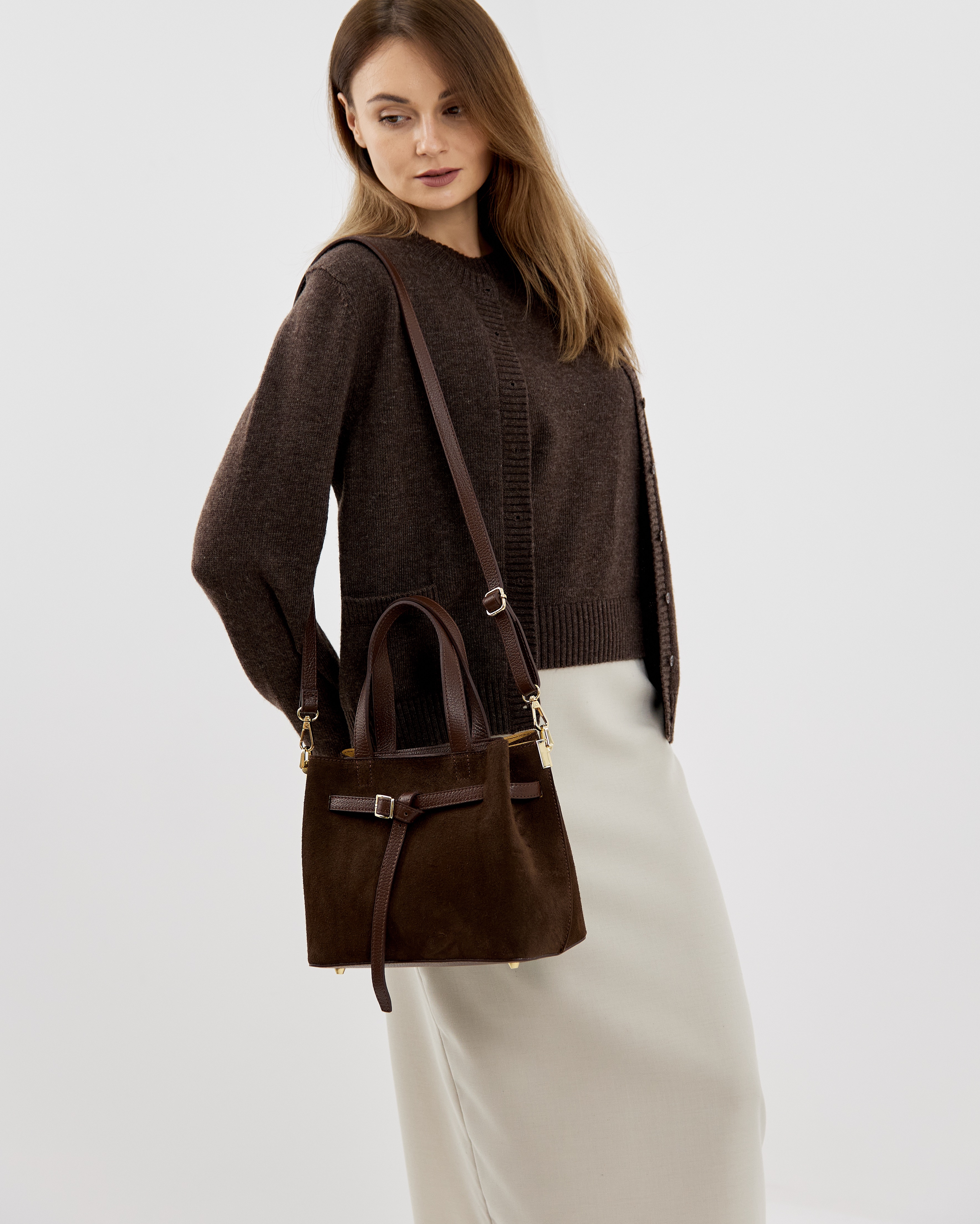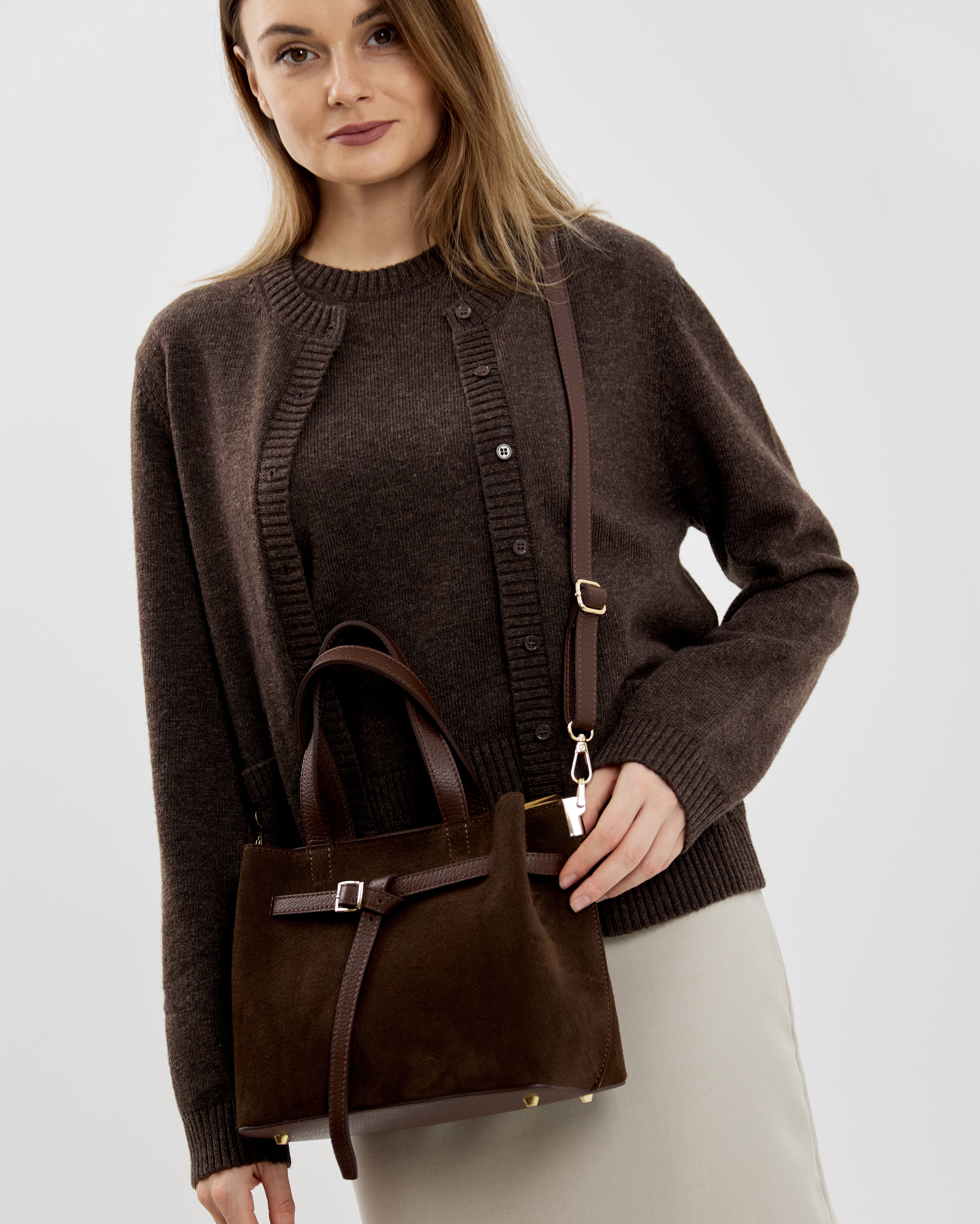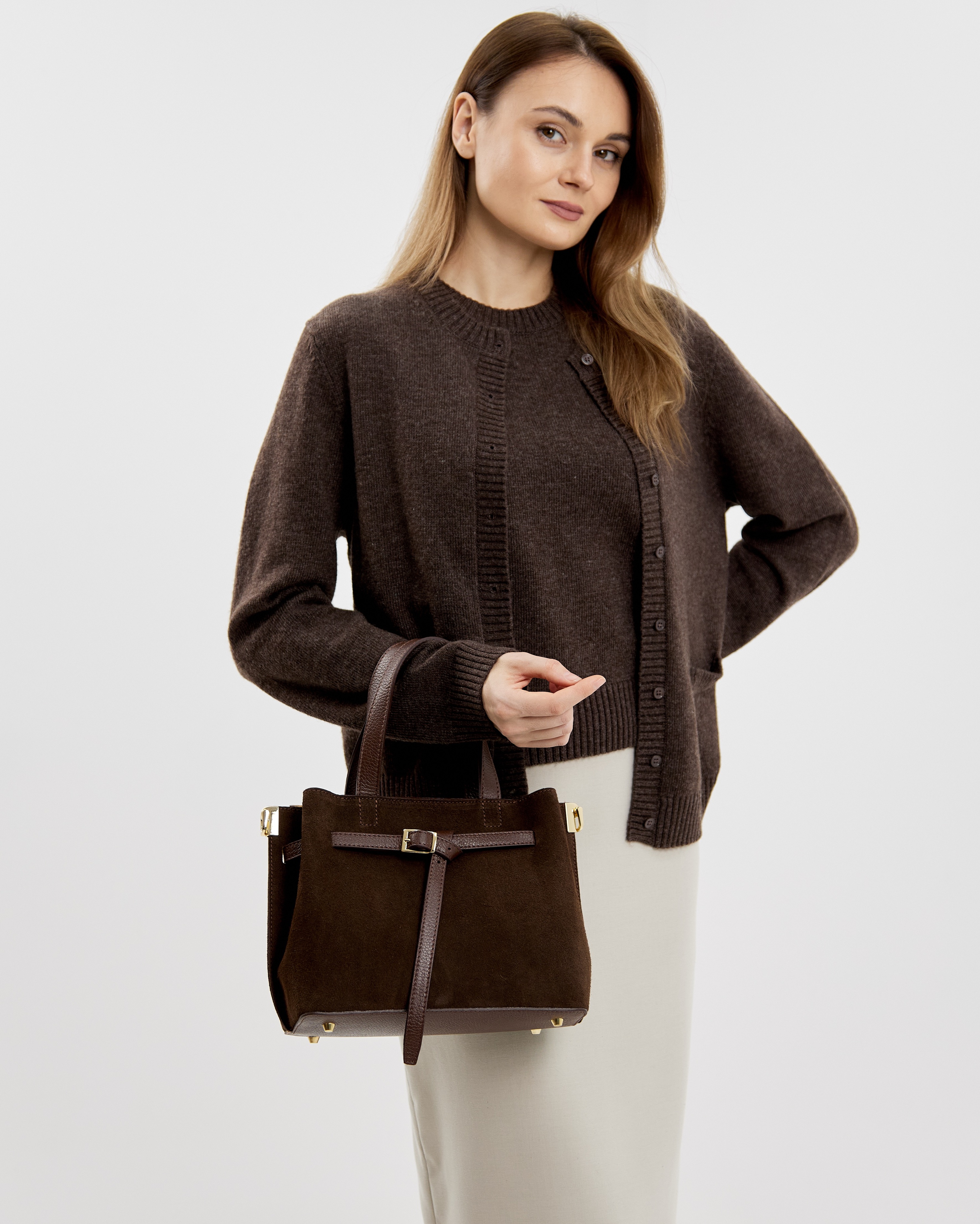 Сумка выполнена из натуральной замши и декорирована фурнитурой золотого цвета.