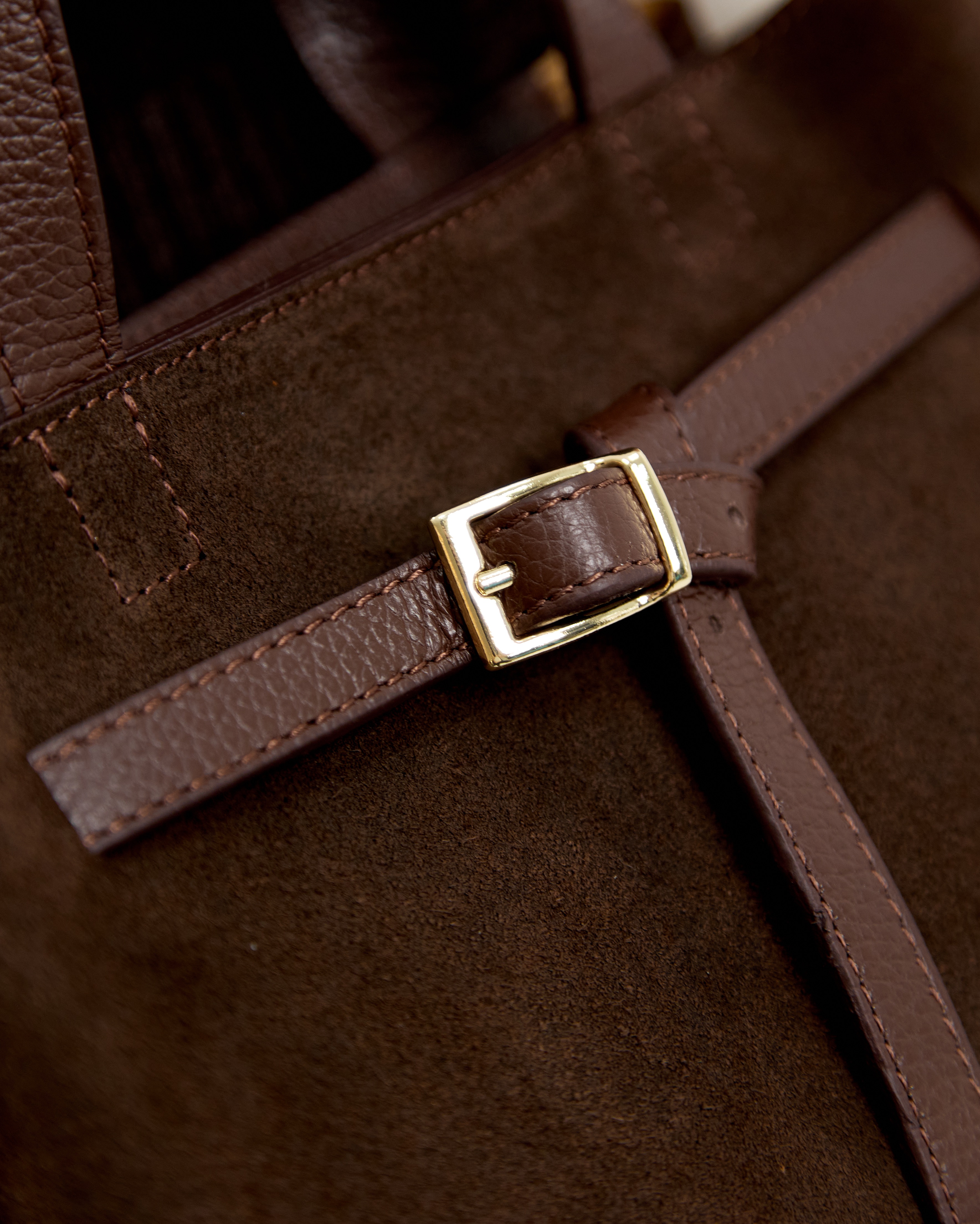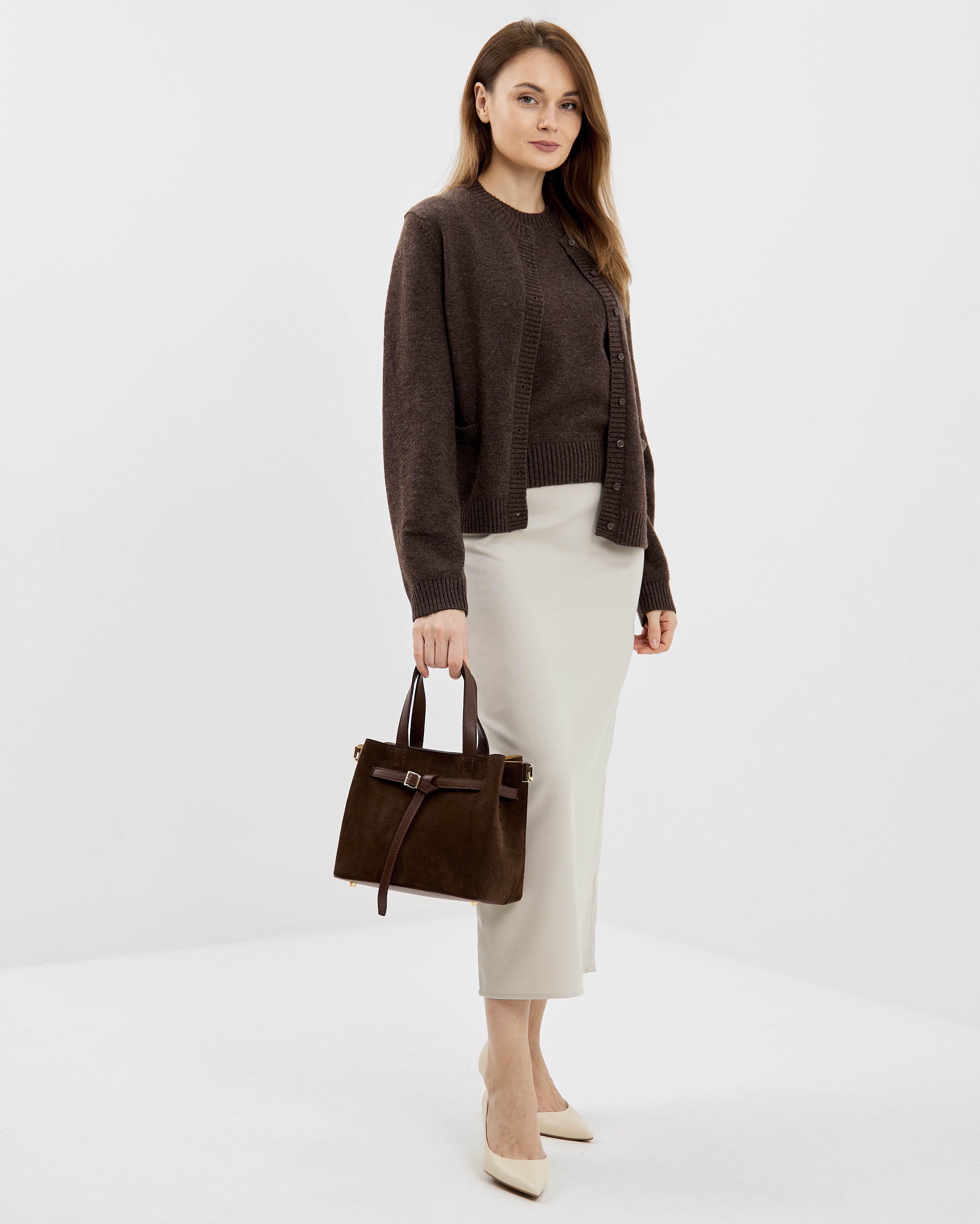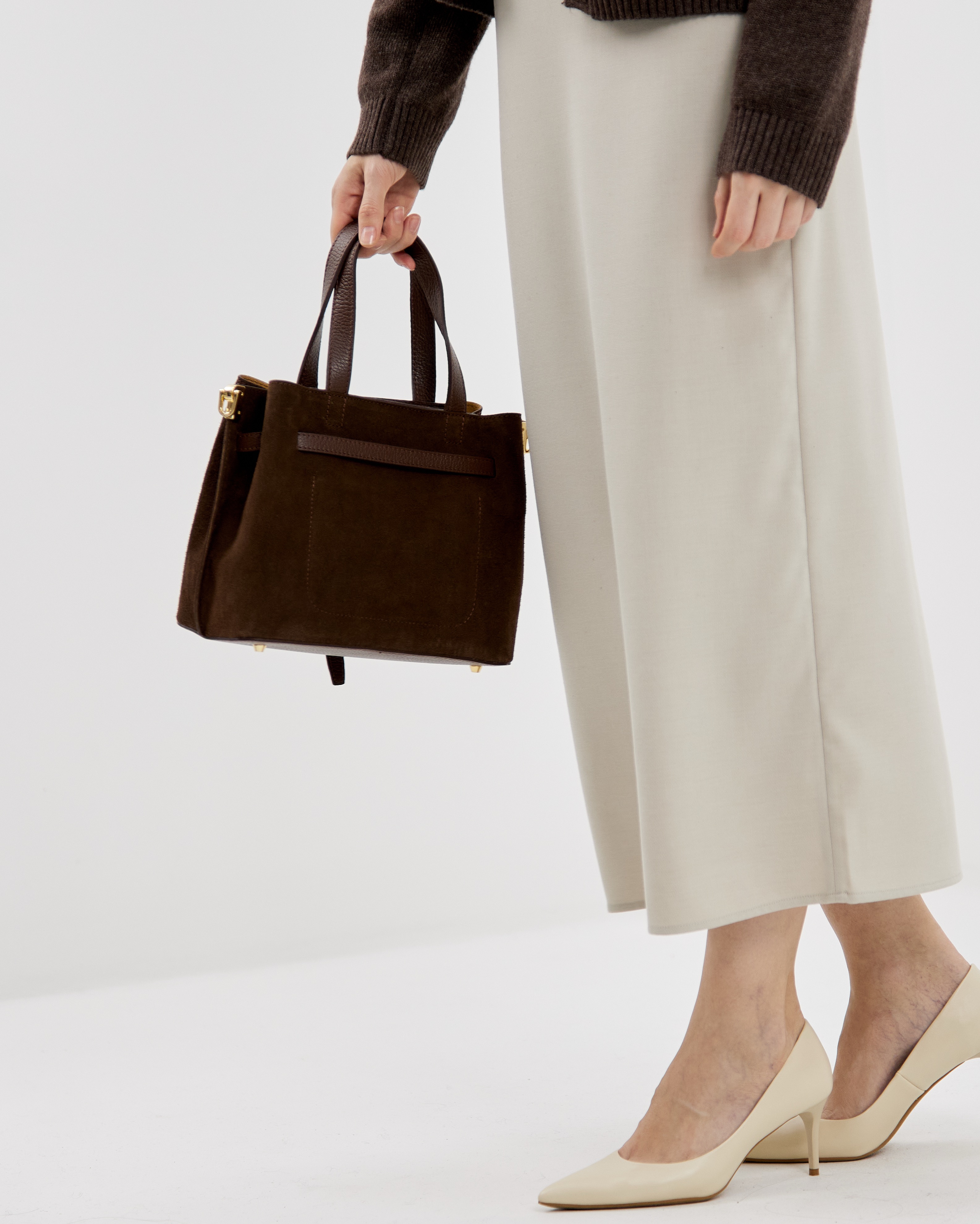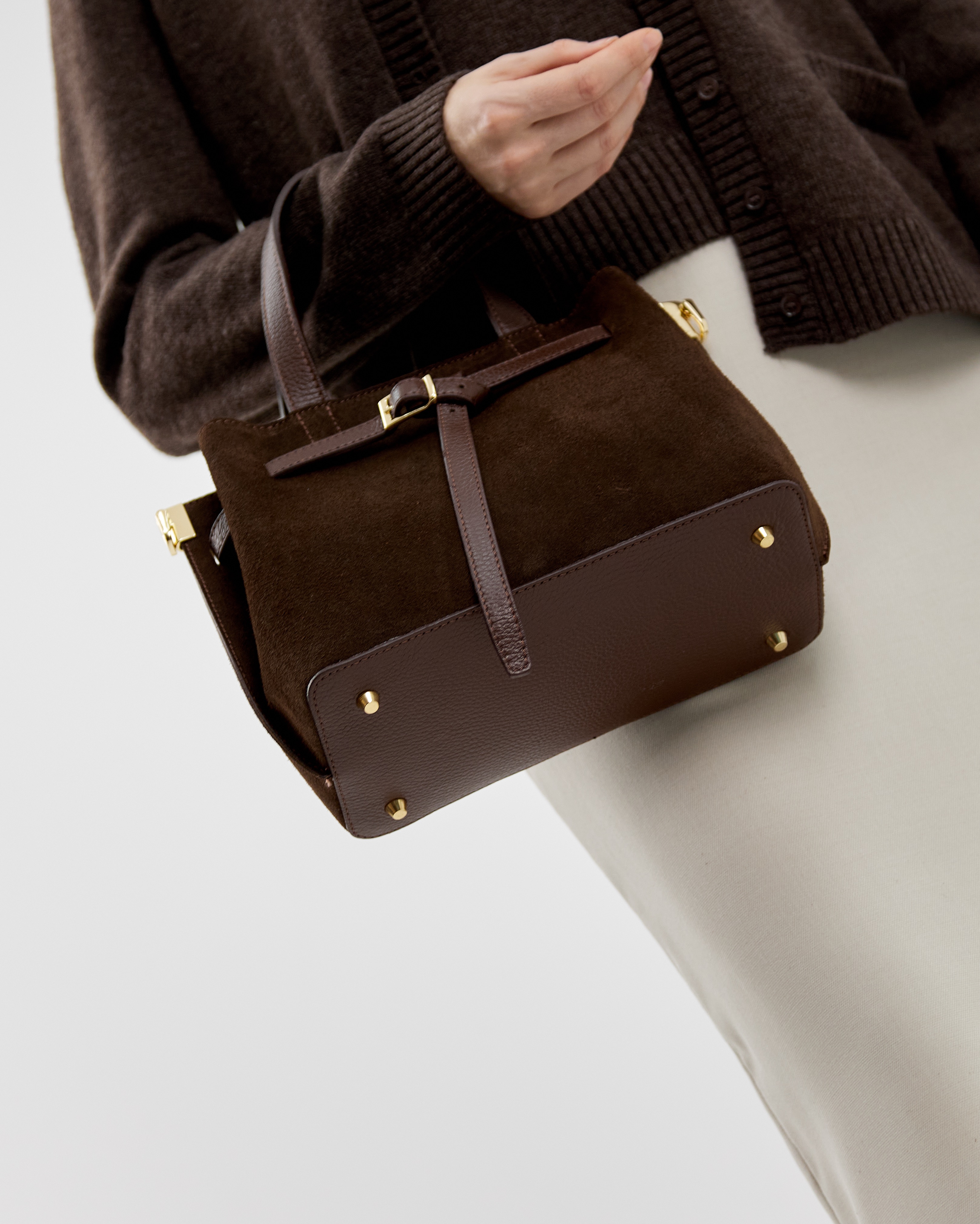 Сумка выполнена из натуральной замши и декорирована фурнитурой золотого цвета.