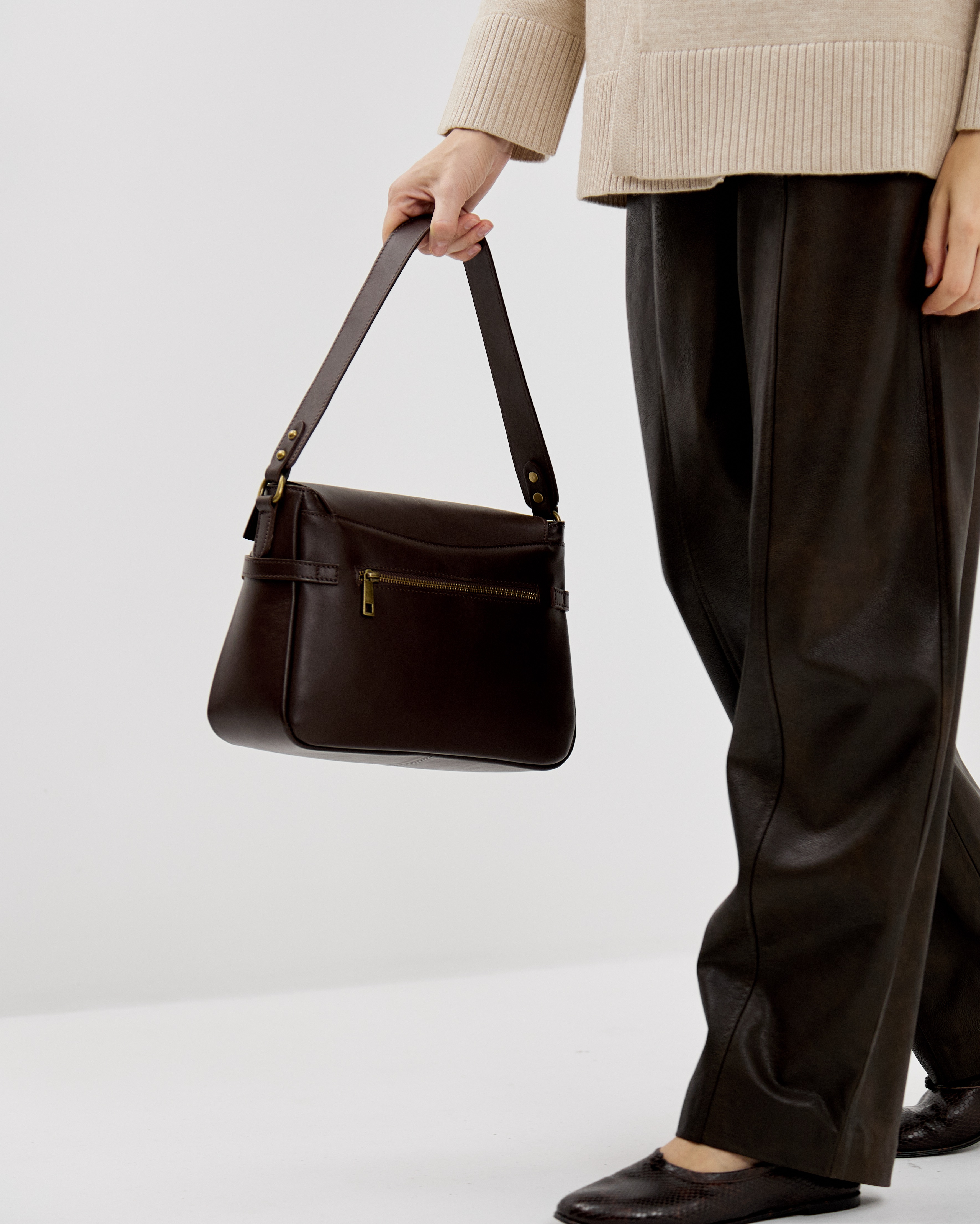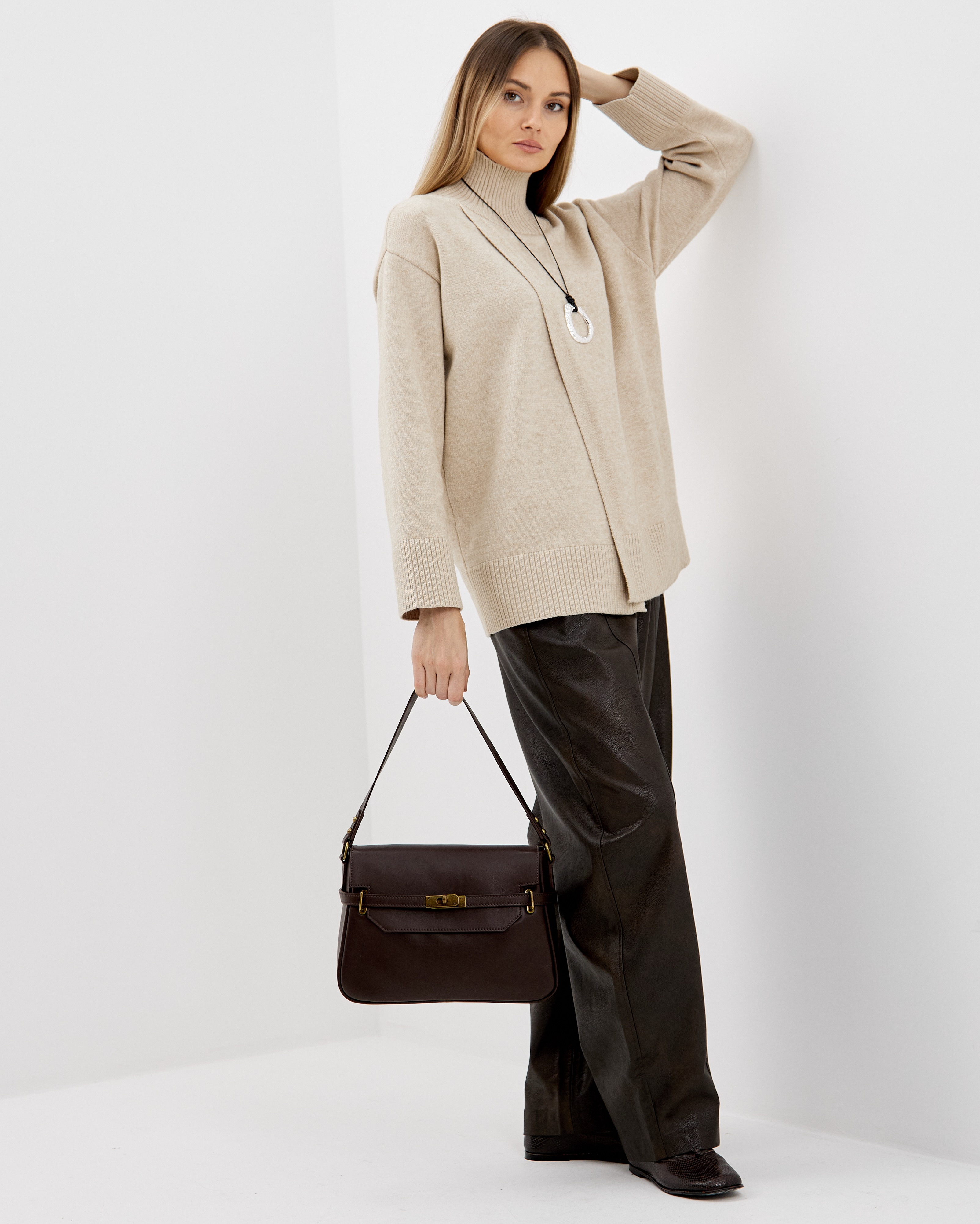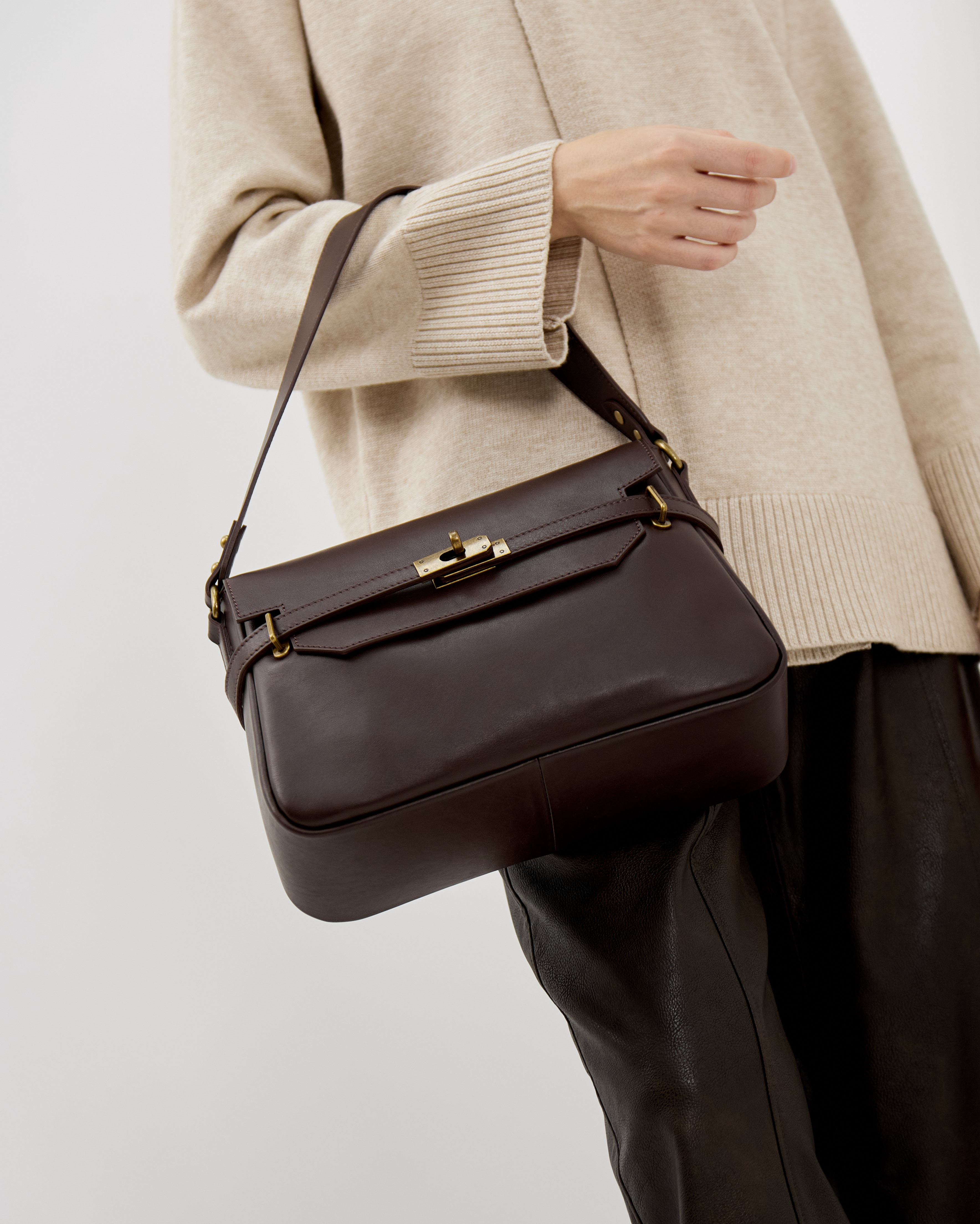 Сумка выполнена из натуральной кожи и декорирована фурнитурой латунного цвета. Лаконичный дизайн сумки позволяет легко сочетать ее с разными образами .
