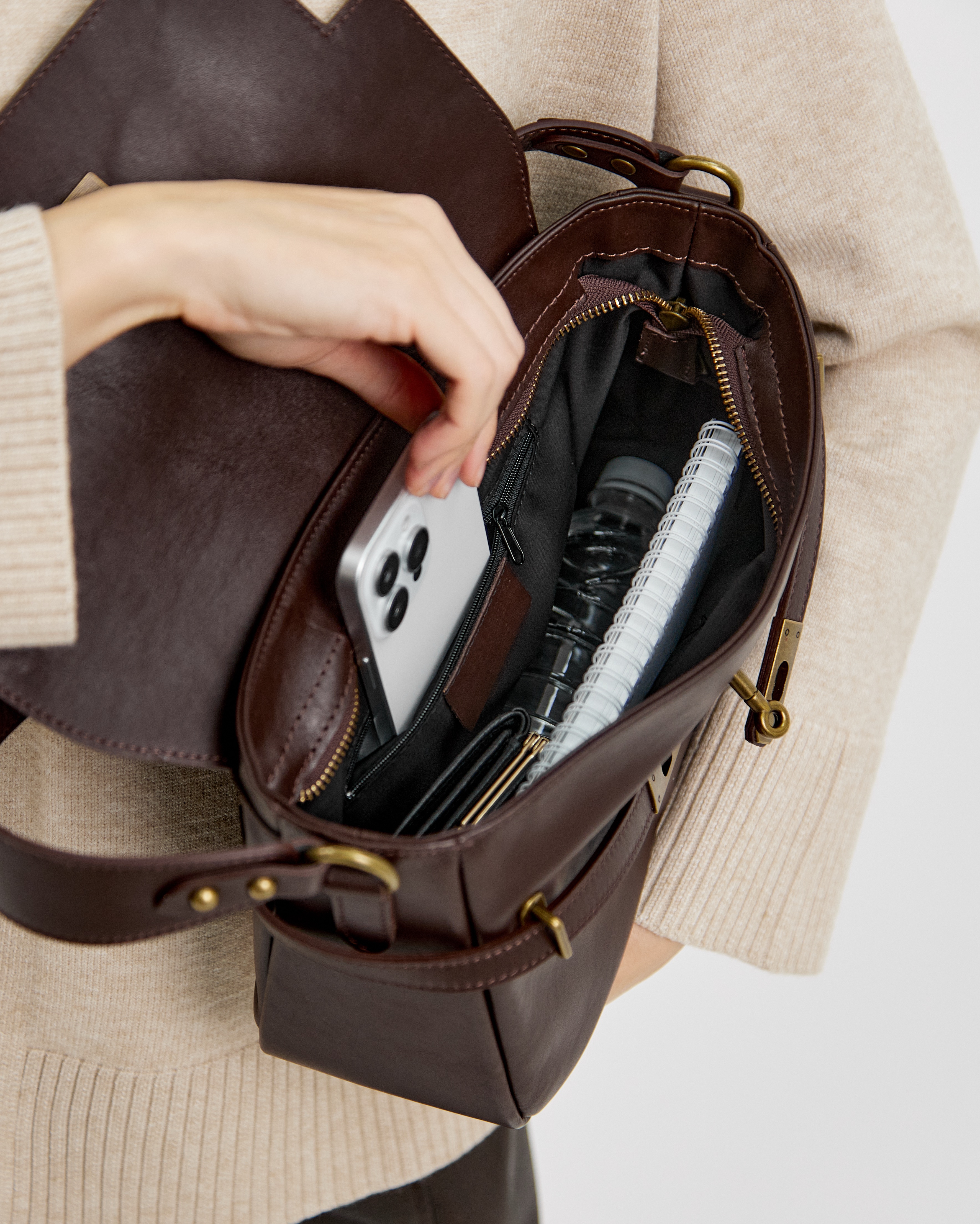 В комплекте регулируемый ремень шириной 1,3 см, а также короткий шириной 4 см. Внутри: одно отделение, а также карман на молнии два кармана открытого типа. Снаружи: карман на молнии.