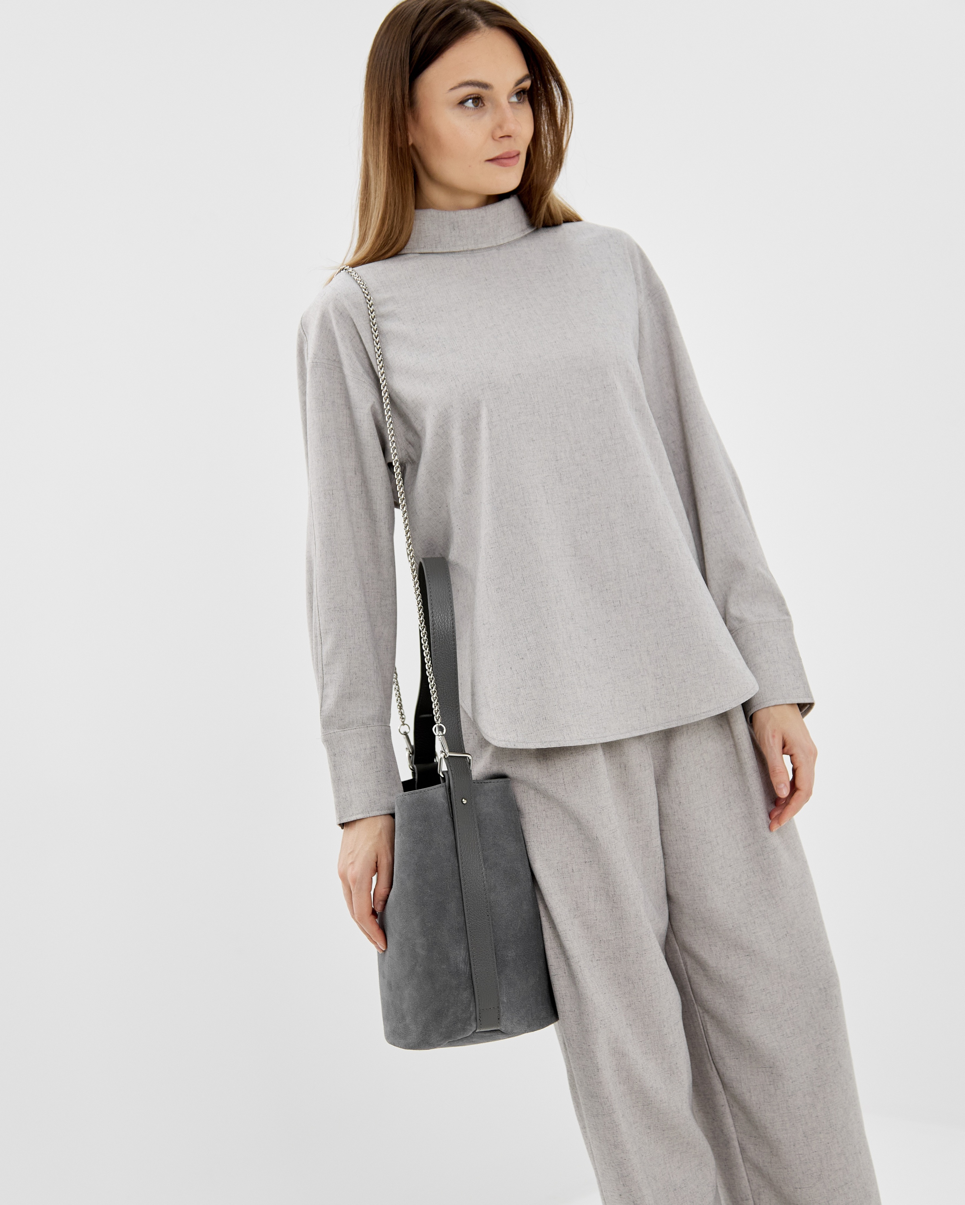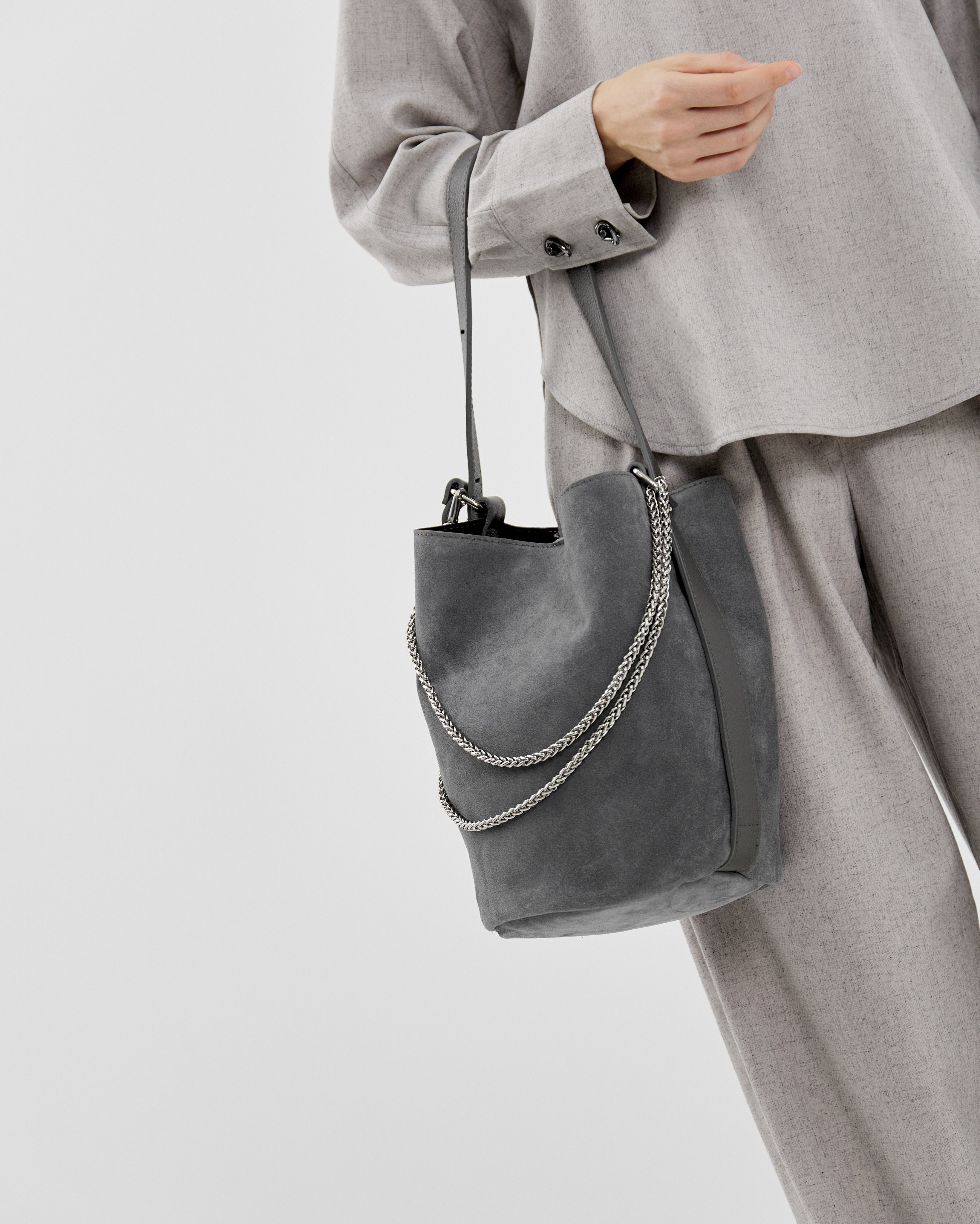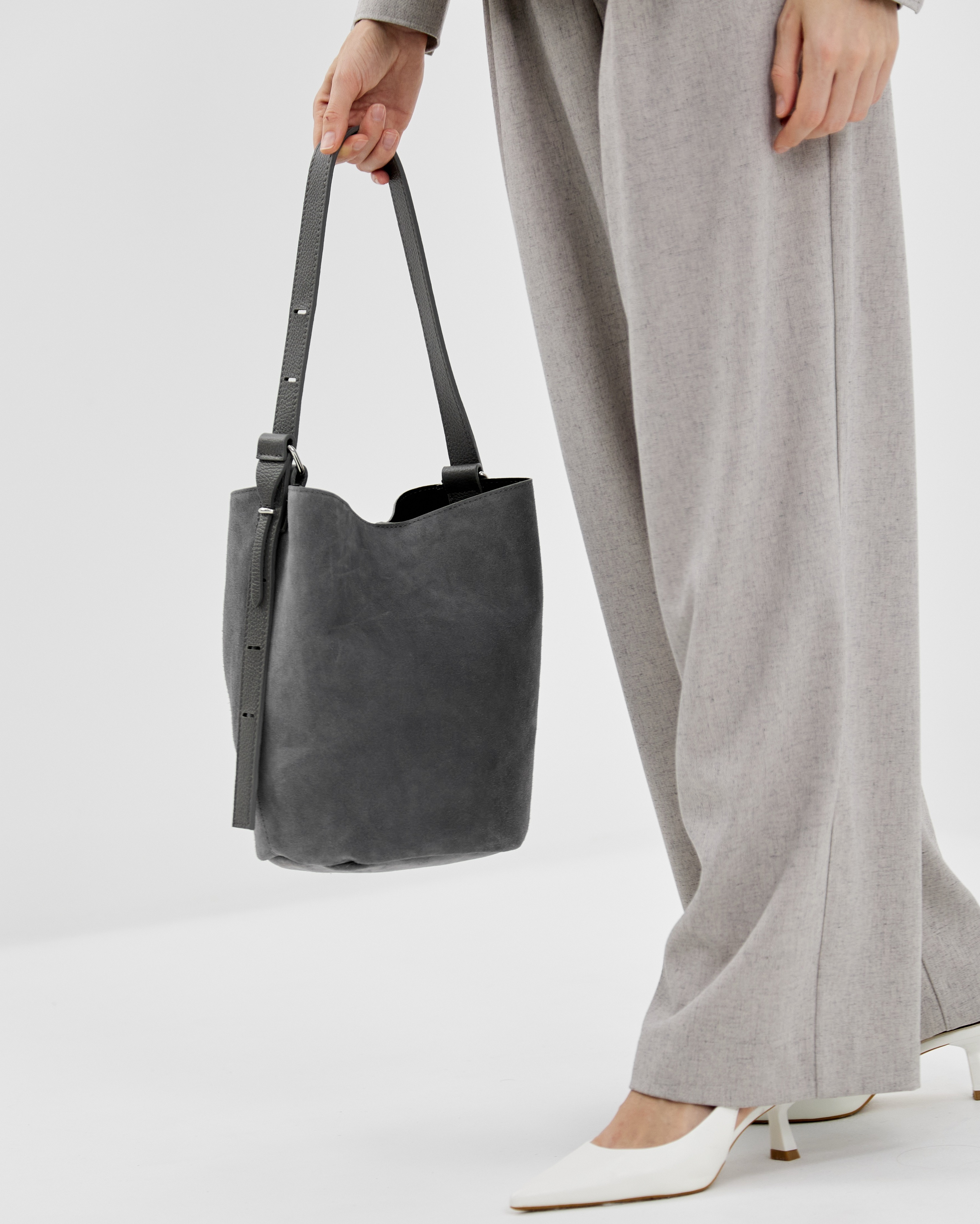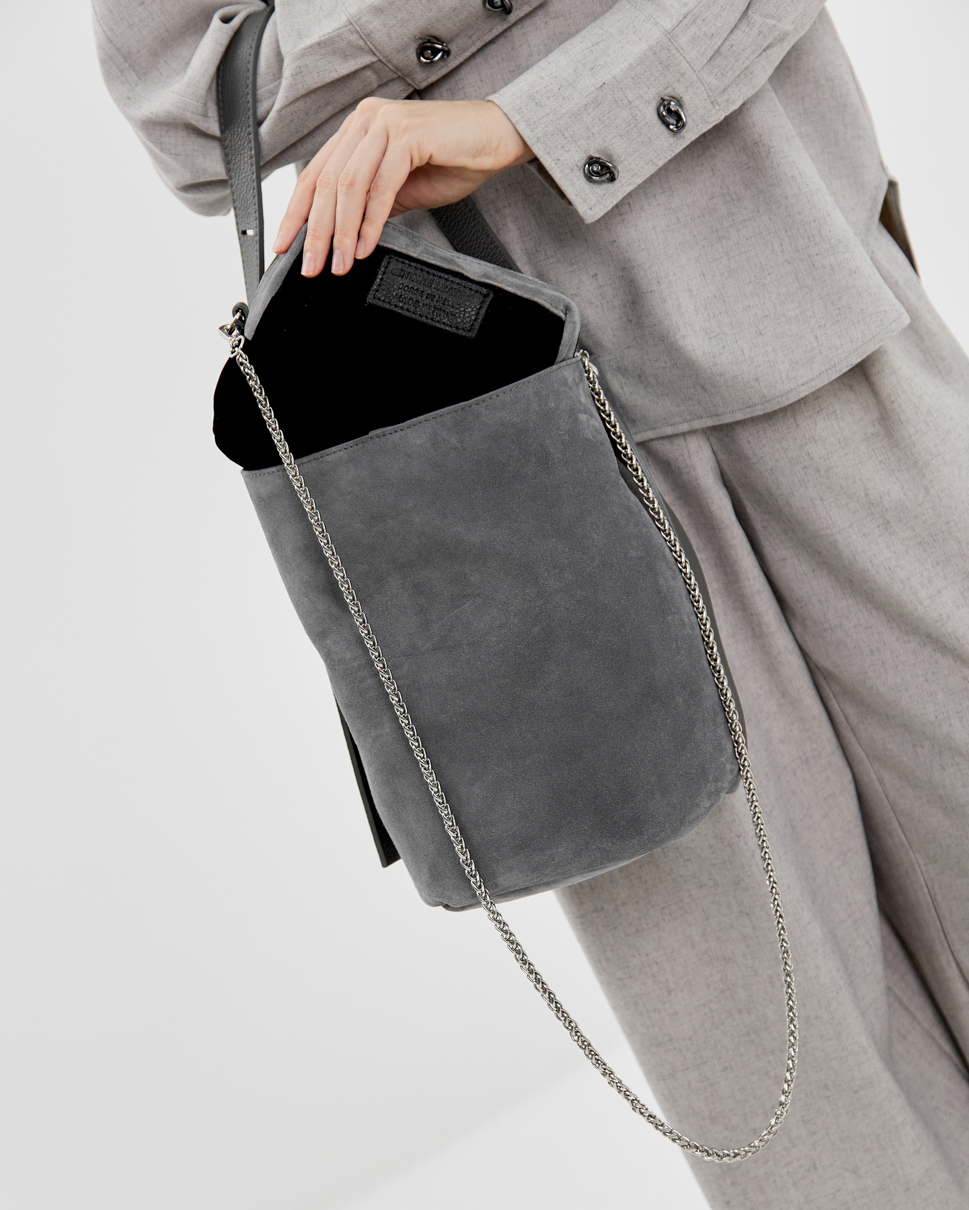 Сумка выполнена из натуральной замши и декорирована фурнитурой серебряного цвета. Лаконичный дизайн сумки позволяет легко сочетать ее с разными образами .