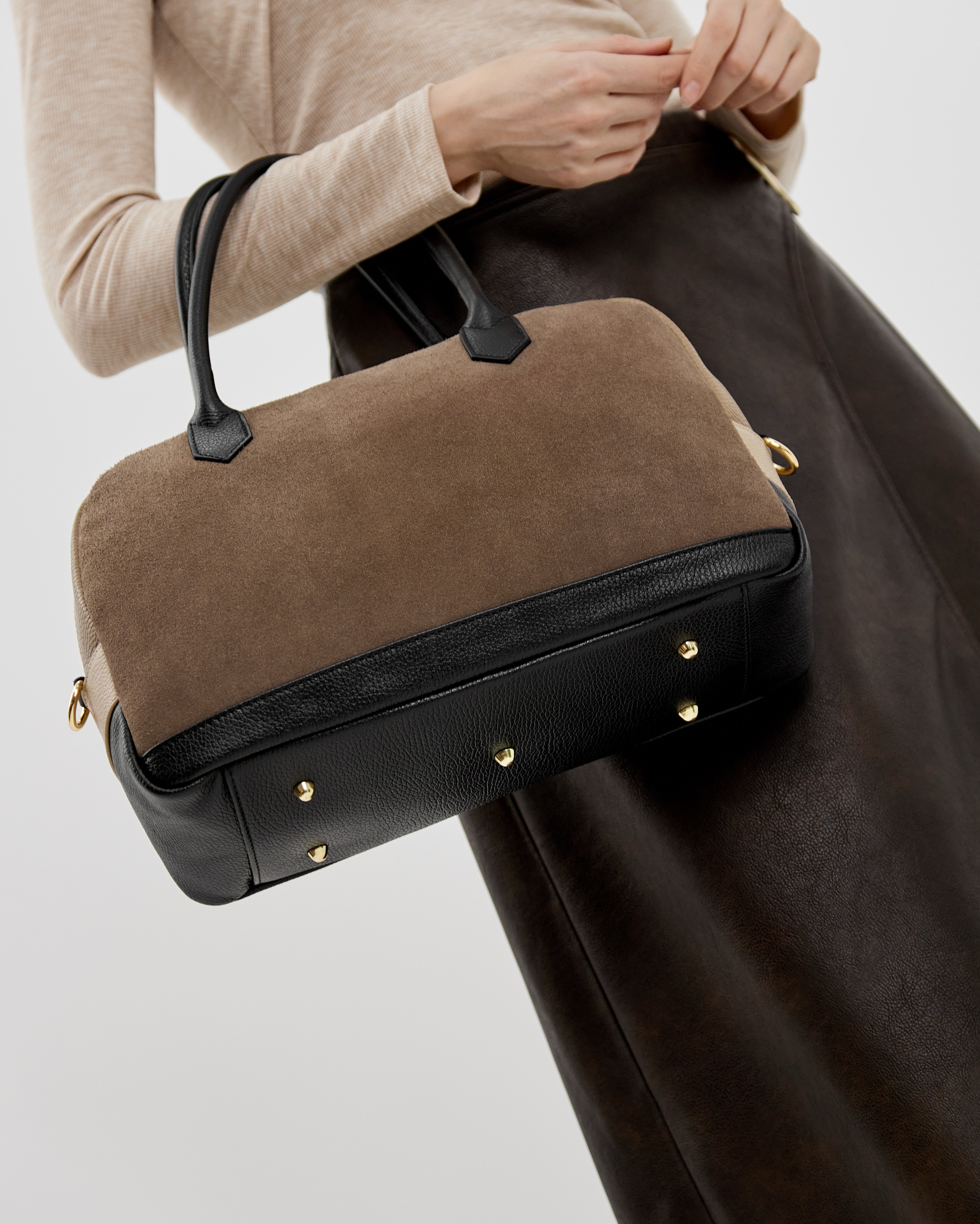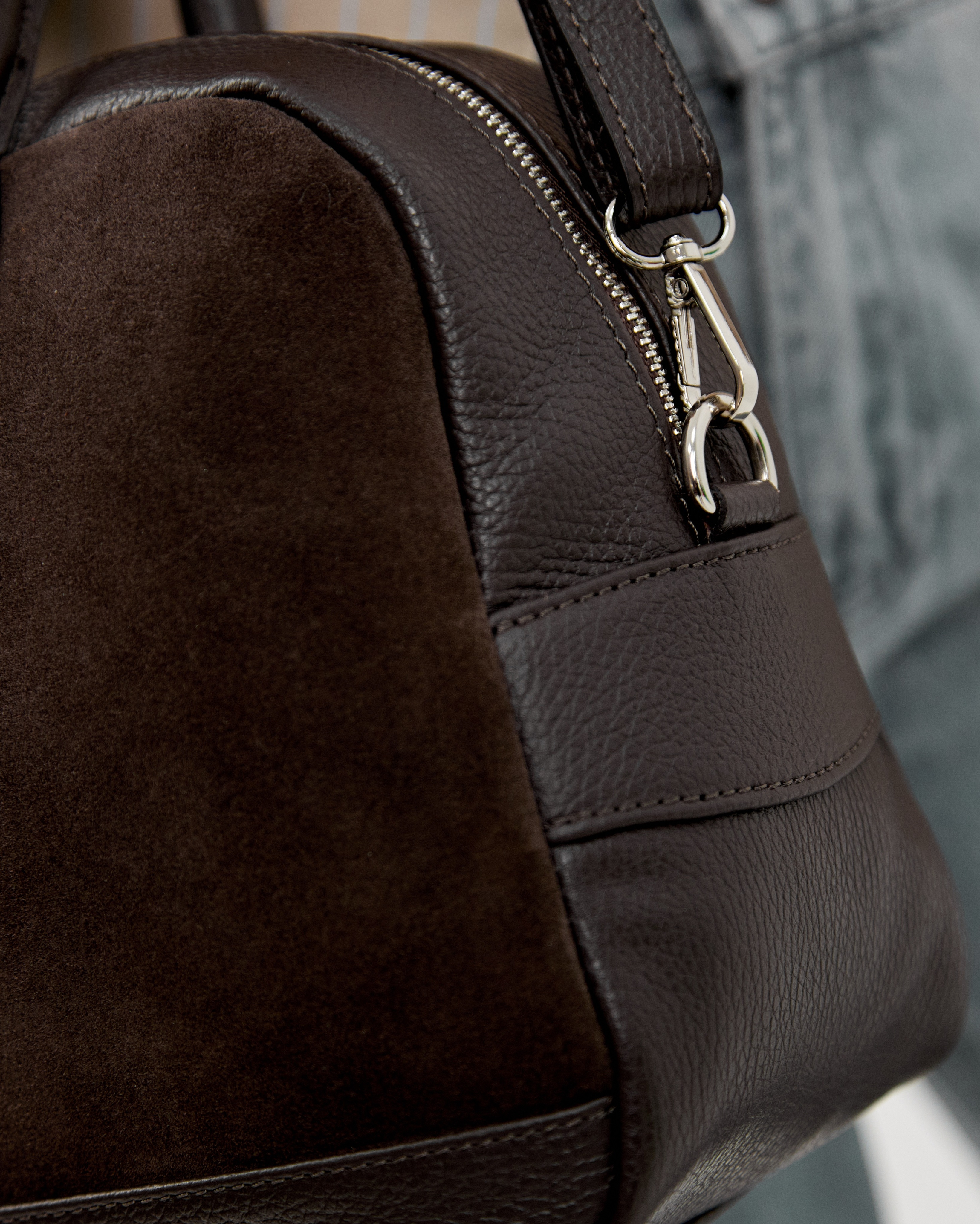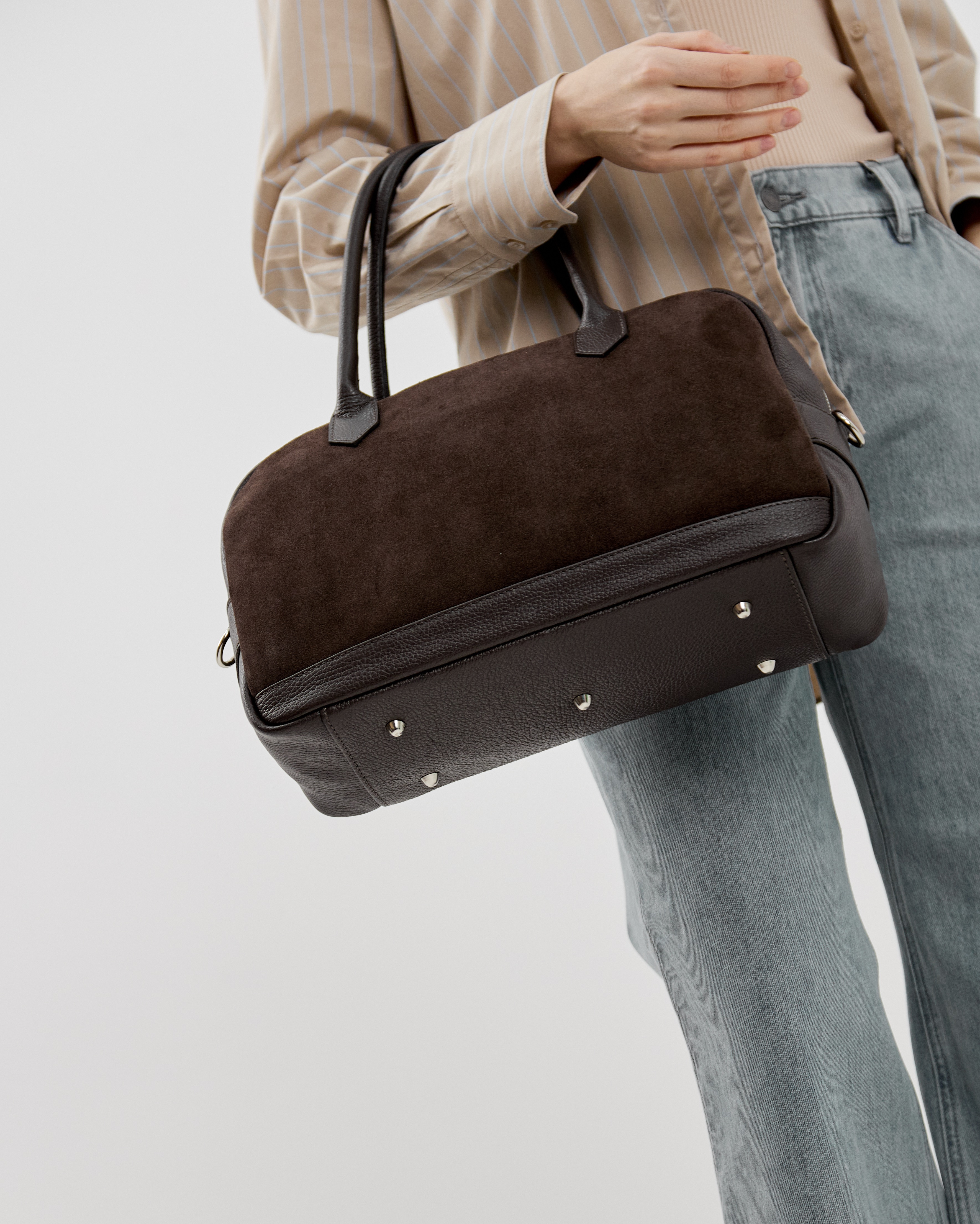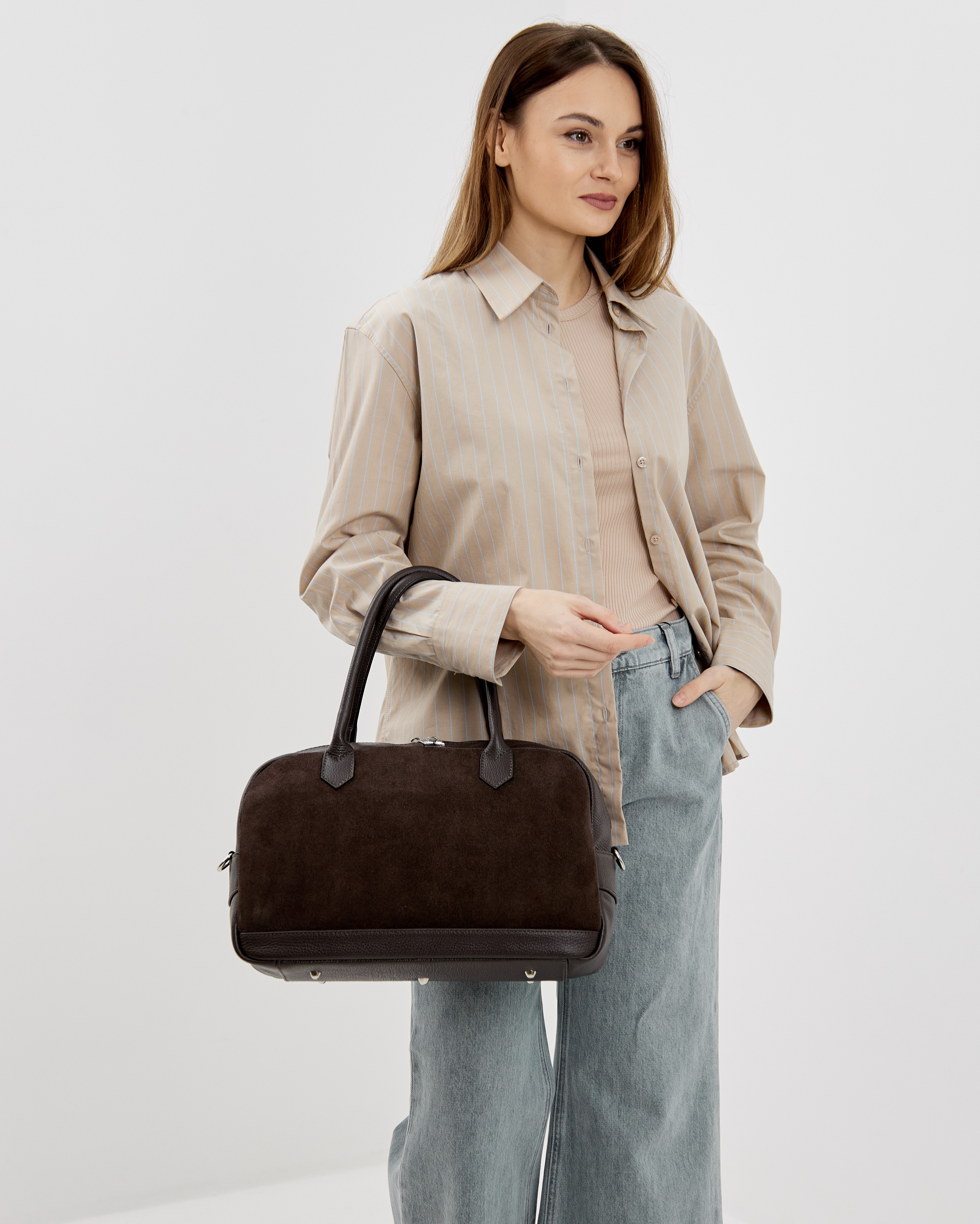 Сумка выполнена из натуральной замши с элементами зернистой кожи и декорирована фурнитурой серебряного цвета.