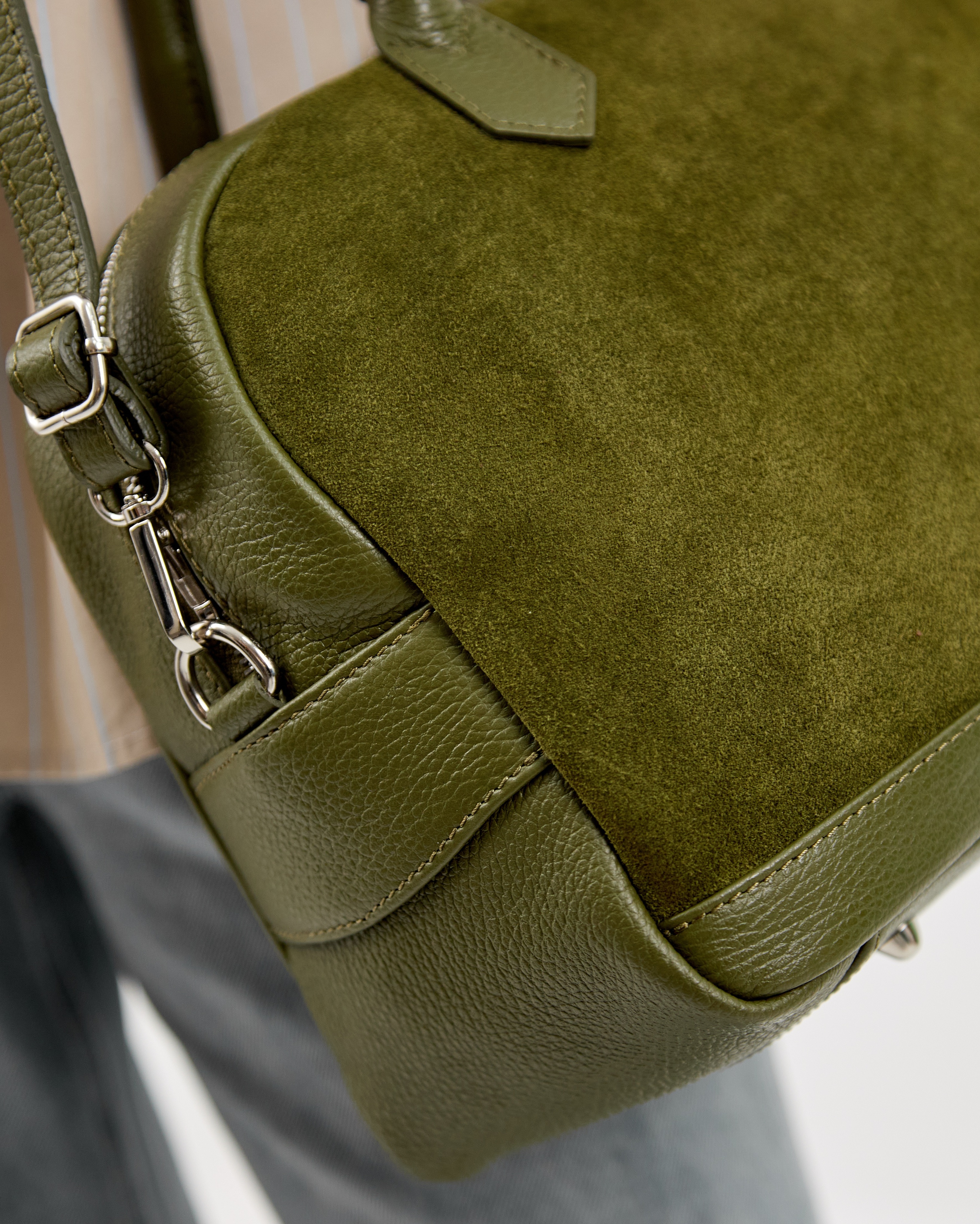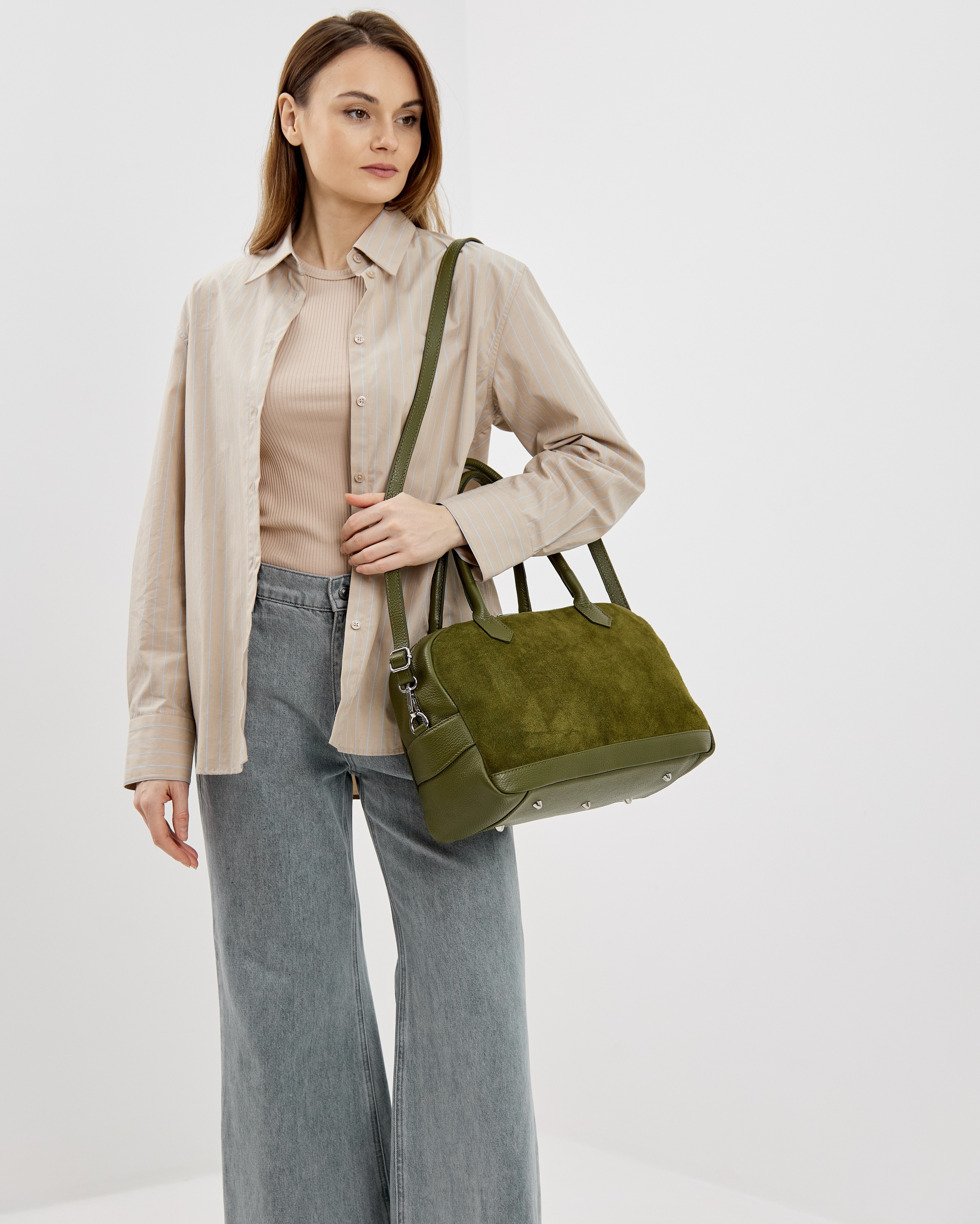 Сумка выполнена из натуральной замши с элементами зернистой кожи и декорирована фурнитурой серебряного цвета.