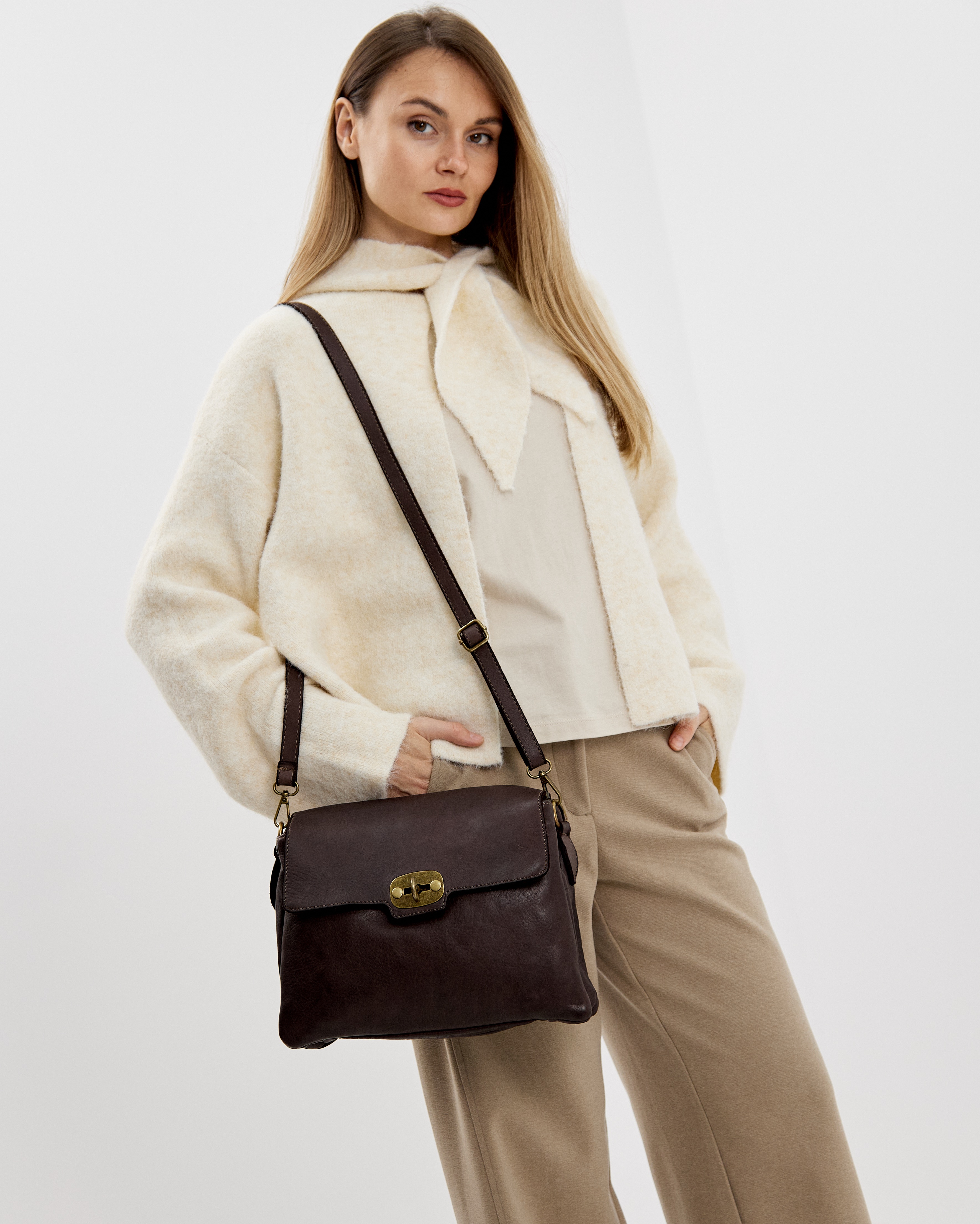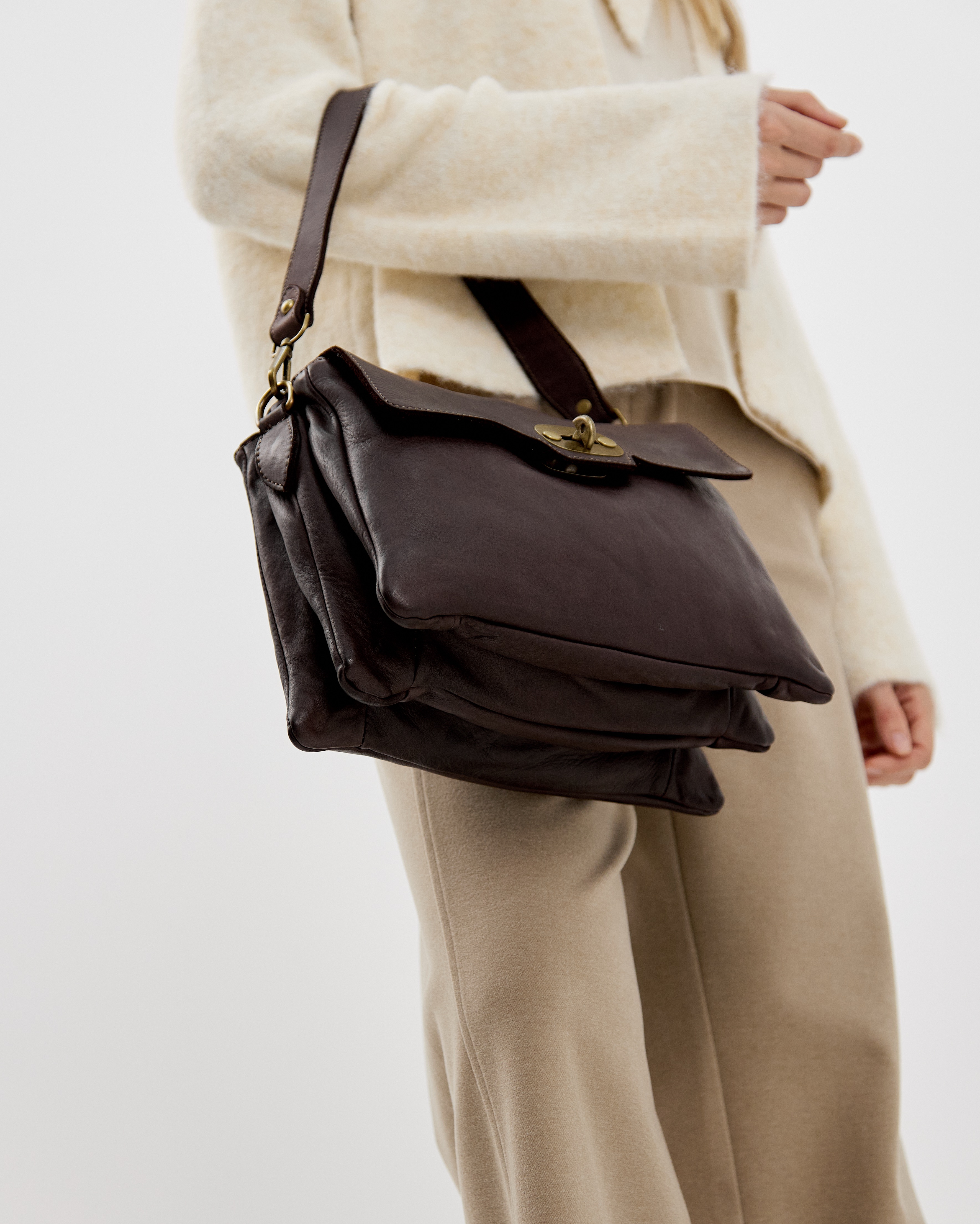 Сумку удобно носить как за короткую ручку в руке или на предплечье, так и с помощью длинного ремня, который входит в комплект. Закрывается надежно на поворотный механизм.