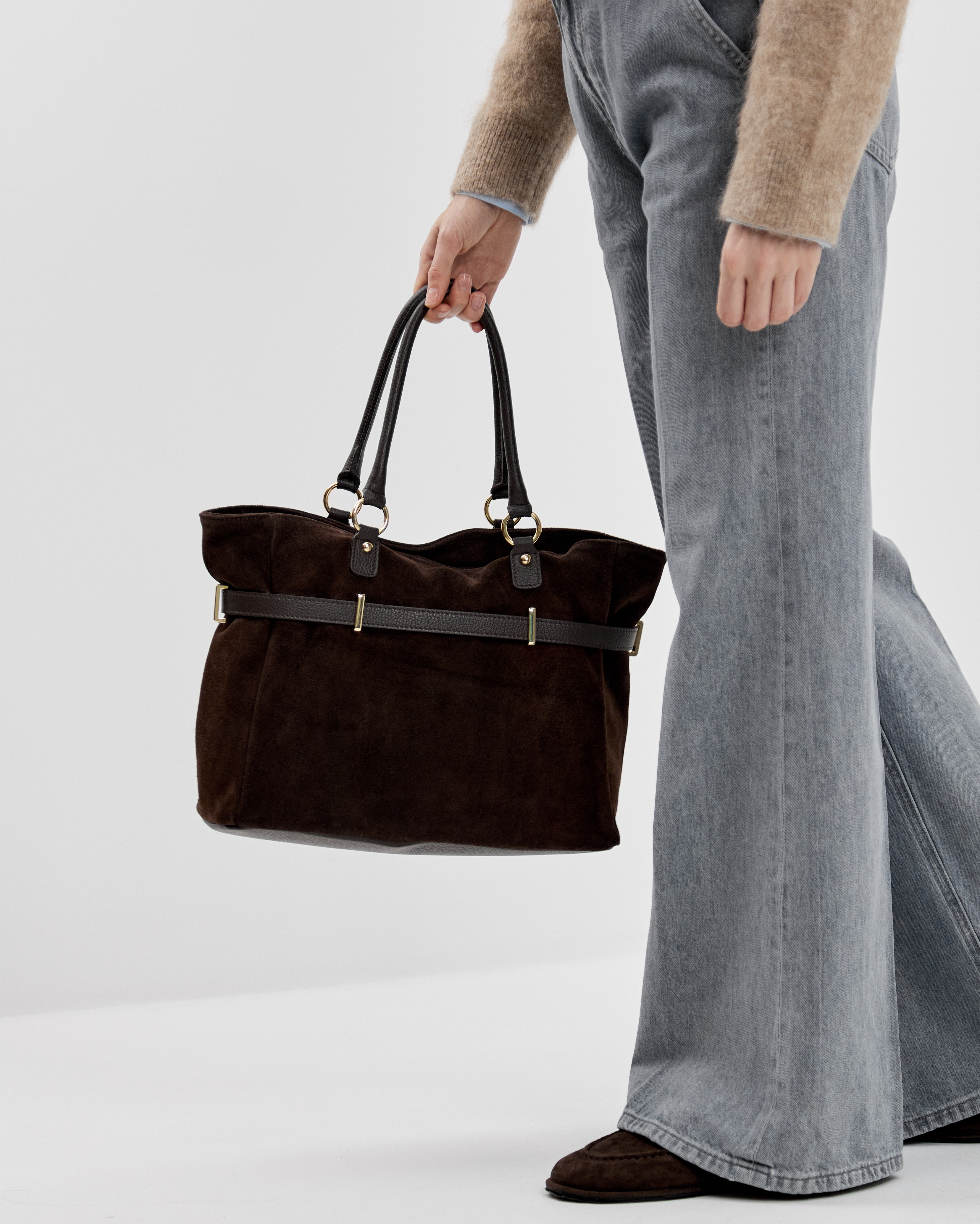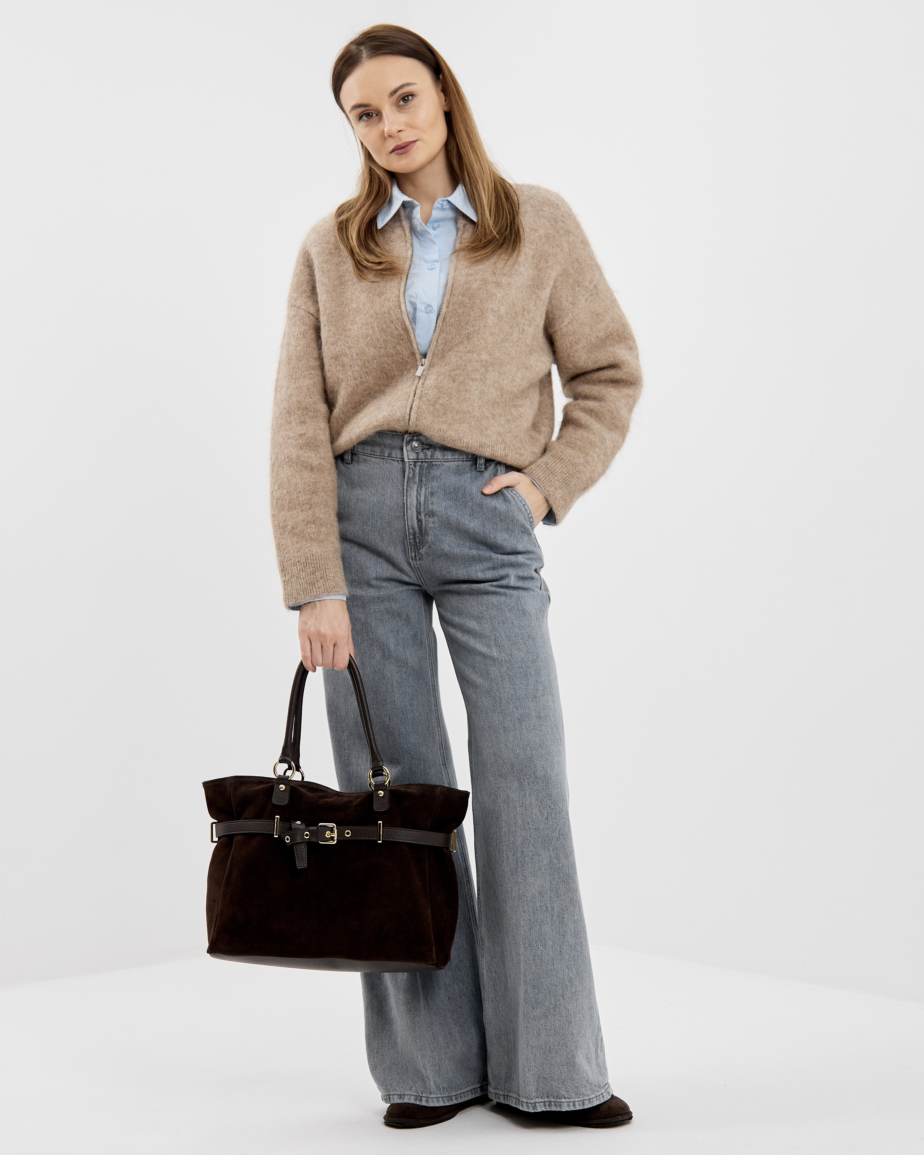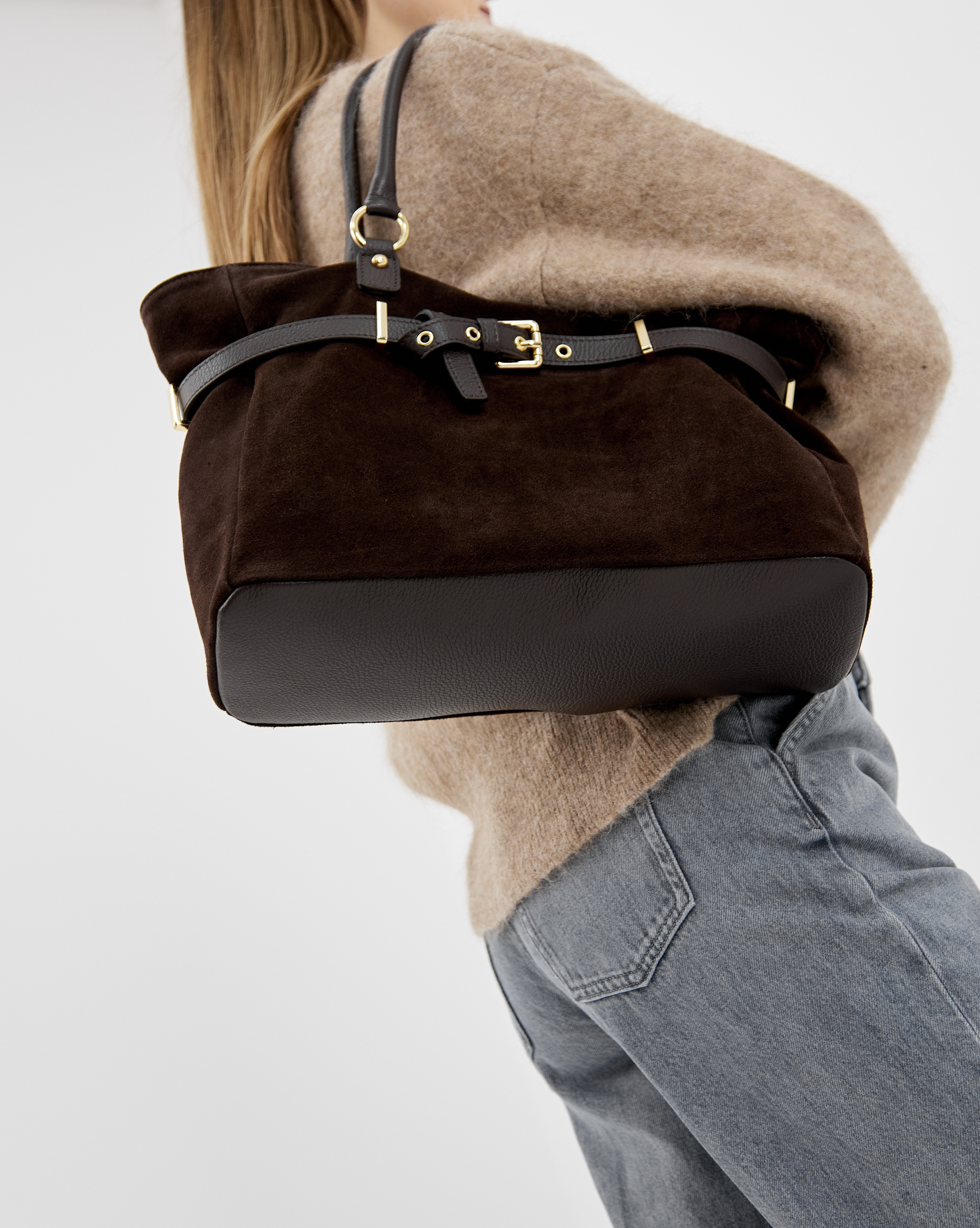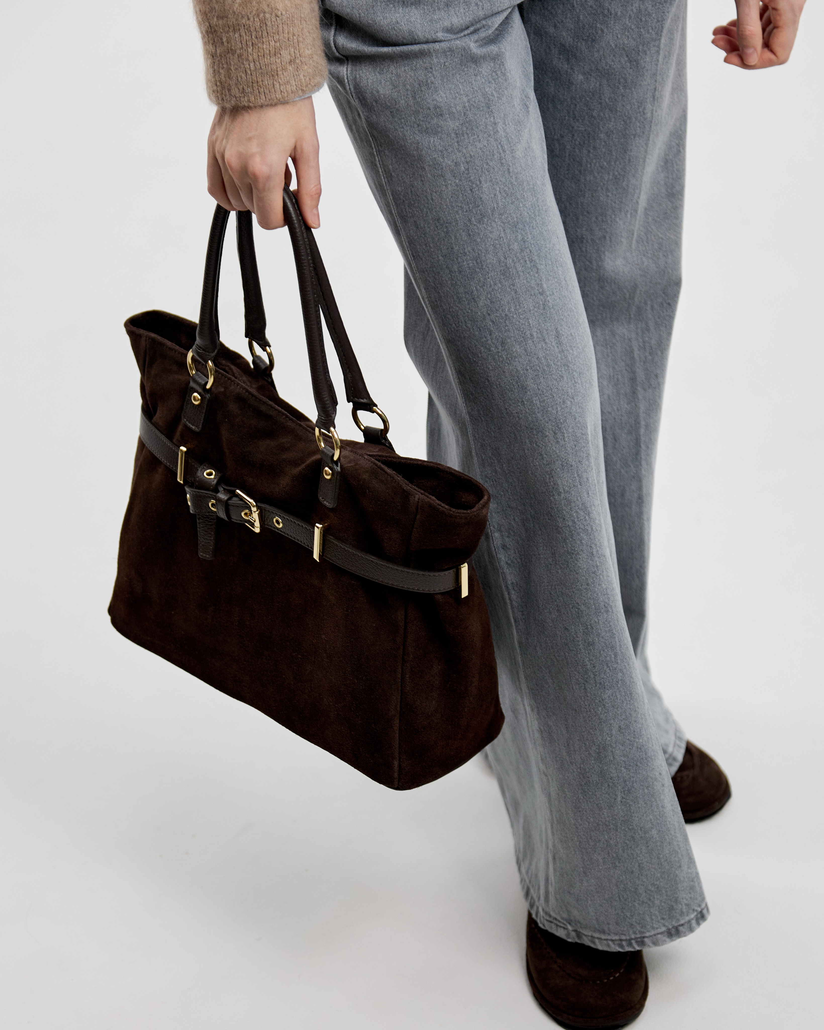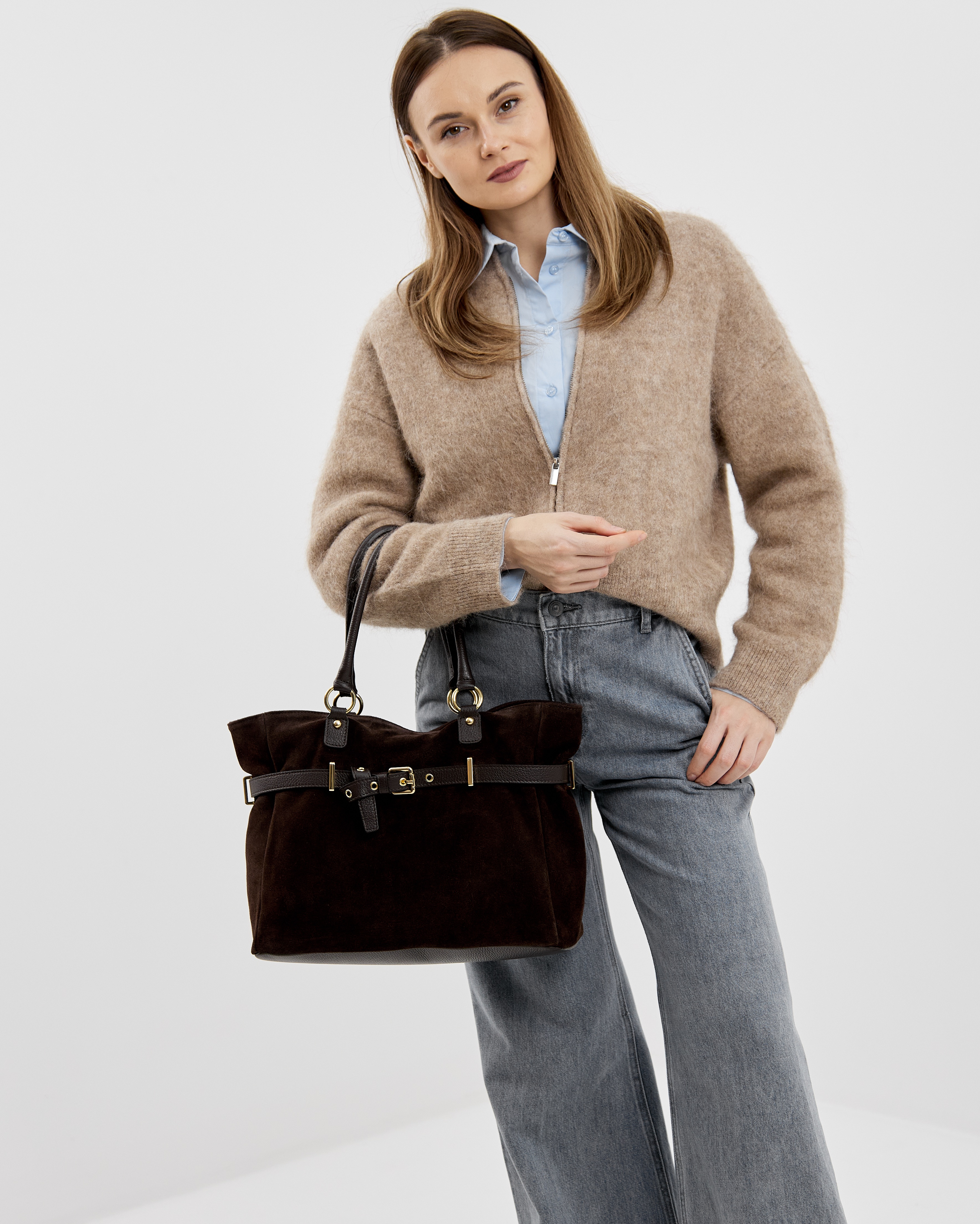 Сумка выполнена из натуральной замши и декорирована фурнитурой золотого цвета. Сумку удобно носить как за ручки в руке, так и на плече с помощью регулируемого ремня. Закрывается надежно на молнию.