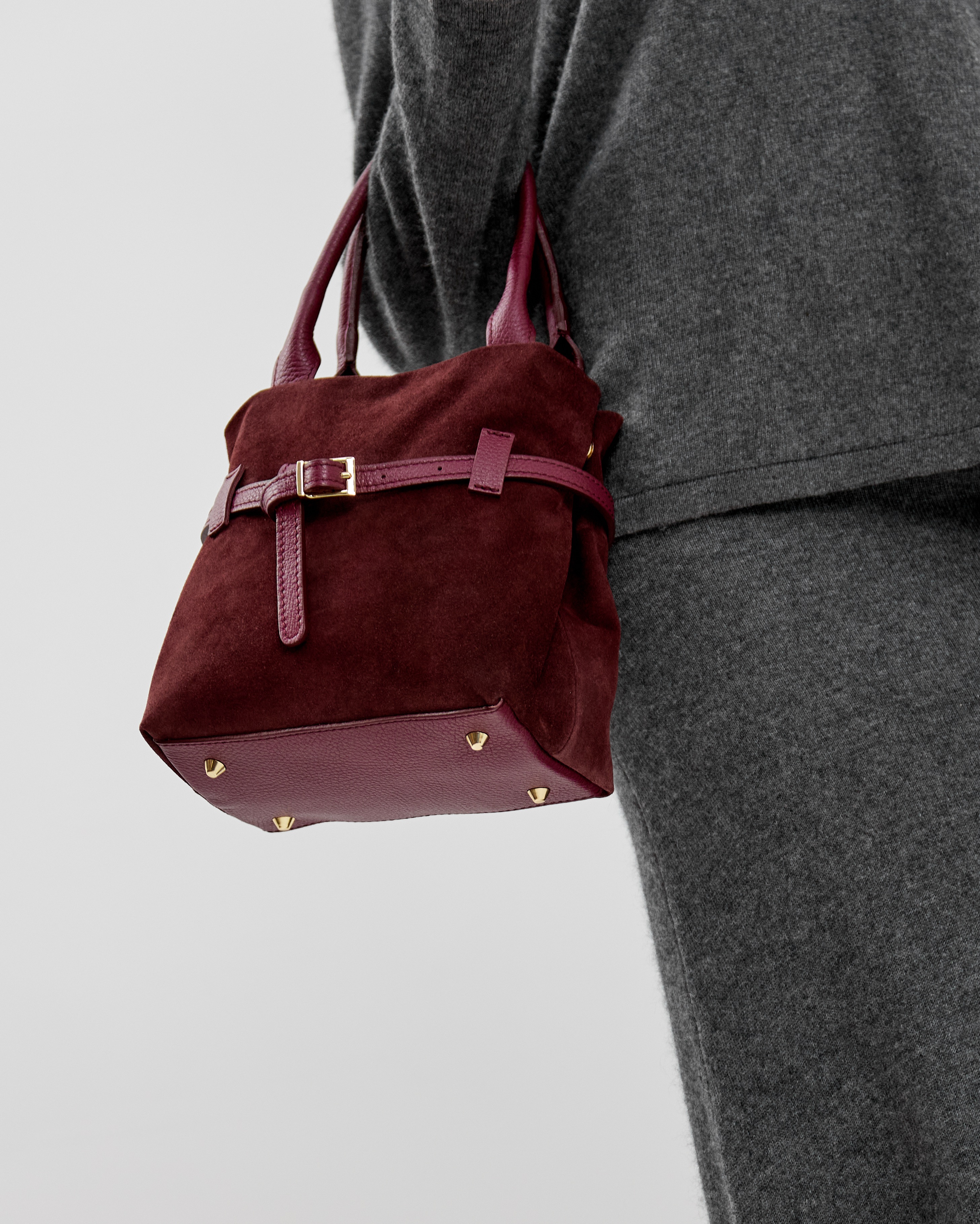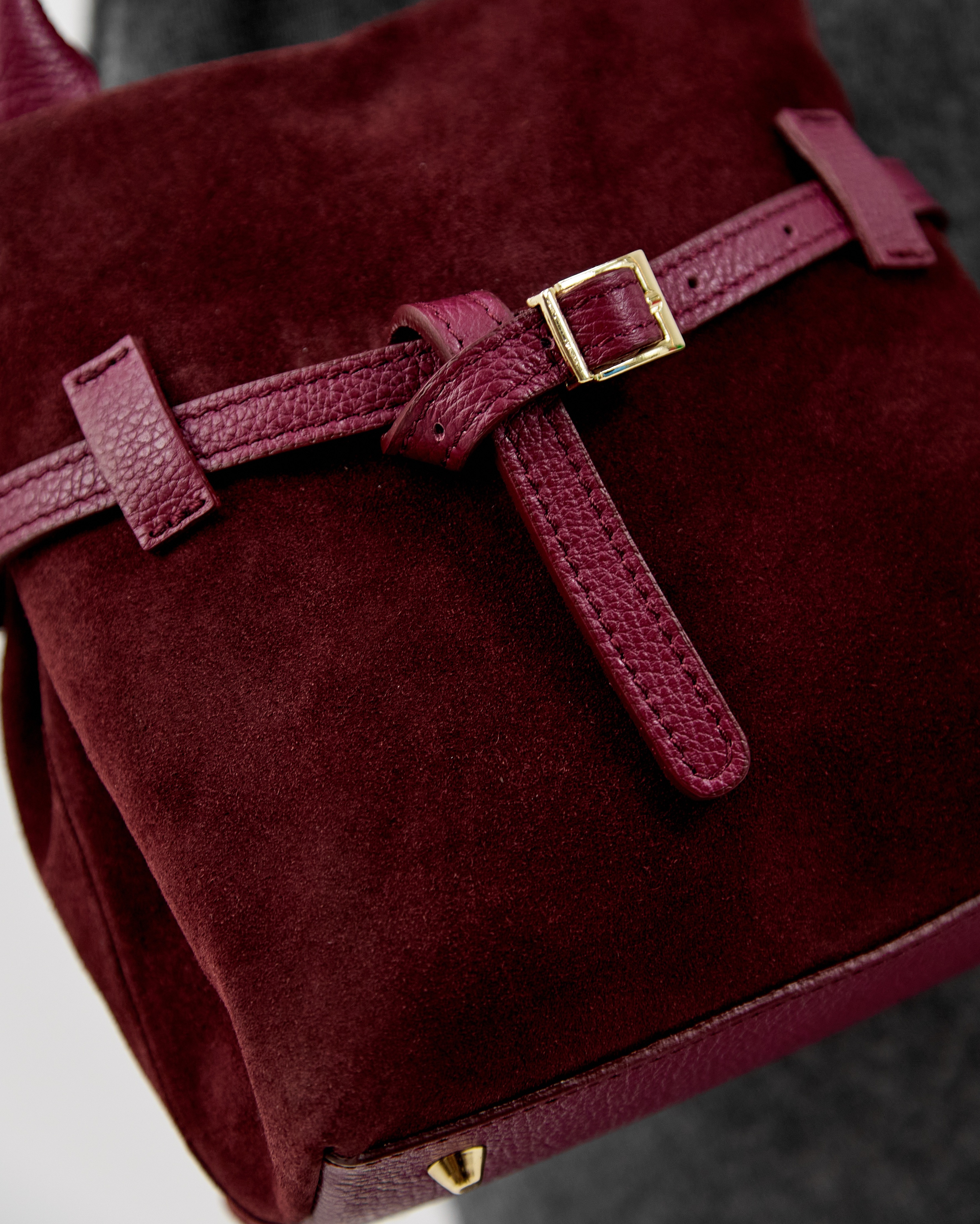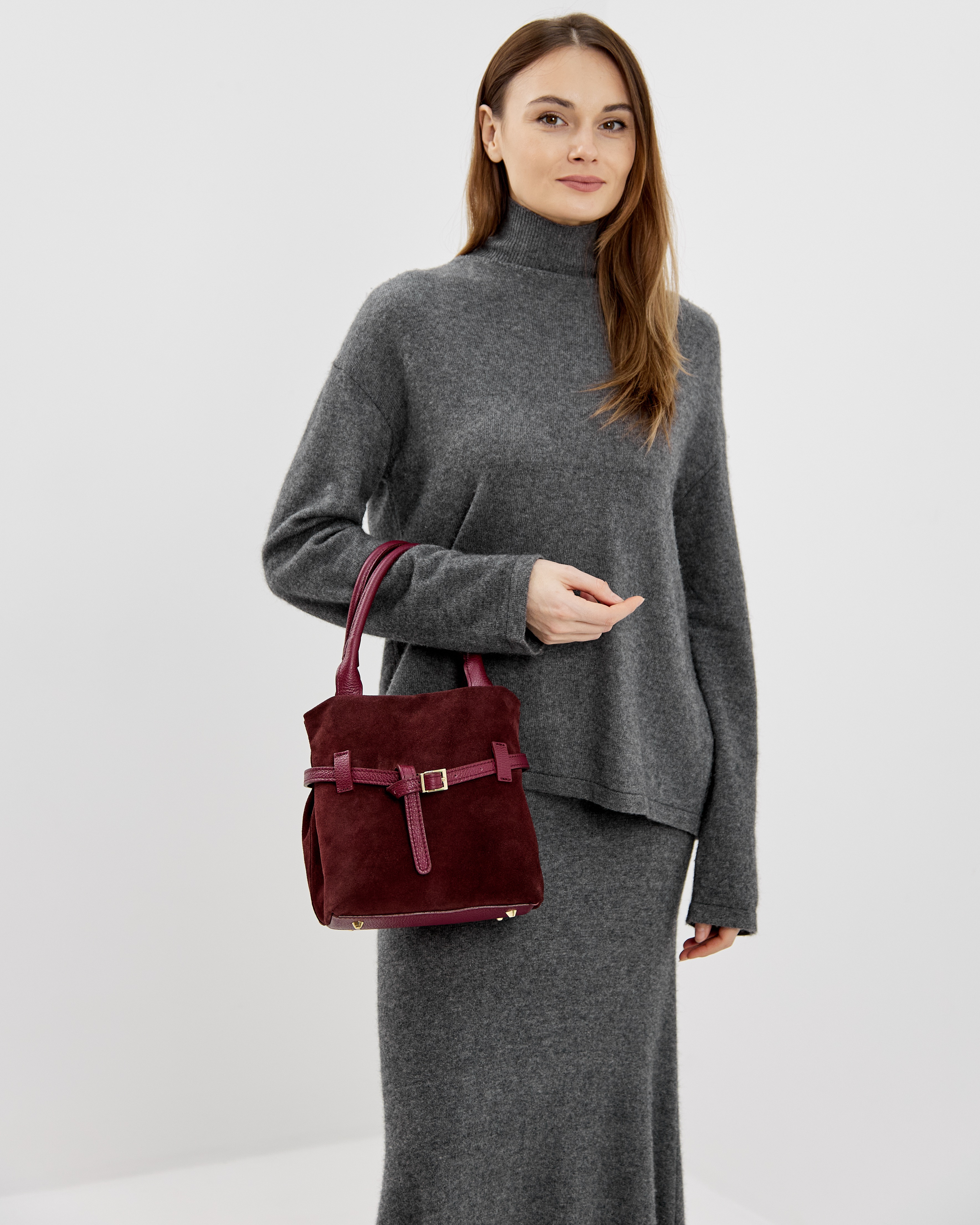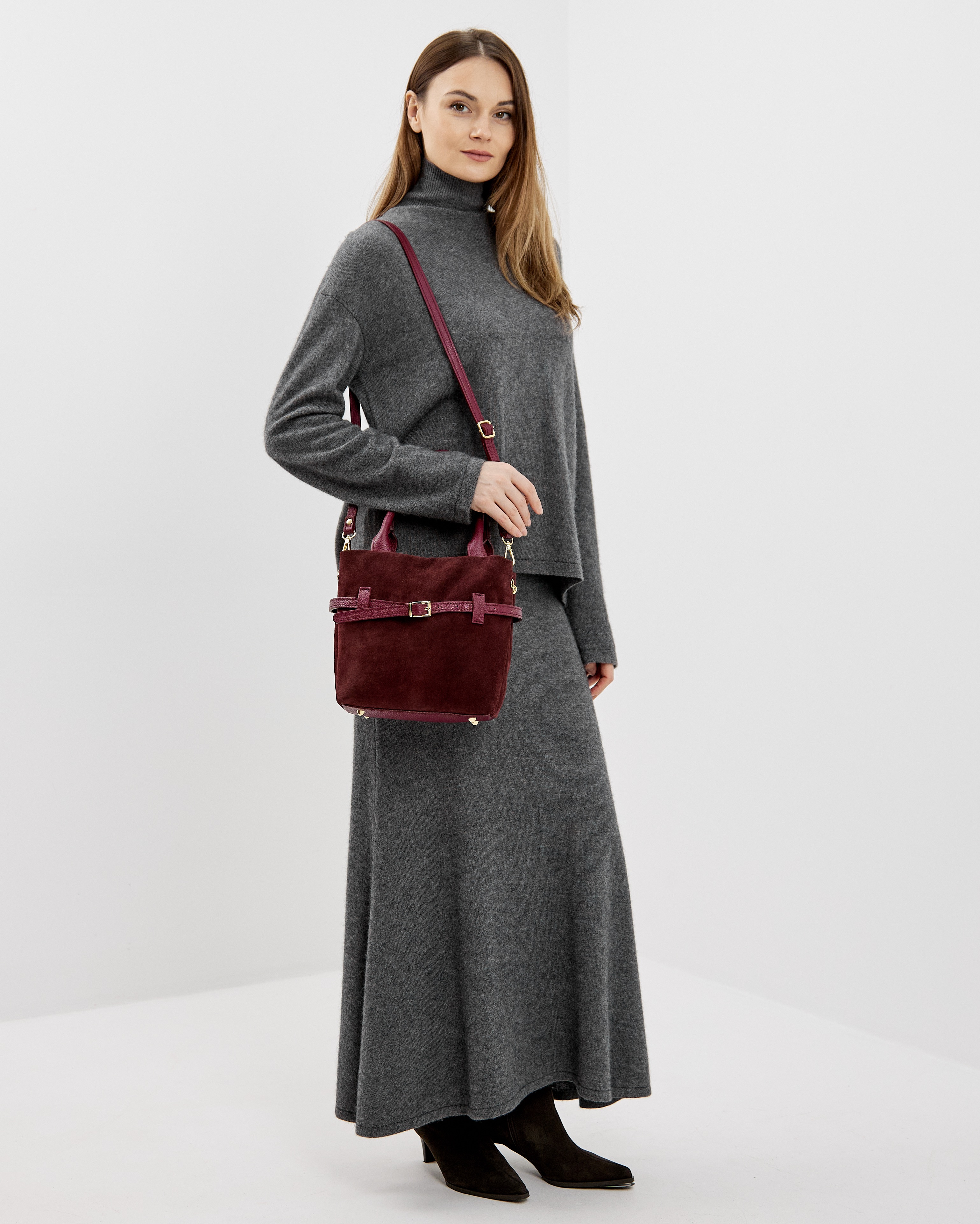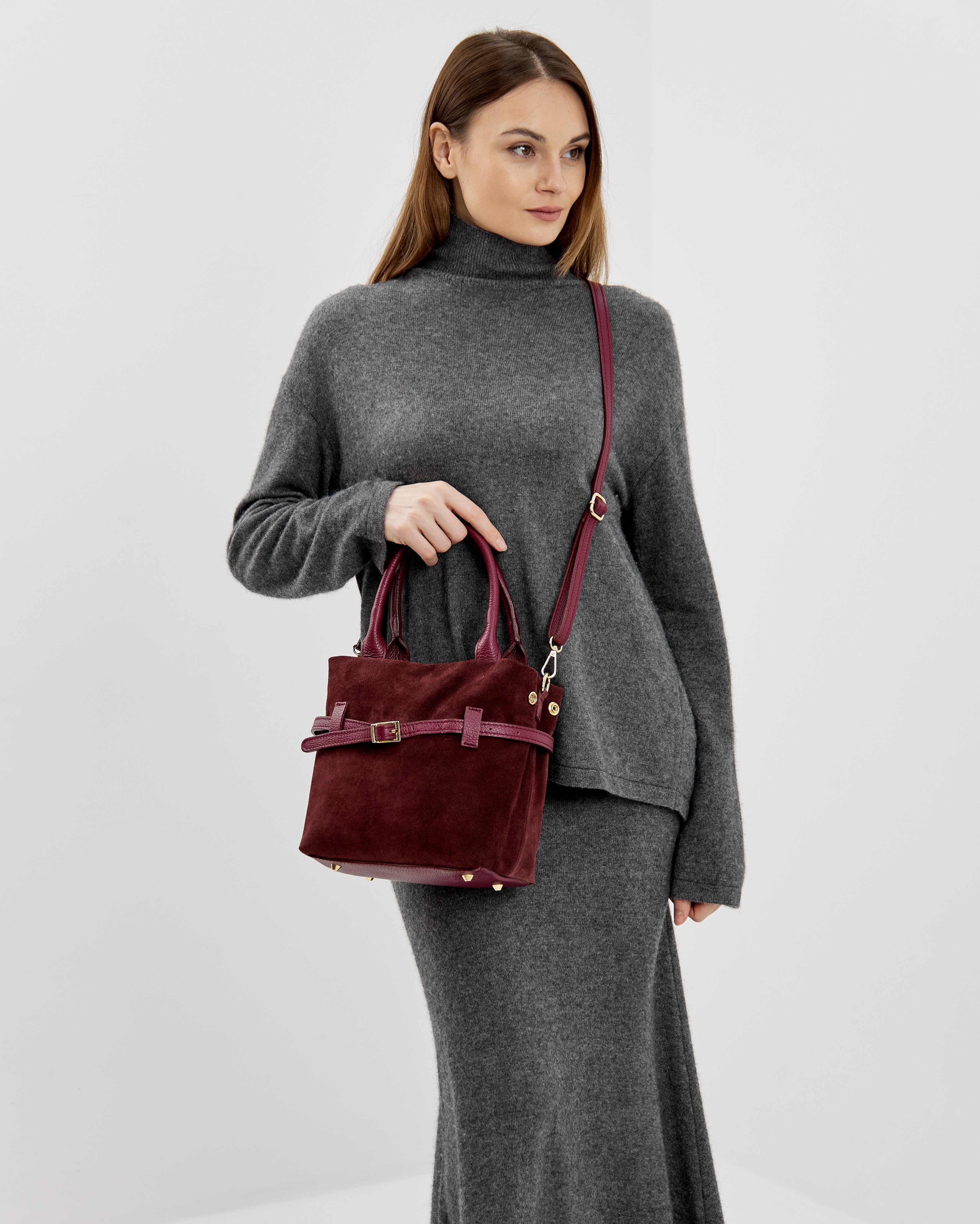 Сумка выполнена из натуральной замши и декорирована фурнитурой золотого цвета.