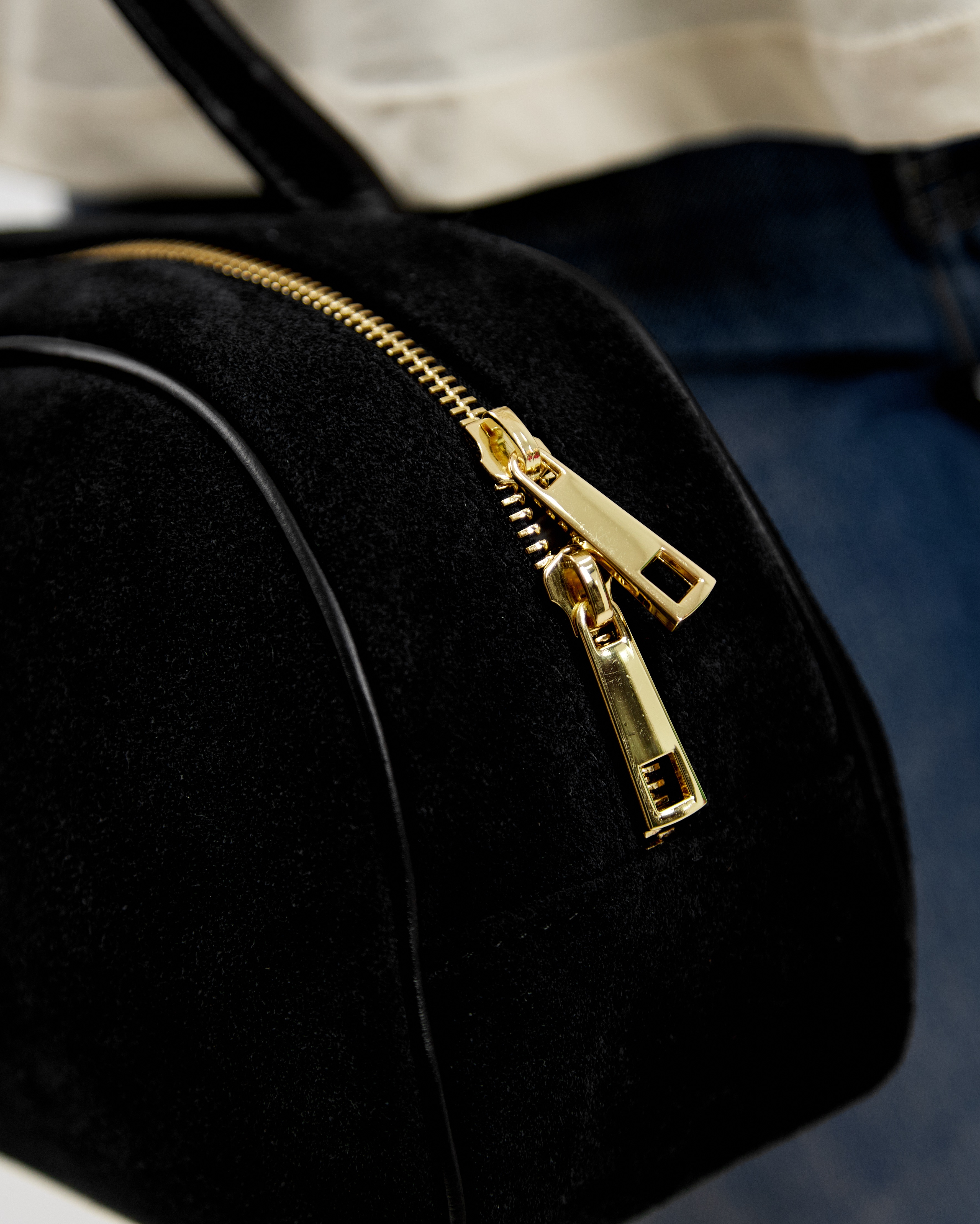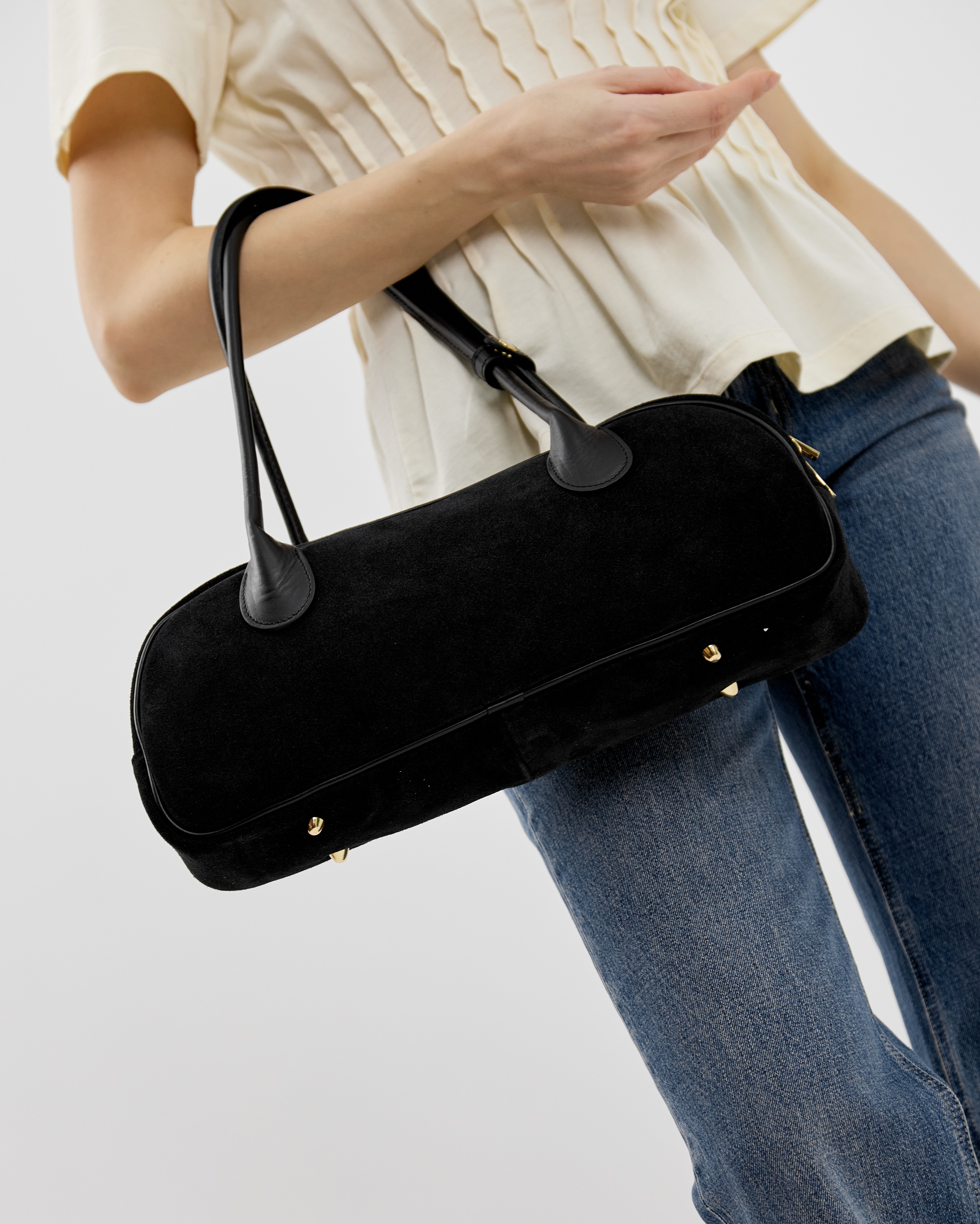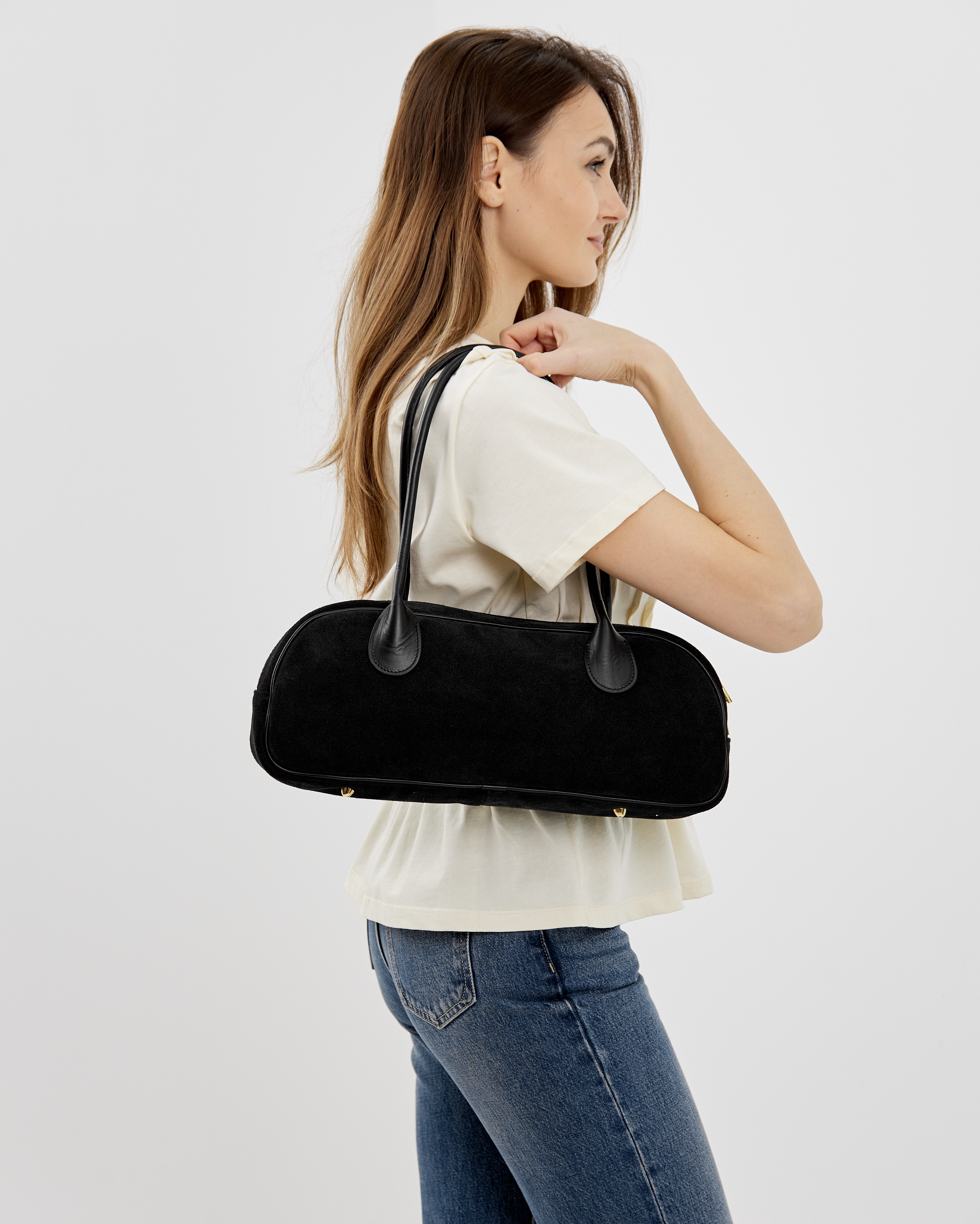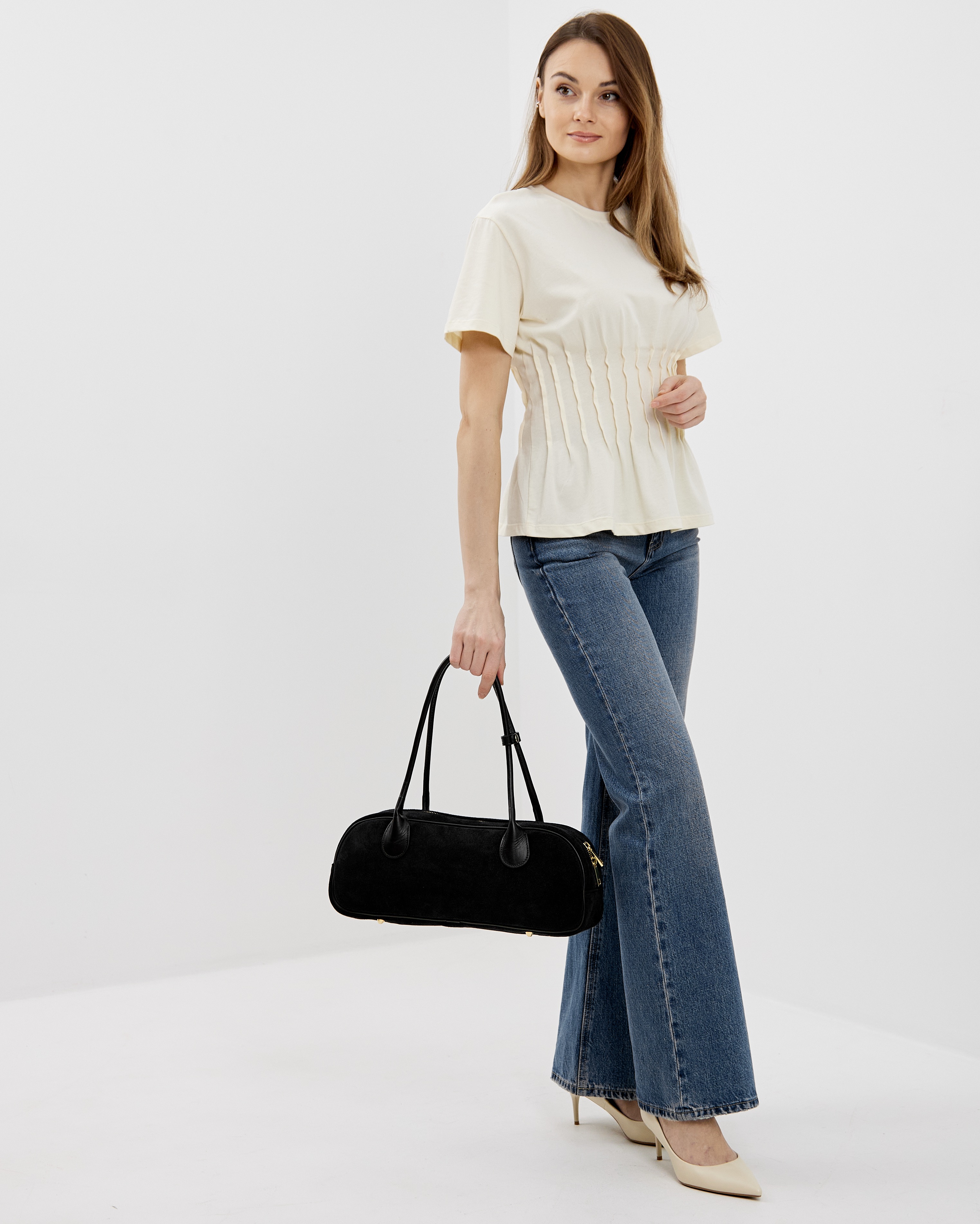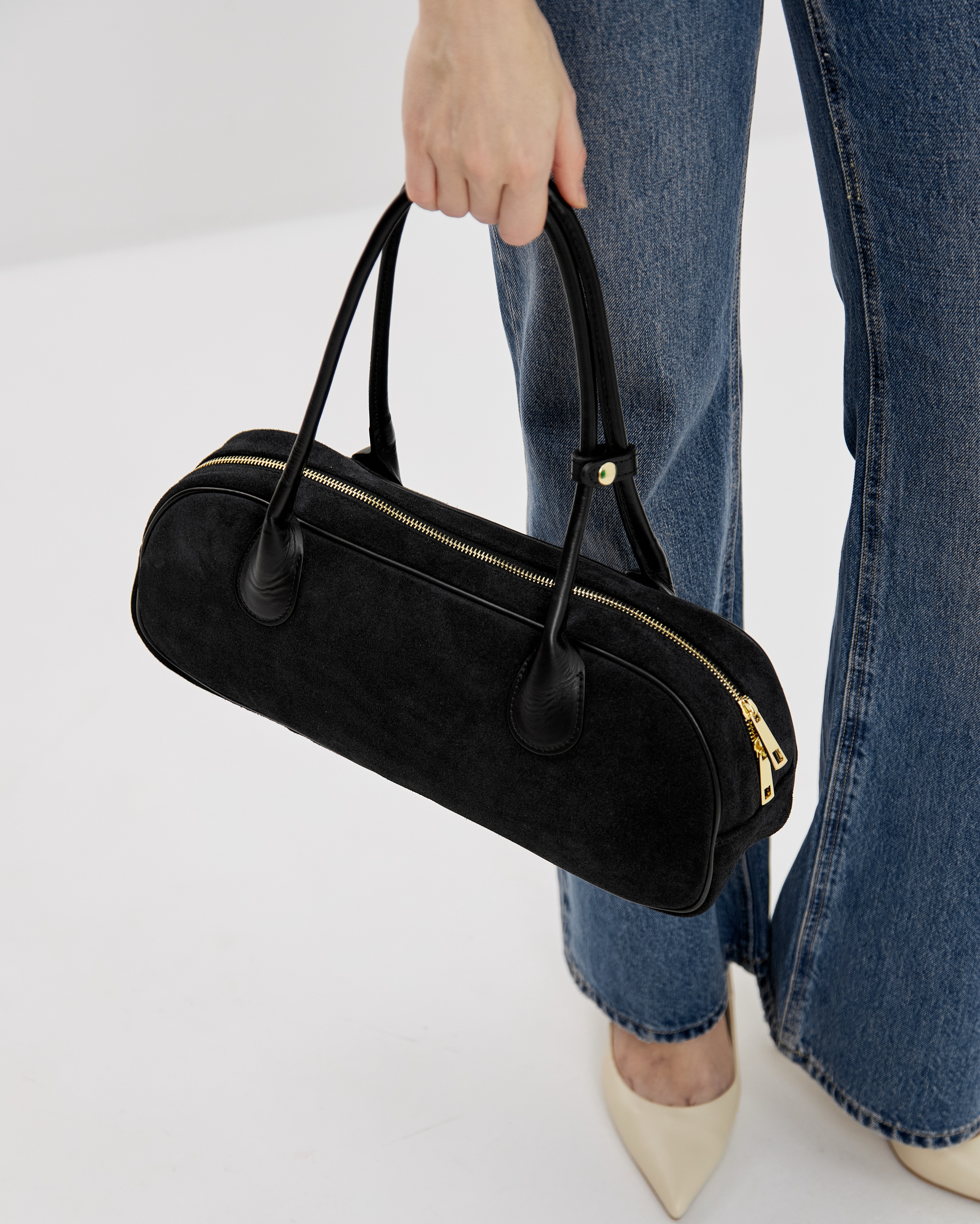 Сумка выполнена из натуральной замши и декорирована фурнитурой золотого цвета. У сумки удобные ручки, с помощью которых можно носить сумку на плече или в руке. Закрывается надежно на молнию.