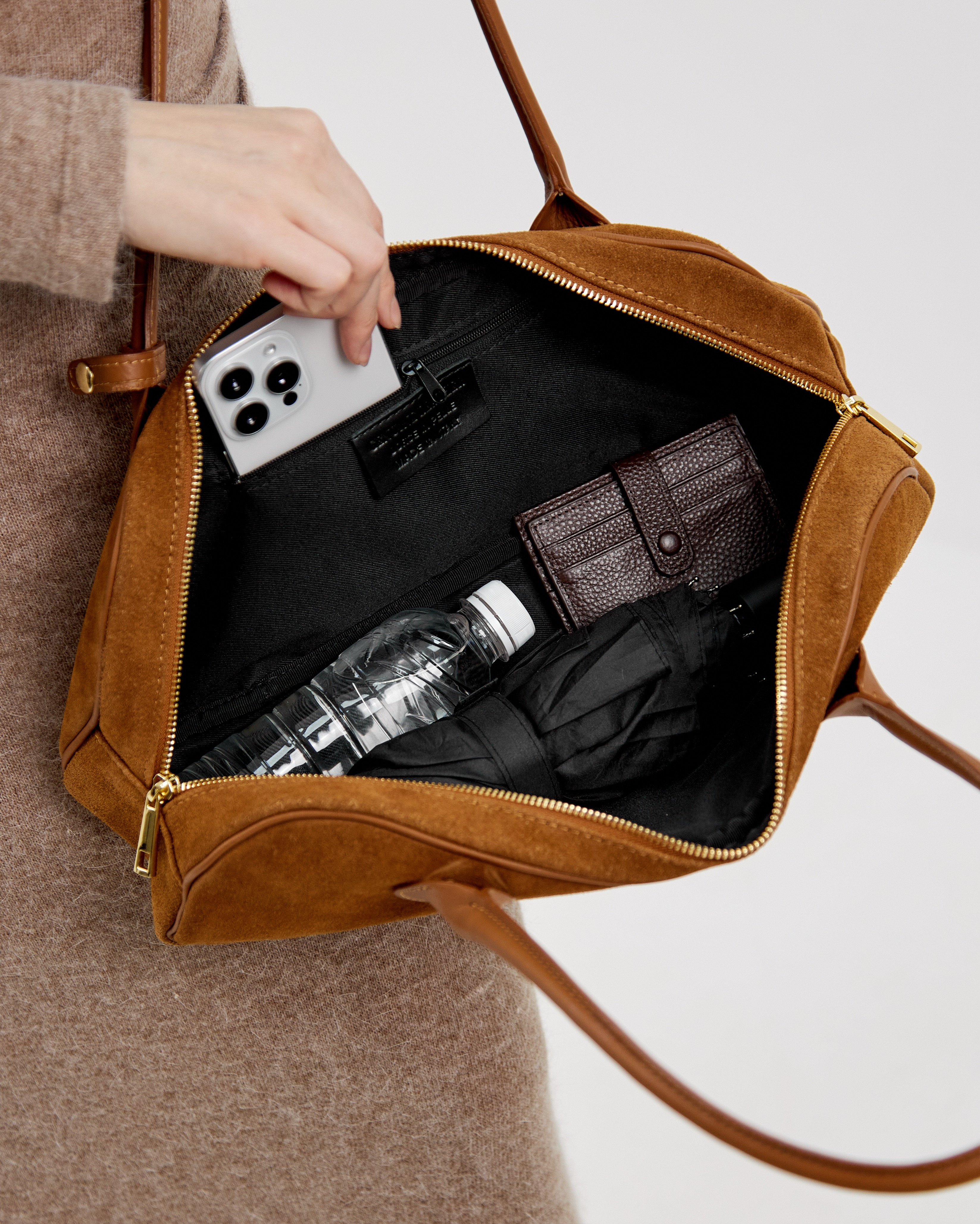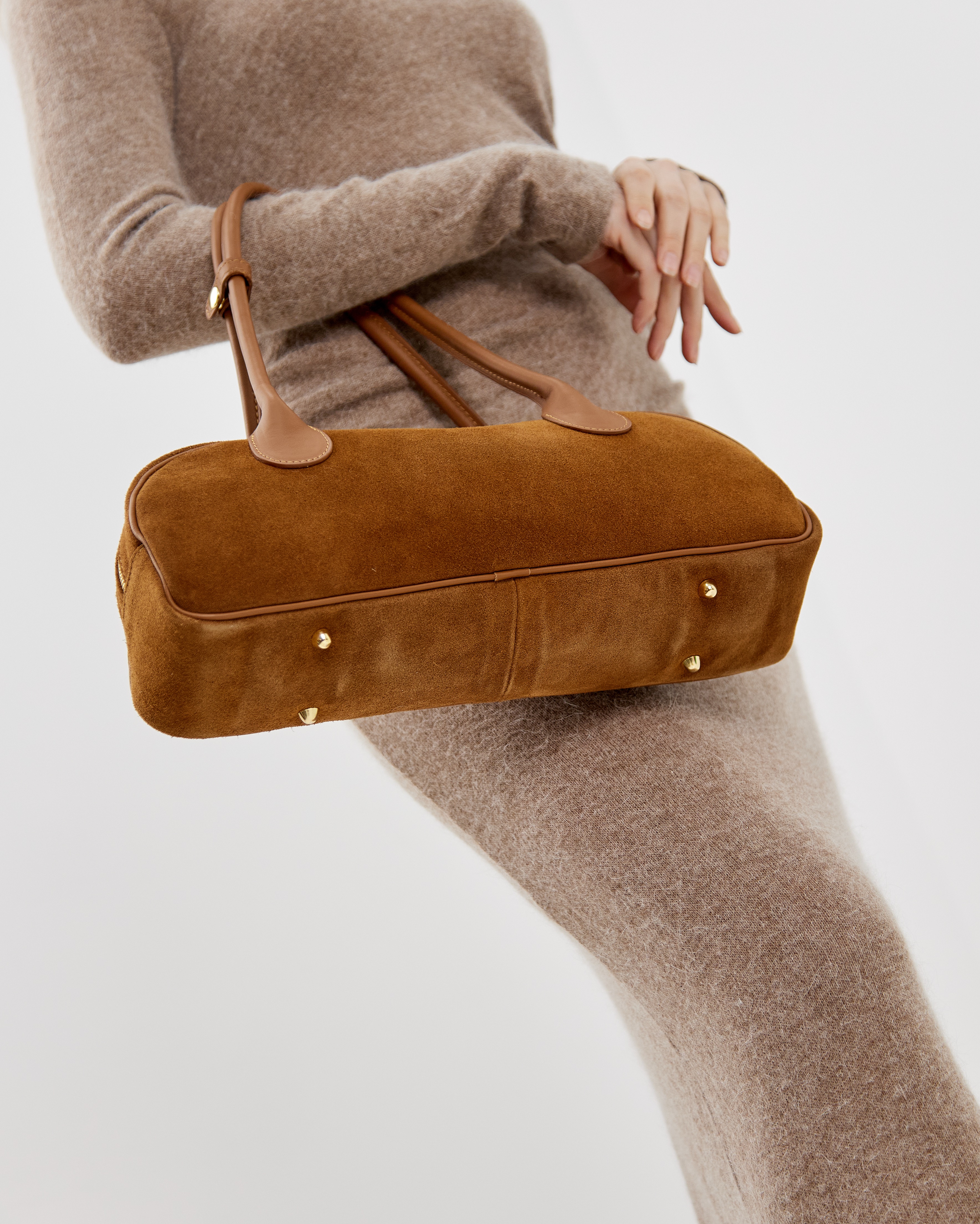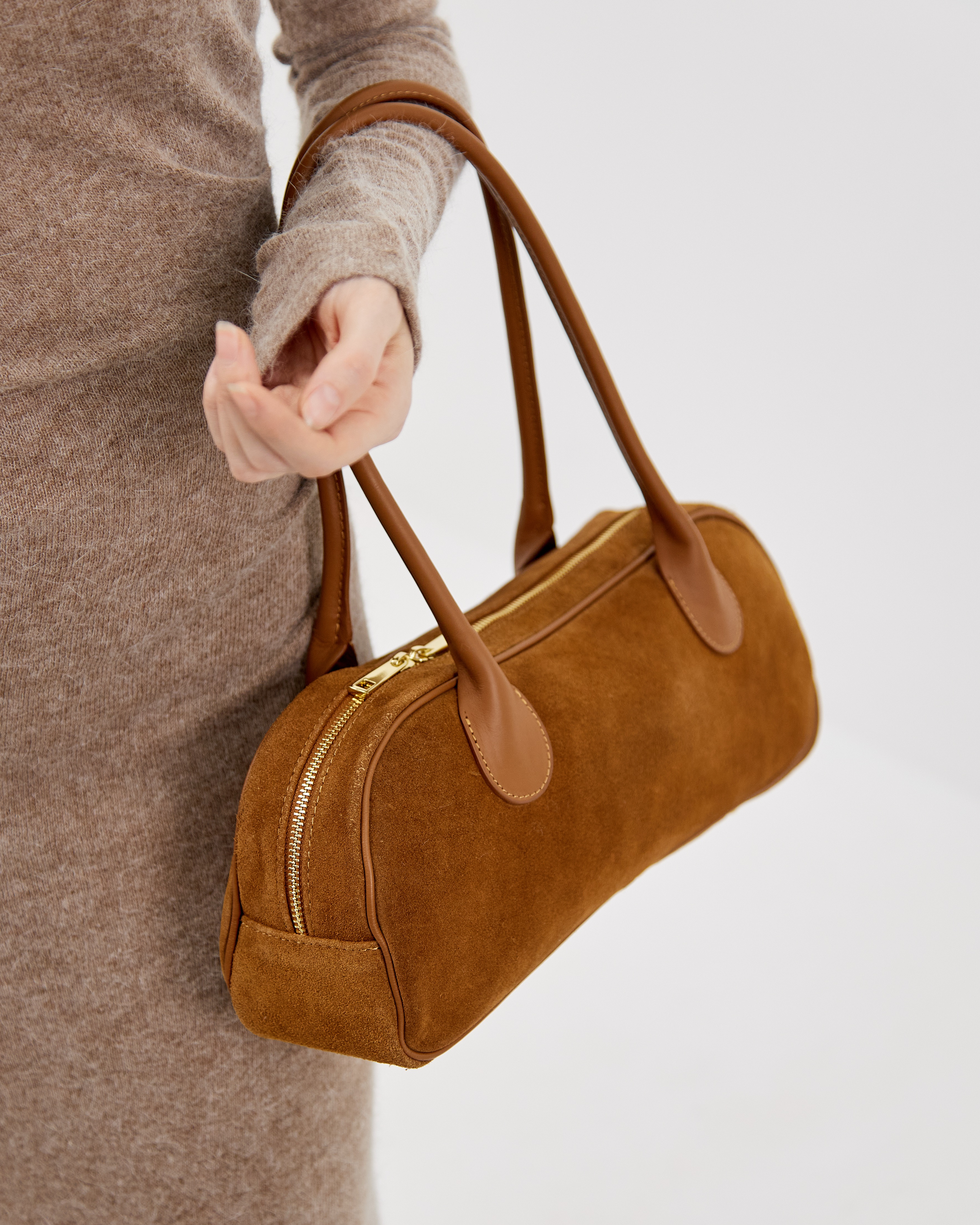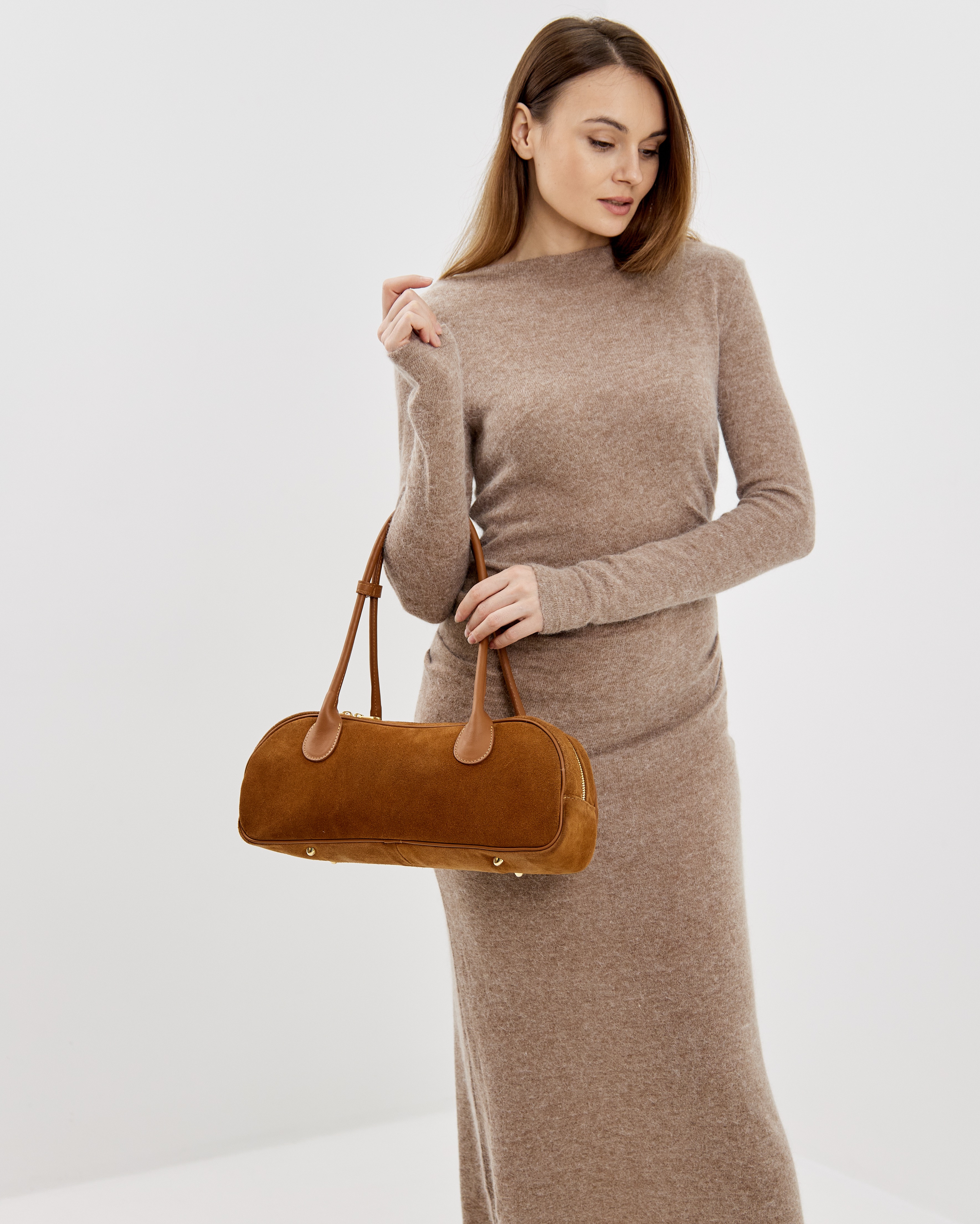 Сумка выполнена из натуральной замши и декорирована фурнитурой золотого цвета. У сумки удобные ручки, с помощью которых можно носить сумку на плече или в руке. Закрывается надежно на молнию.
