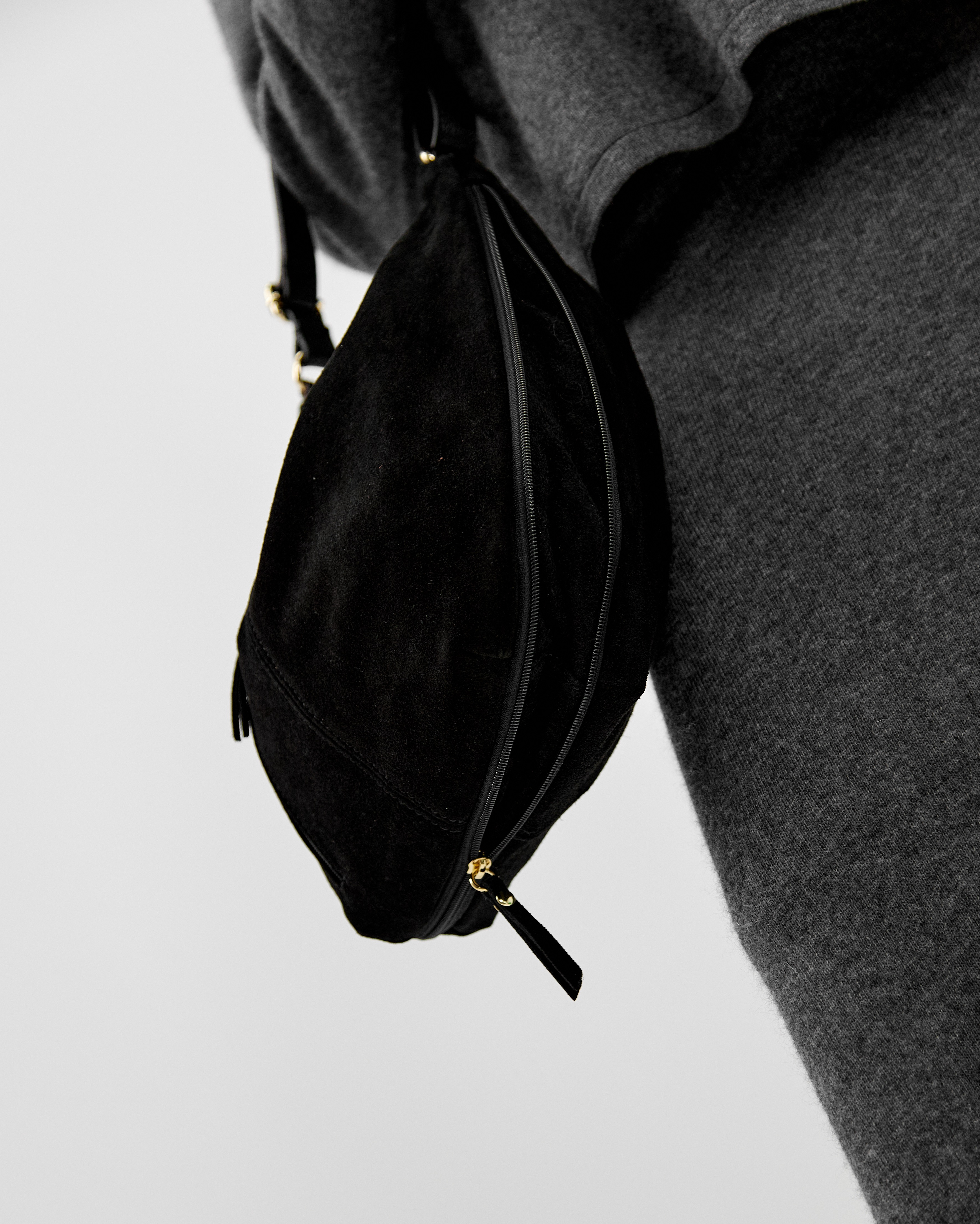 Сумка выполнена из натуральной замши и декорирована фурнитурой золотого цвета.