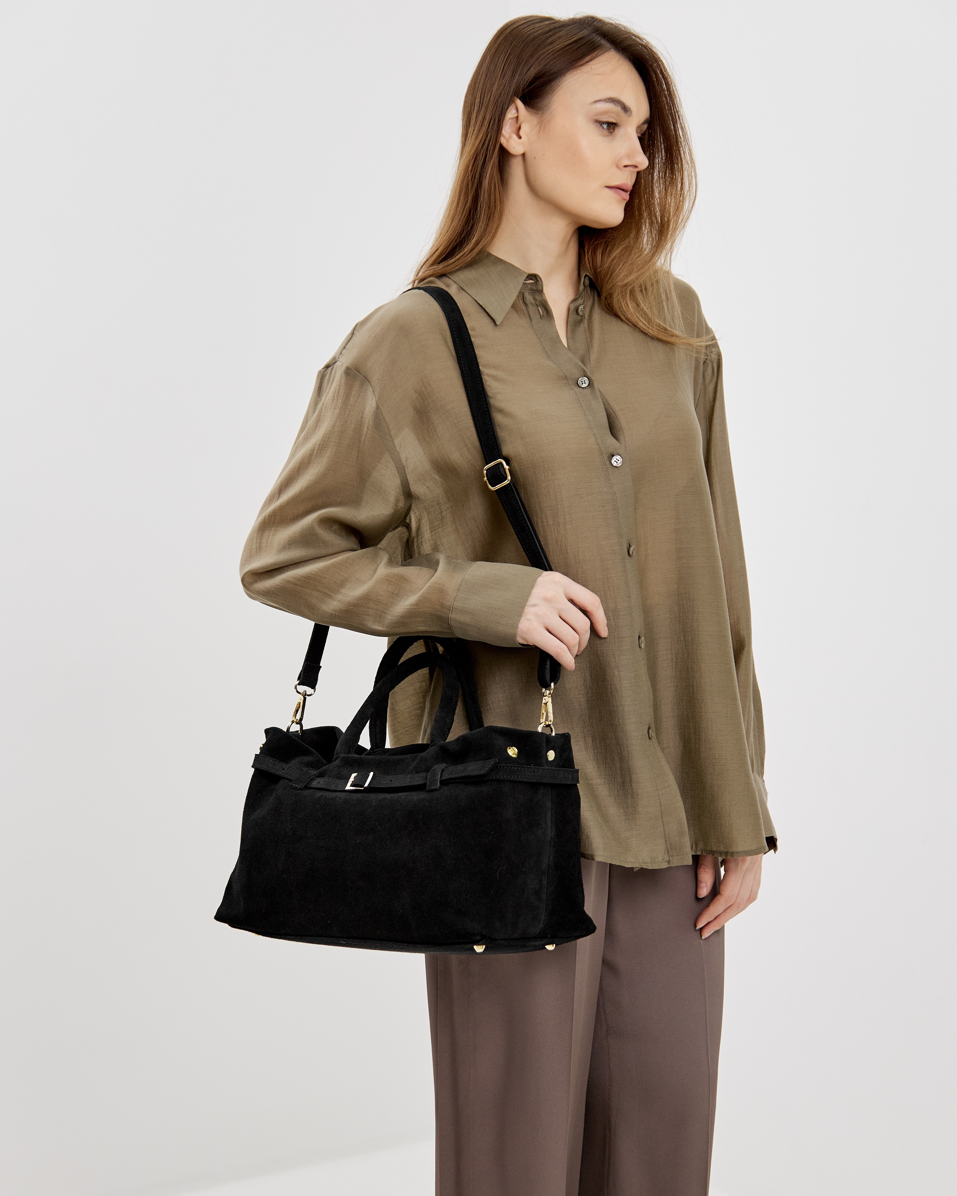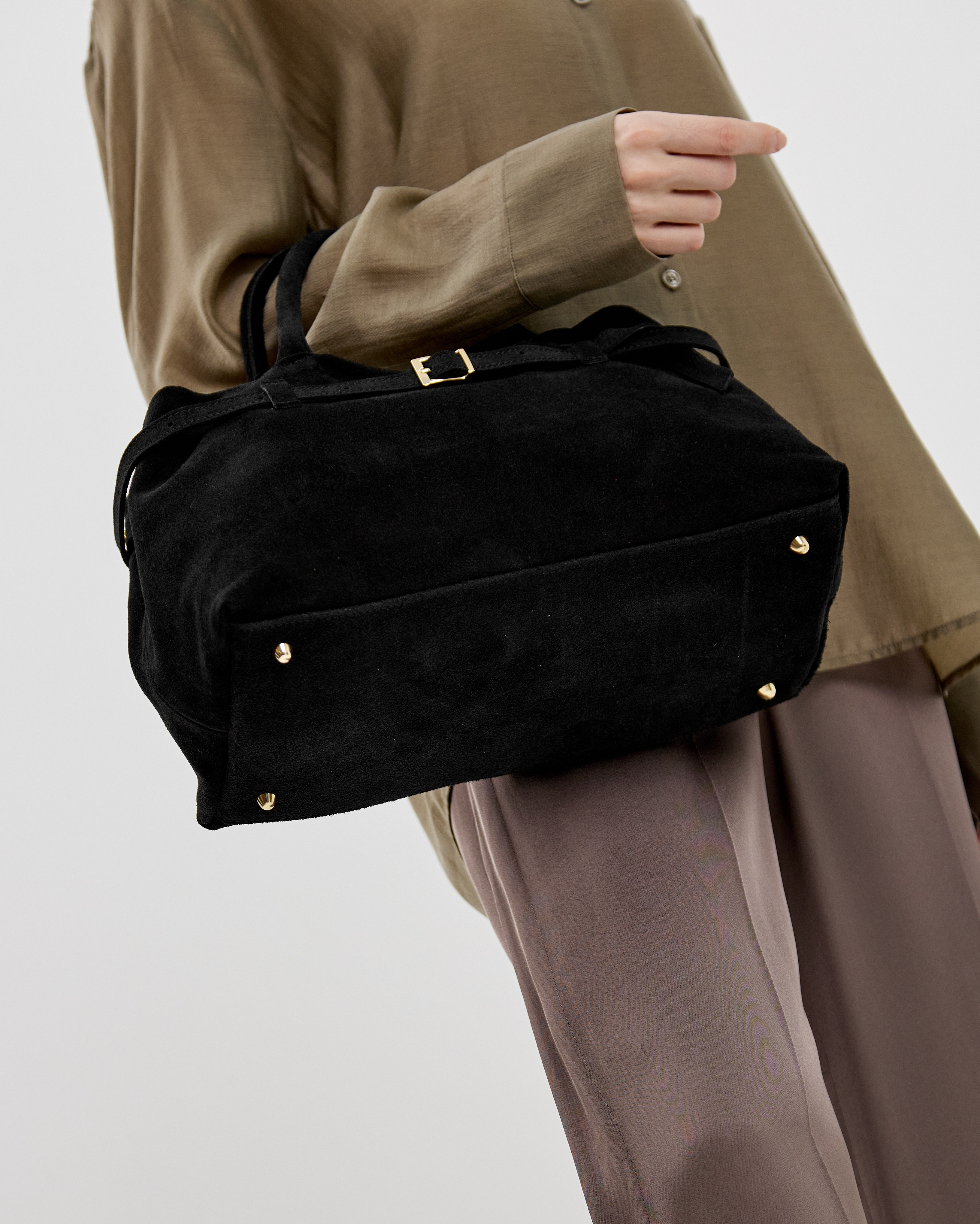 Сумка выполнена из натуральной замши и декорирована фурнитурой золотого цвета.