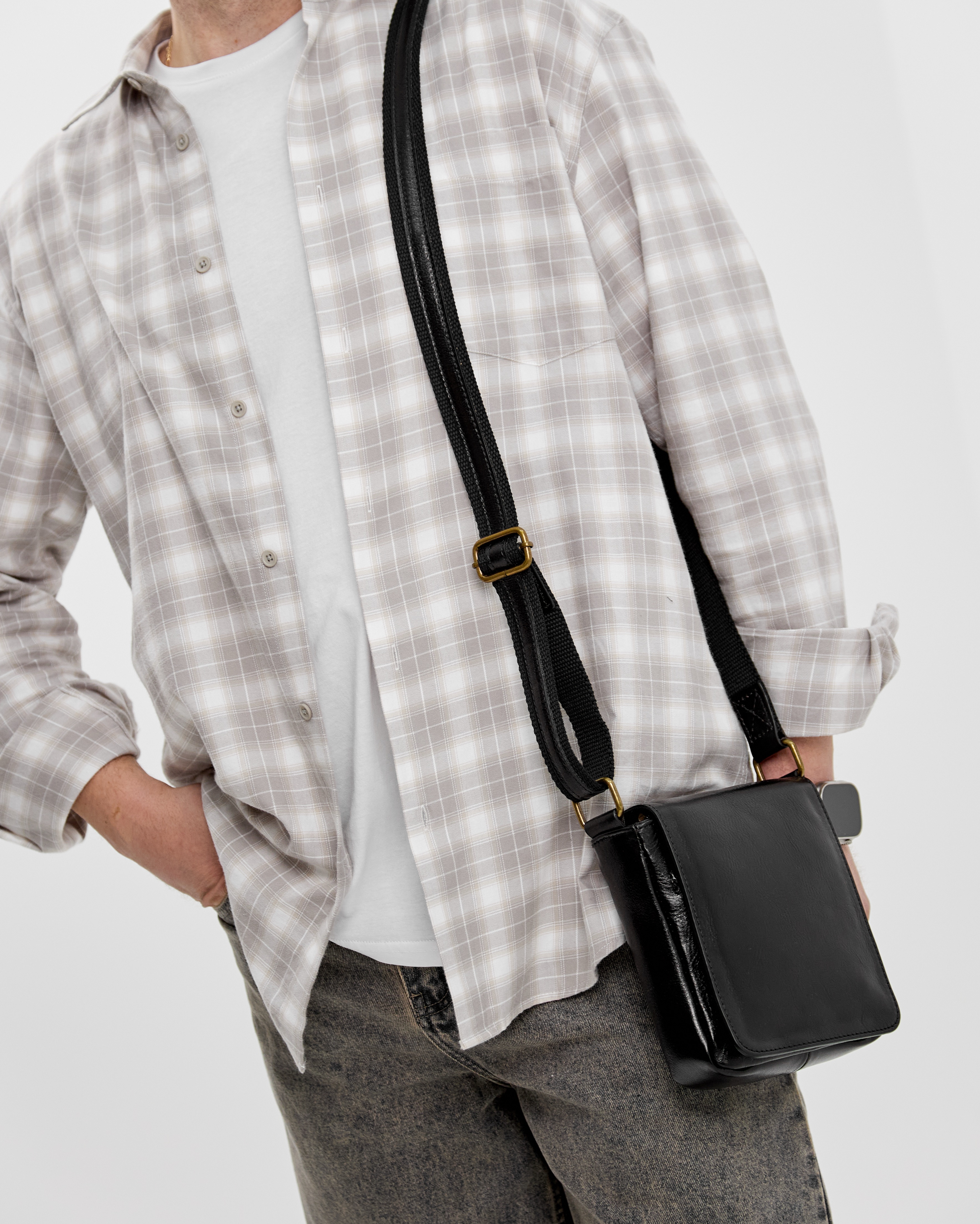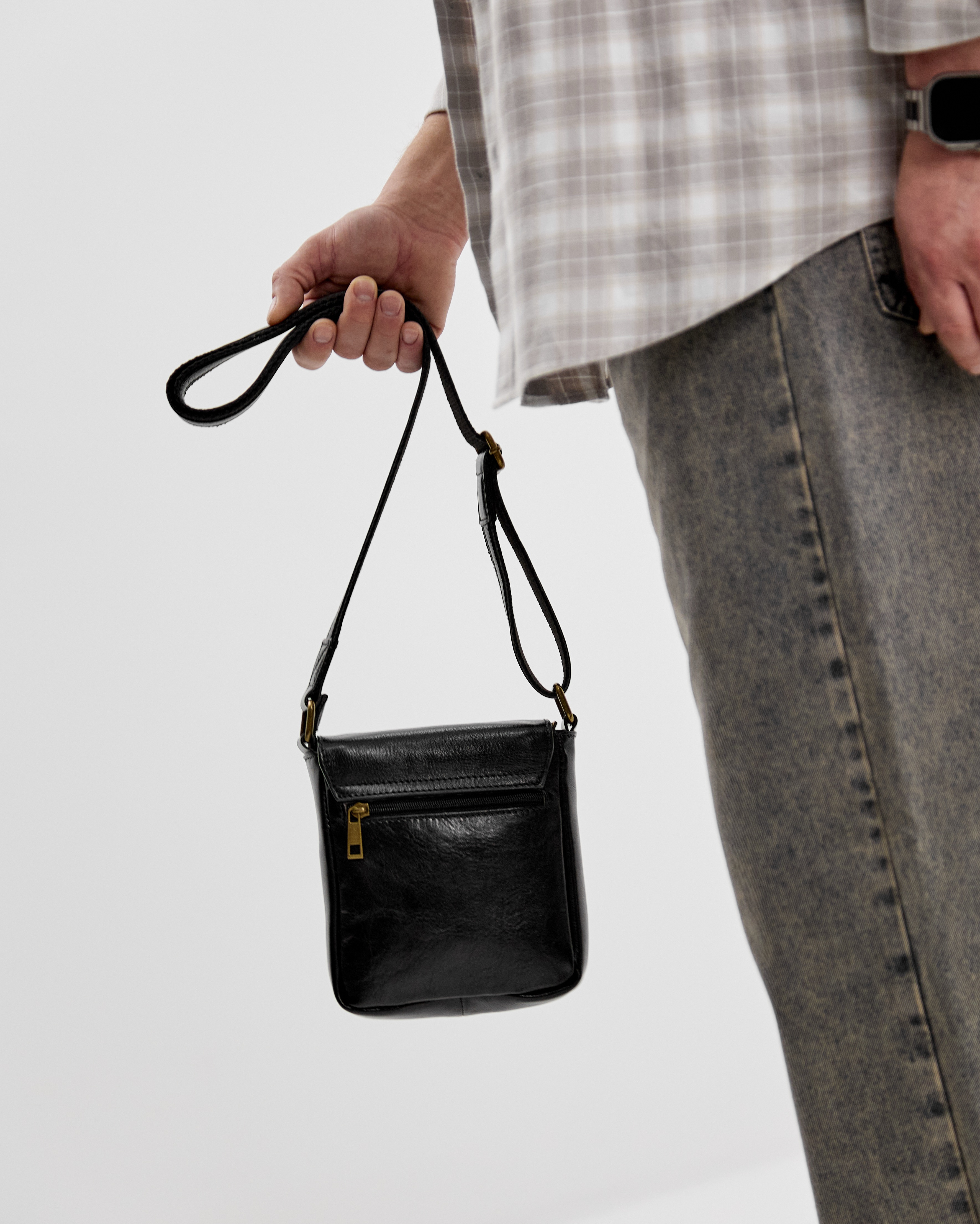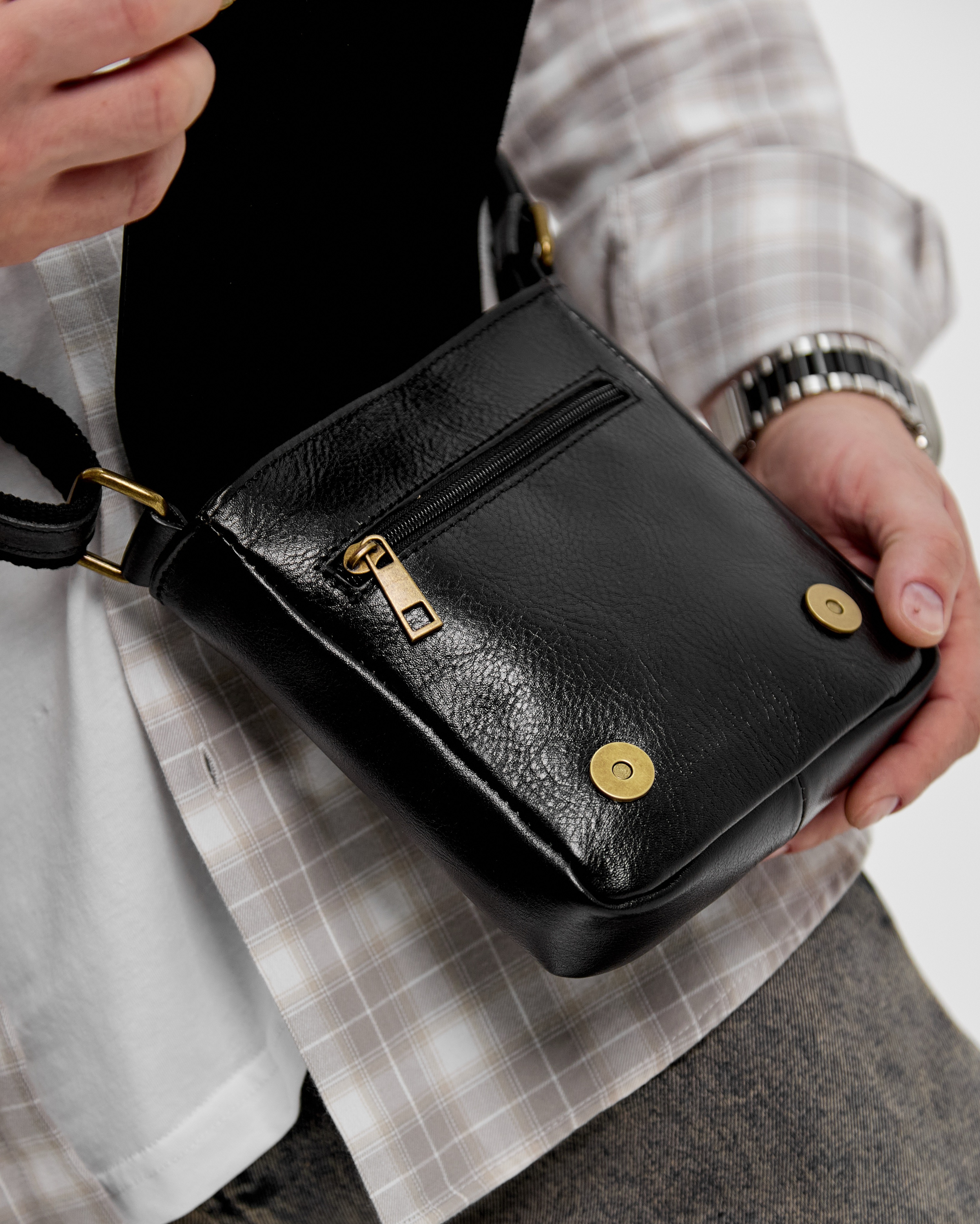 Внутри: одно отделение. Снаружи: на лицевой стороне под клапаном карман на молнии, на задней стороне также расположен кармана молнии. Сумка закрывается на магнитные кнопки. В комплекте: регулируемый по длине ремень до 145 см.