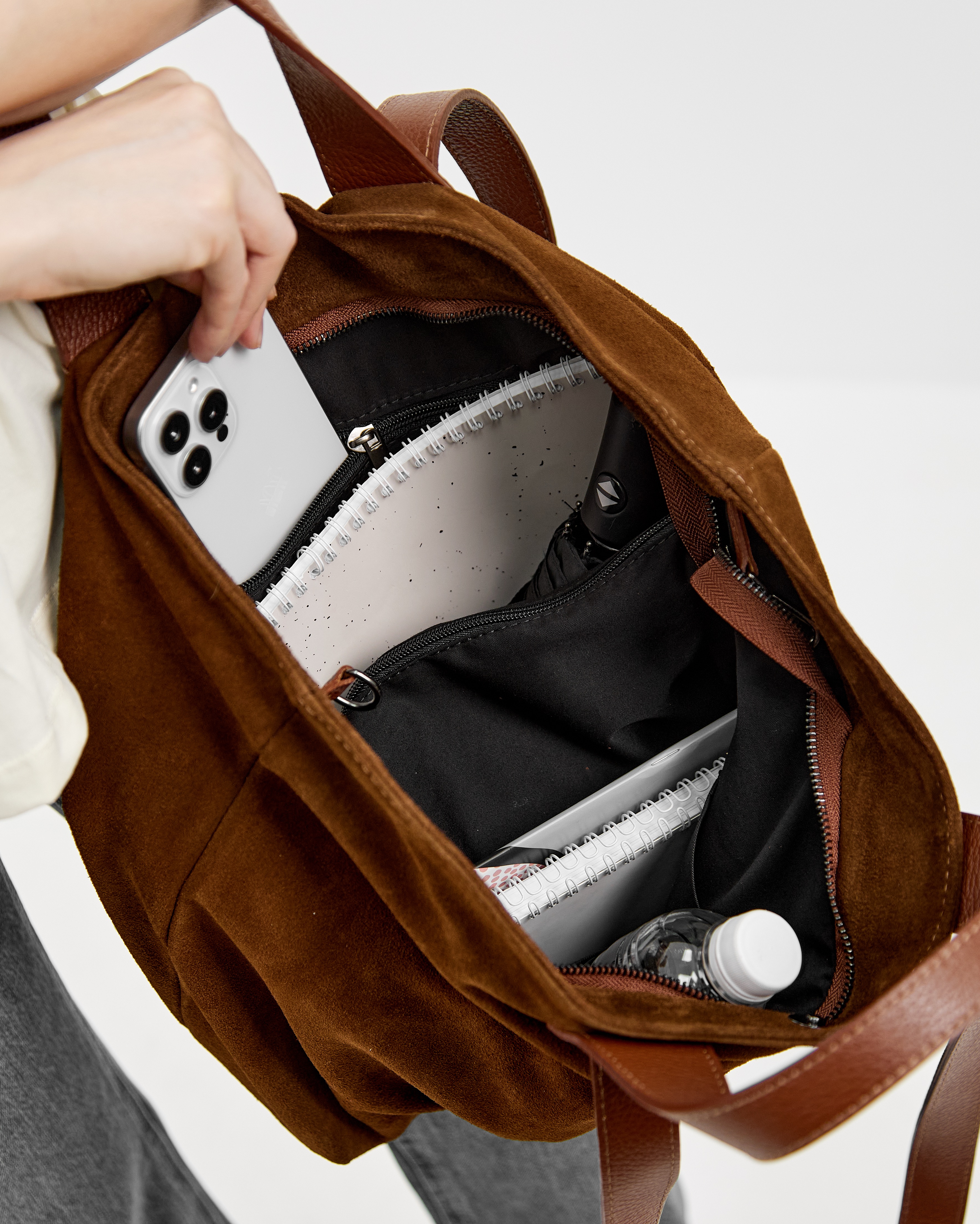 Одно отделение, кармашек-перегородка, мини-отсек для важных документов и карман для смартфона.