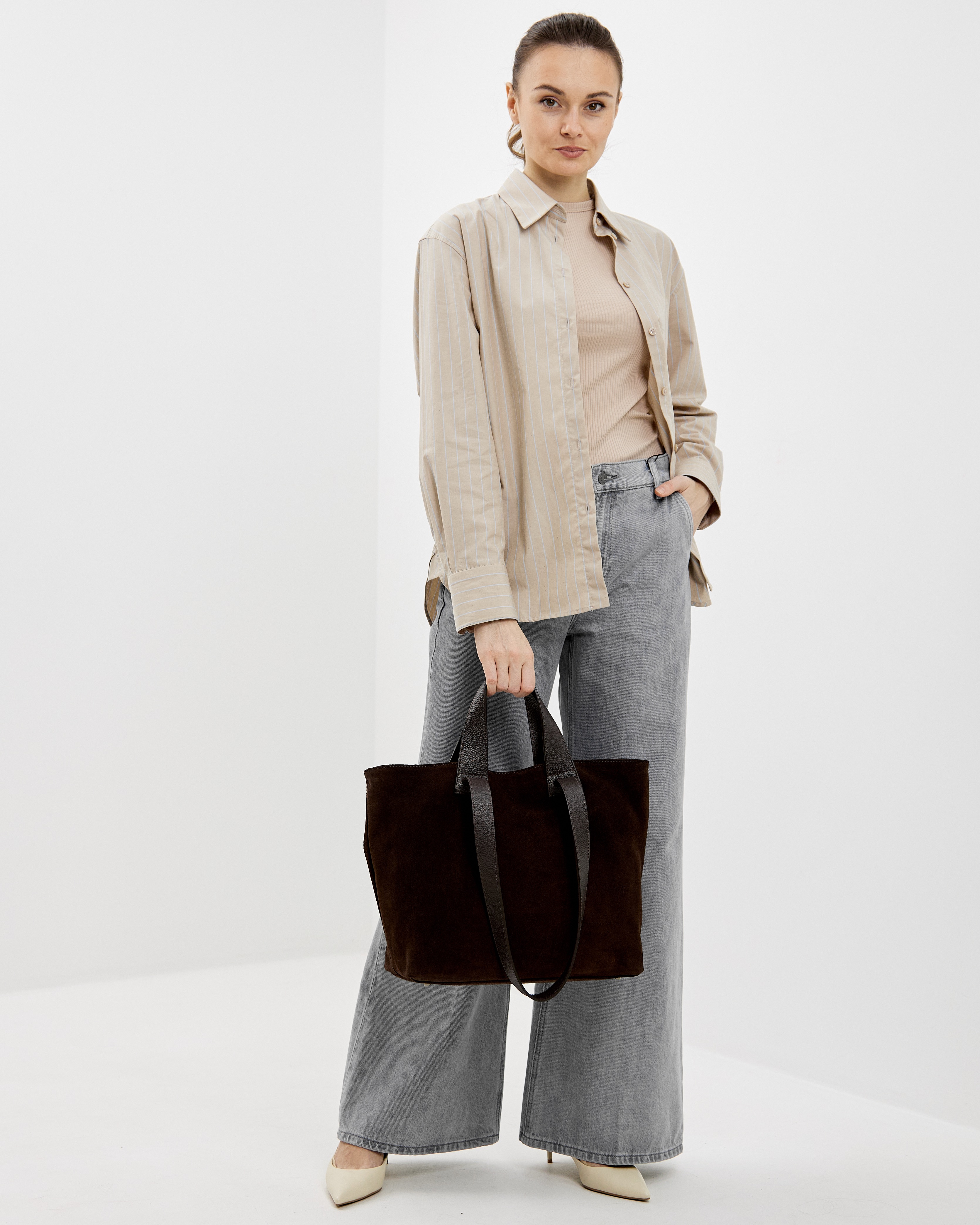 Сумка-шоппер от Vera Pelle выполнена из натуральной замши и декорирована фурнитурой серебряного цвета. Базовая модель, которая будет актуальна в любое время года и прекрасно подойдет для спорт-зала, путешествий, работы и повседневных дел.
