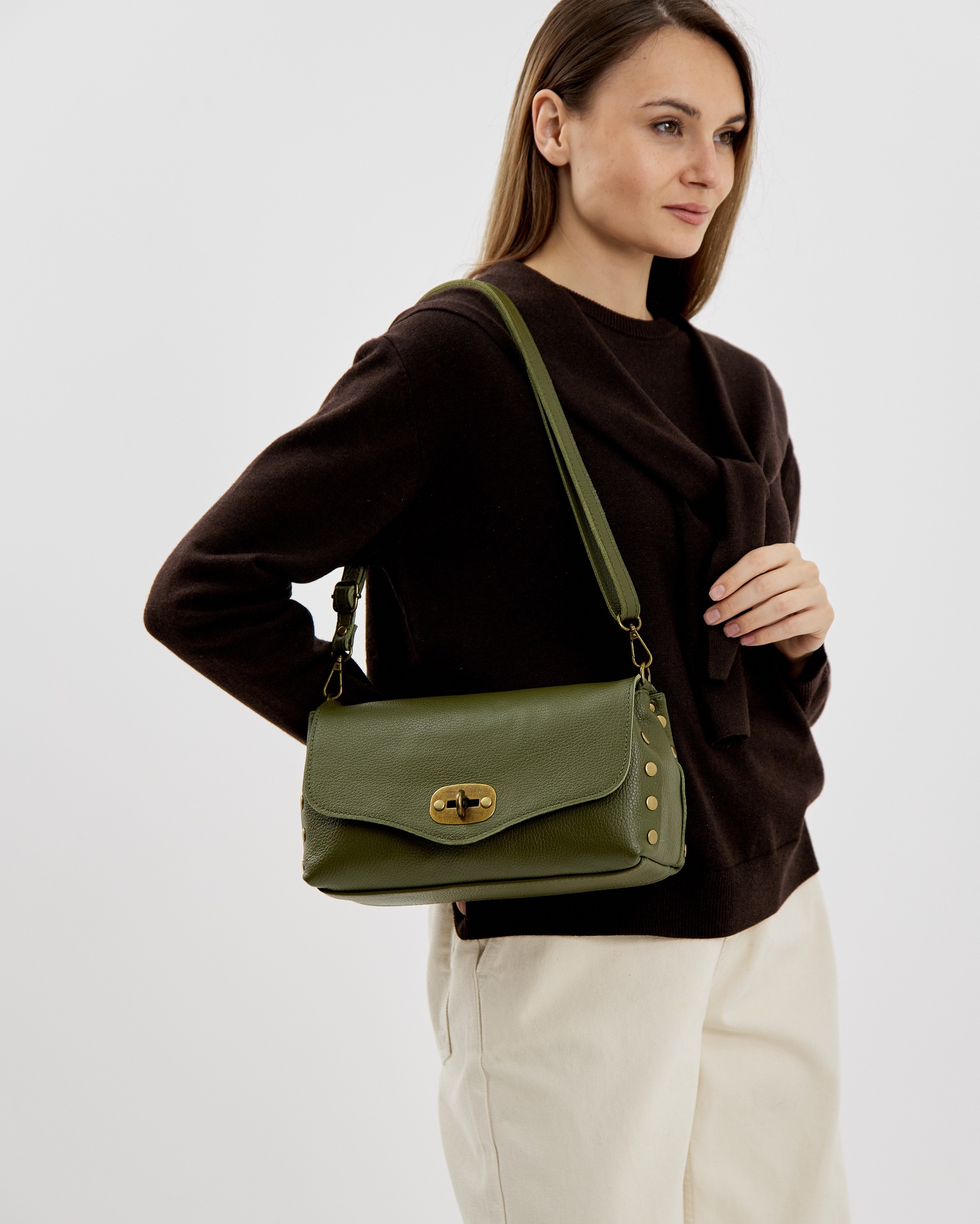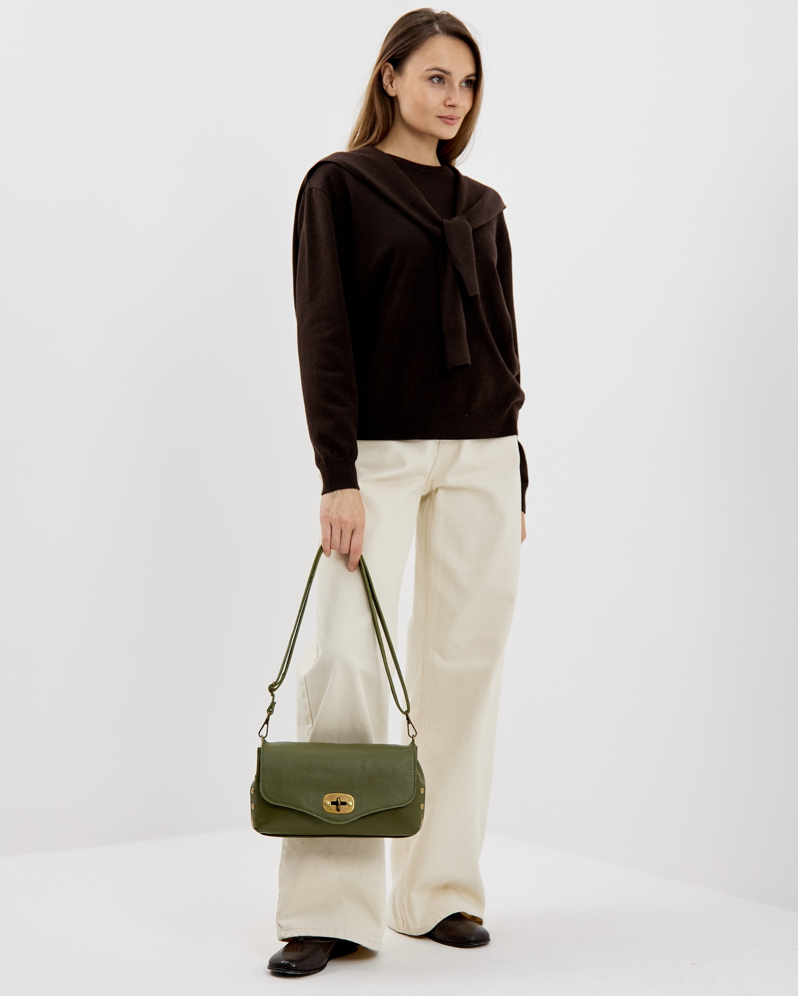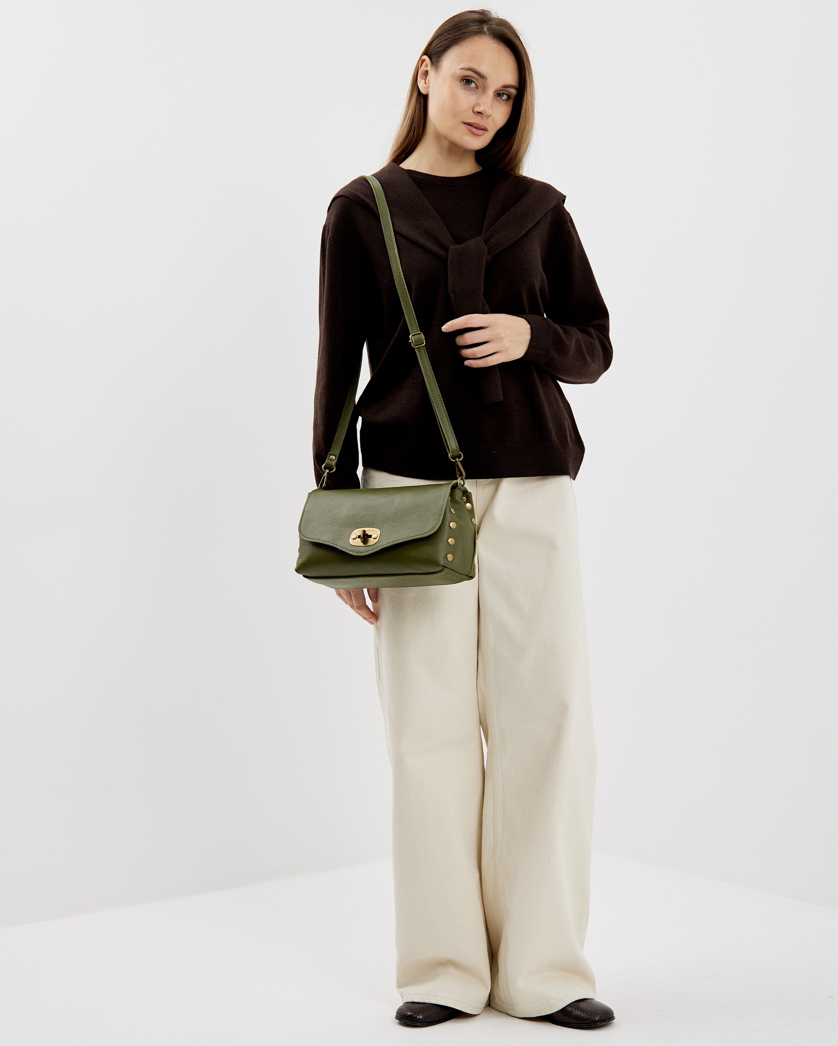 Сумка из коллекции итальянского бренда Vera Pelle выполнена из натуральной зернистой кожи и декорирована фурнитурой цвета латунь.