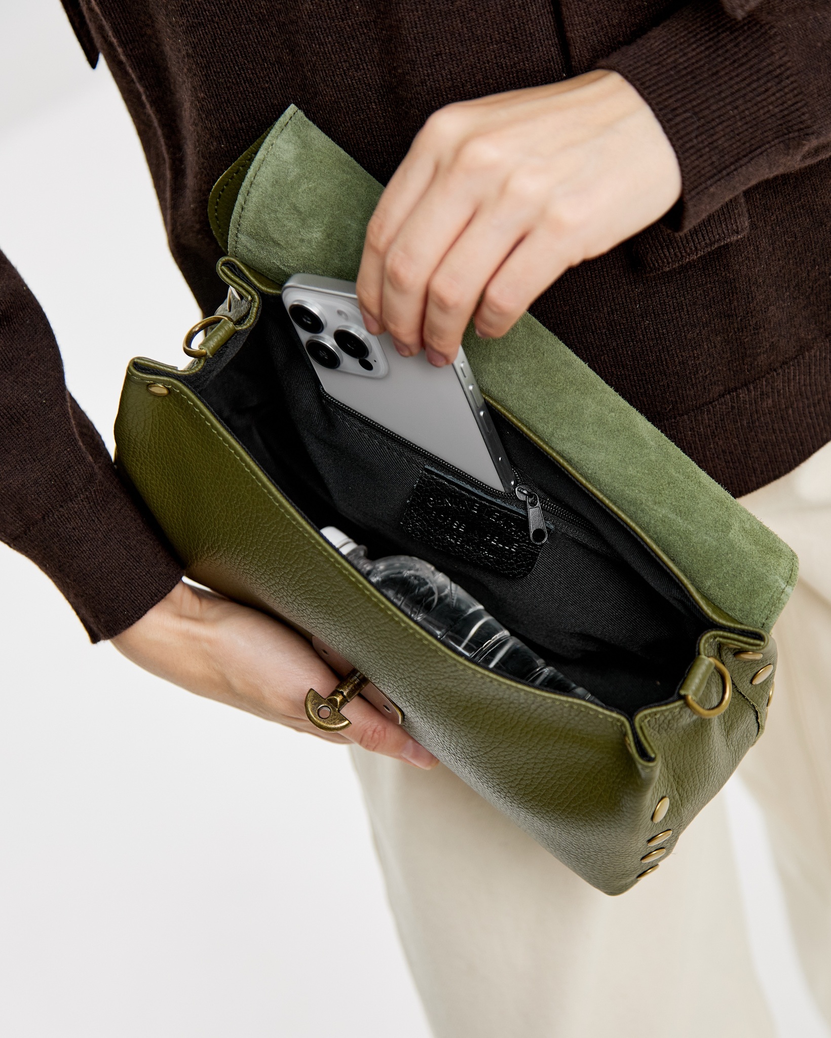 Сумка закрывается на поворотный замок, обеспечивая надежную защиту содержимого. Внутри вы найдете одно просторное отделение, а также открытый карман и карман на молнии для удобного хранения мелочей.