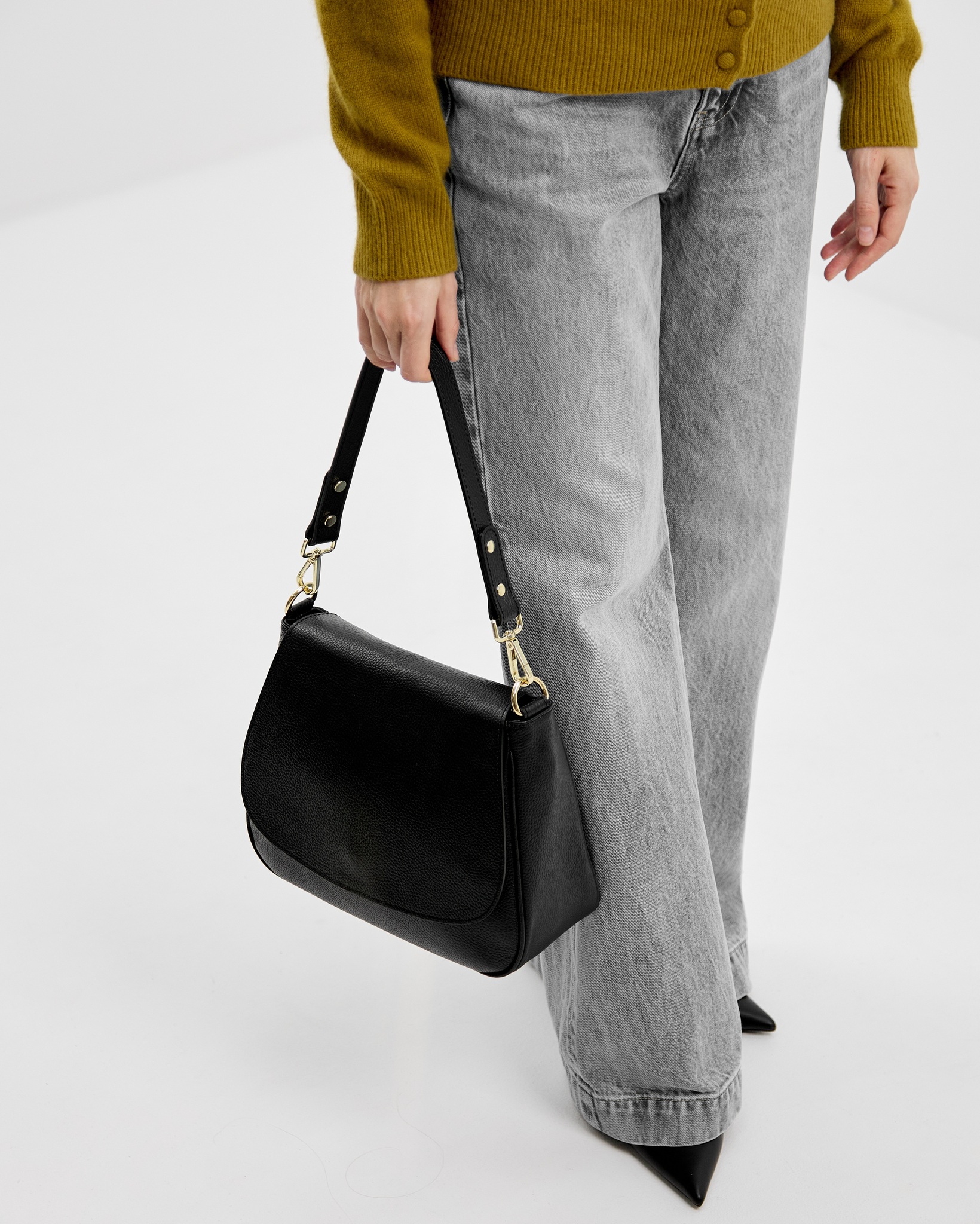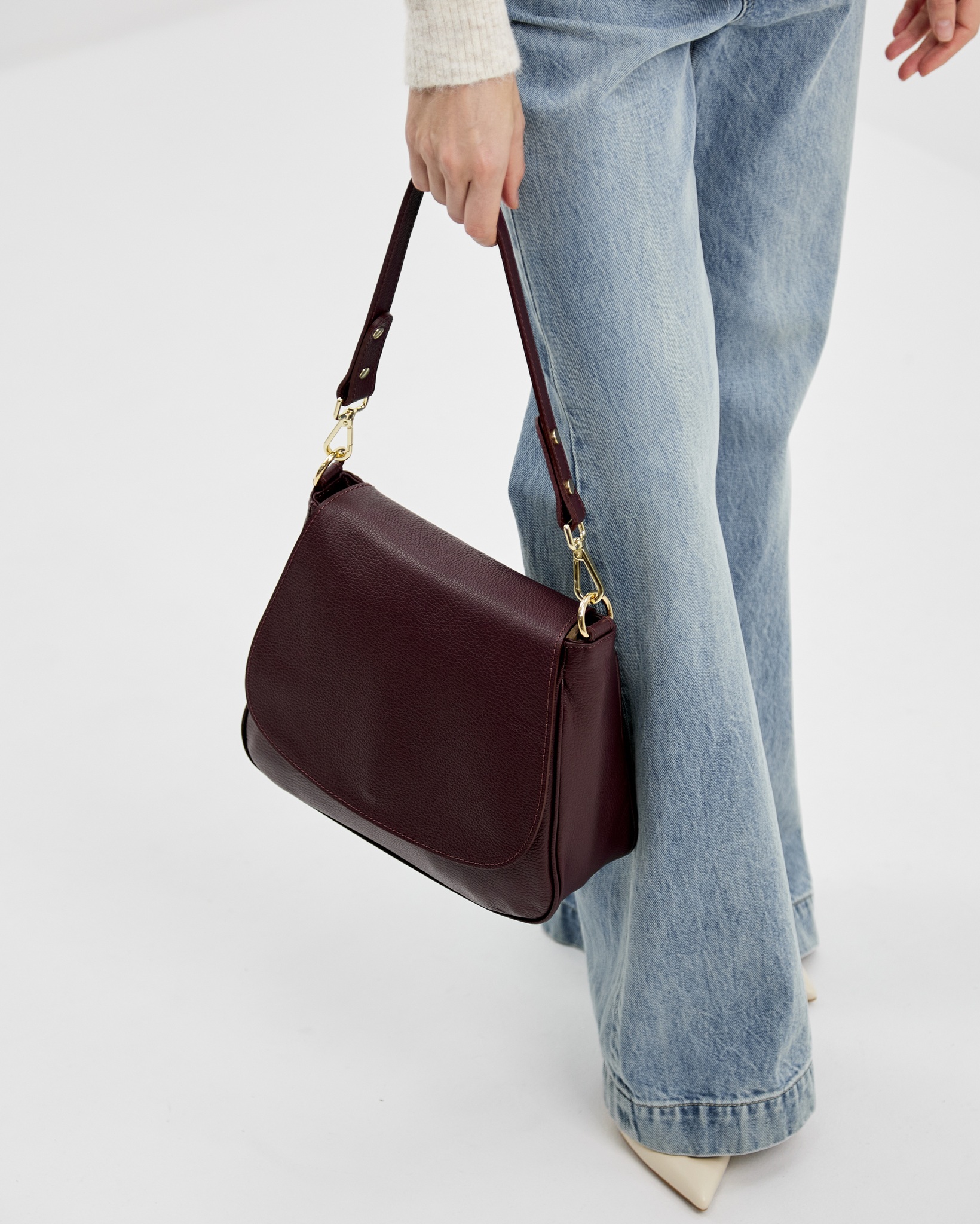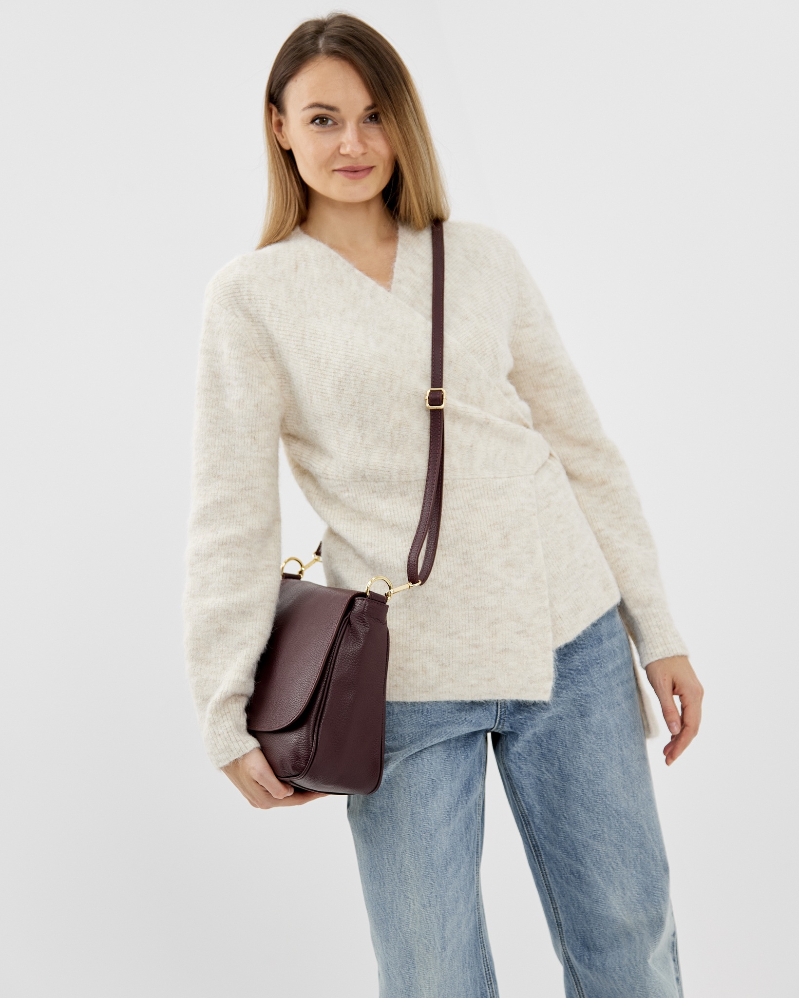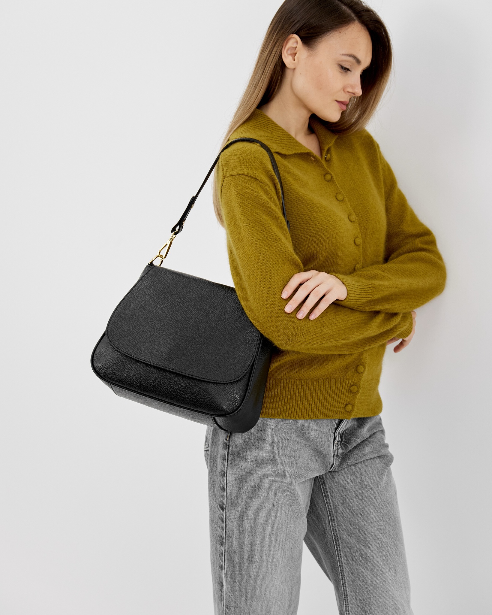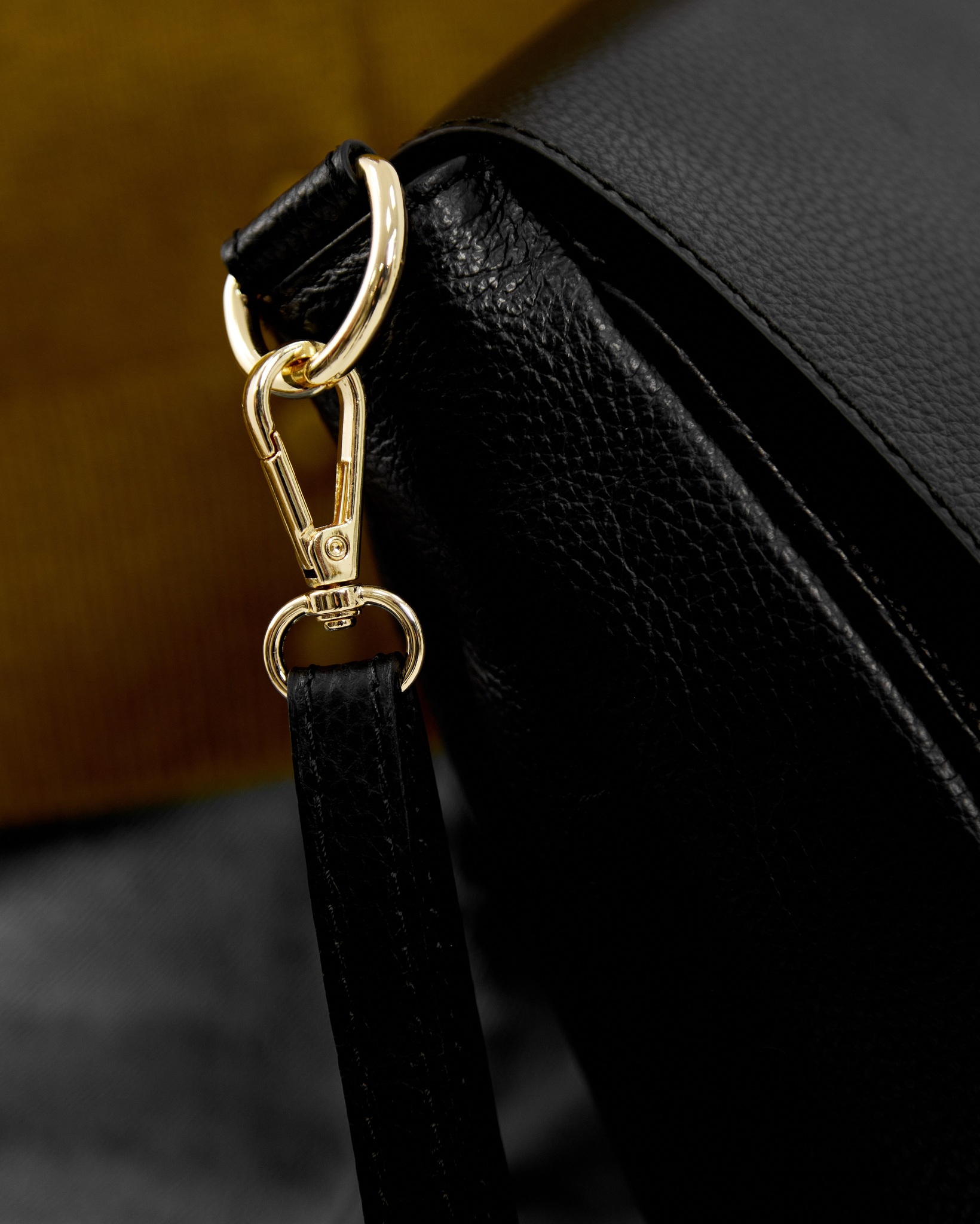 Базовая модель для ежедневного использования выполнена из натуральной зернистой кожи и декорирована фурнитурой золотого цвета.