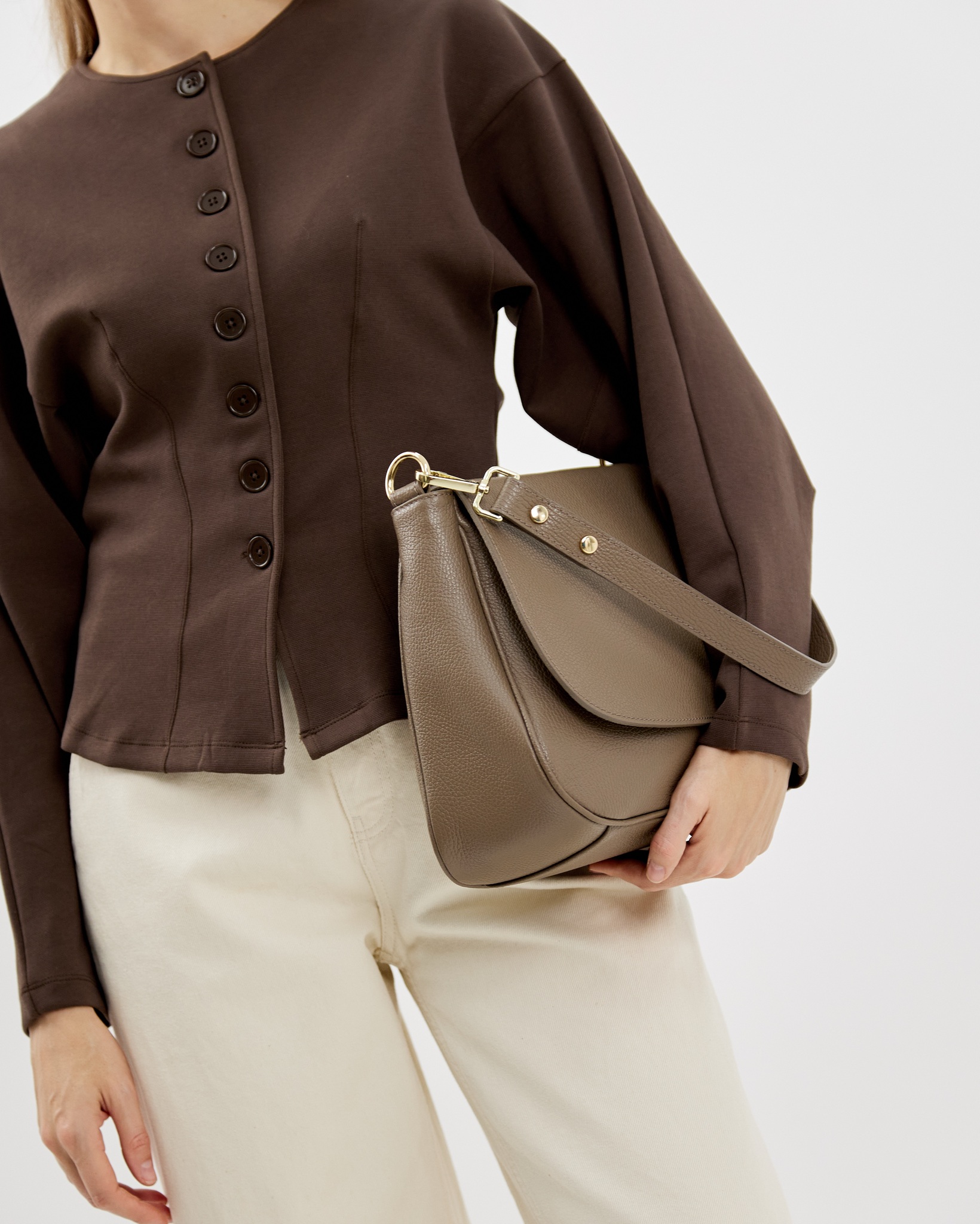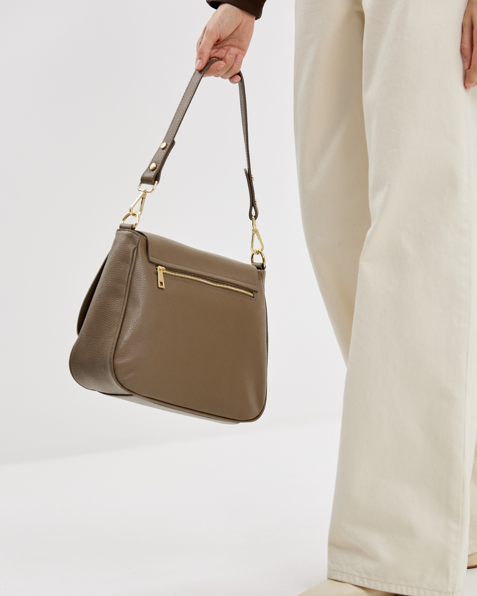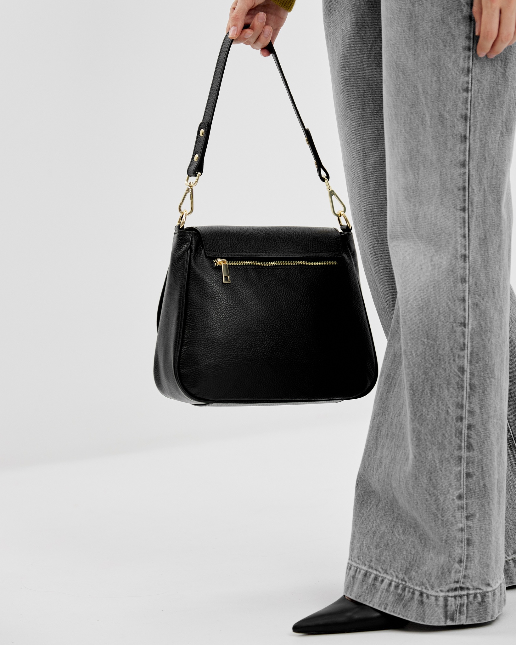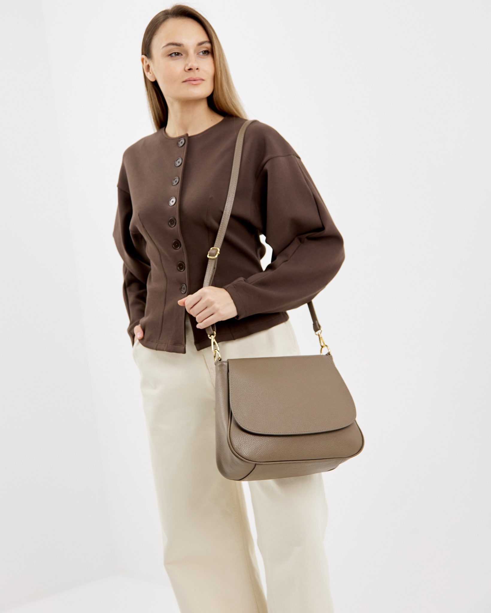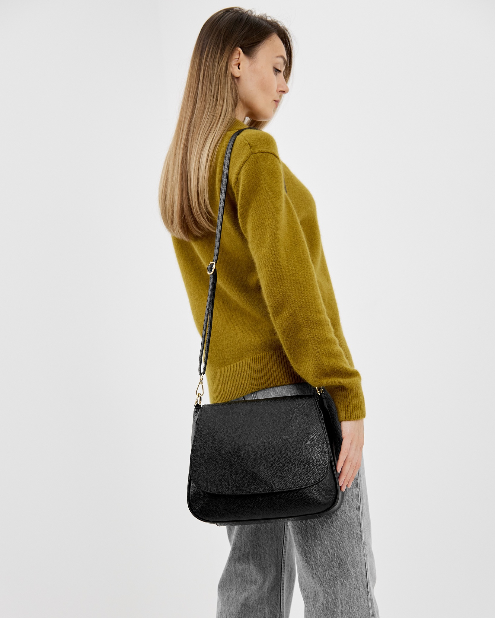 Базовая модель для ежедневного использования выполнена из натуральной зернистой кожи и декорирована фурнитурой золотого цвета.