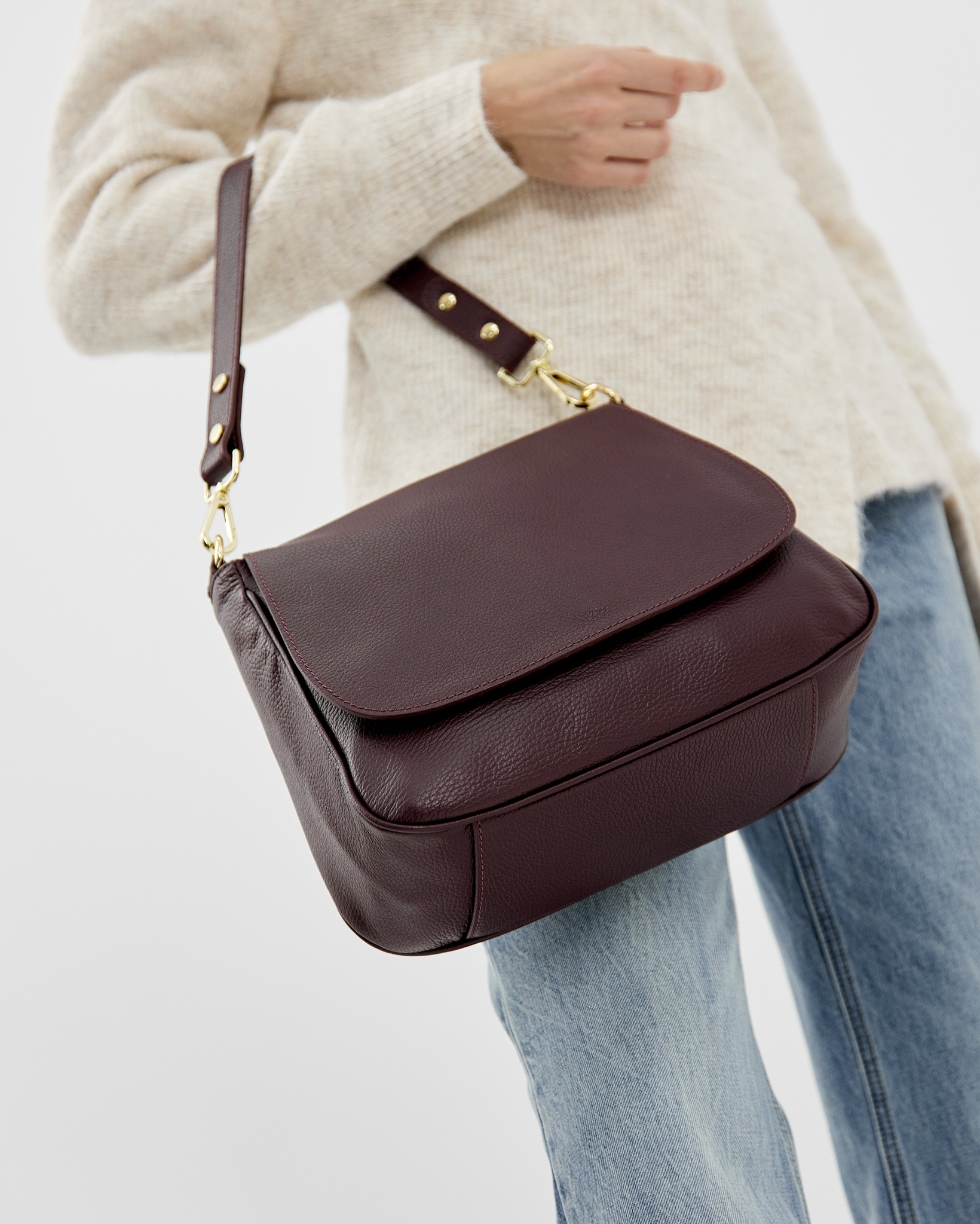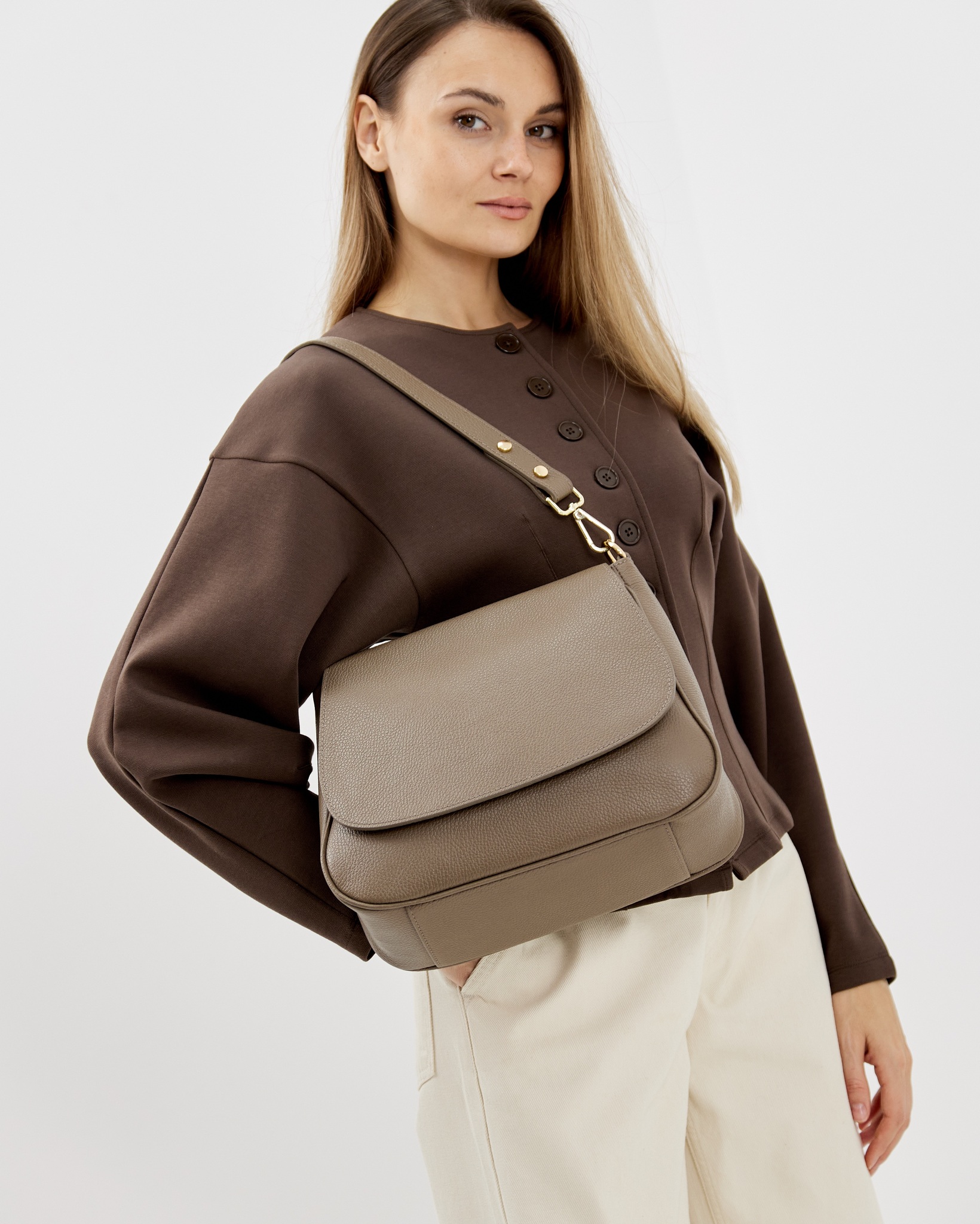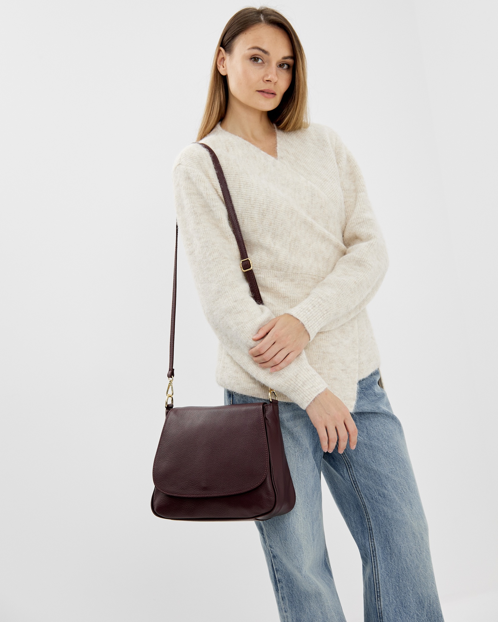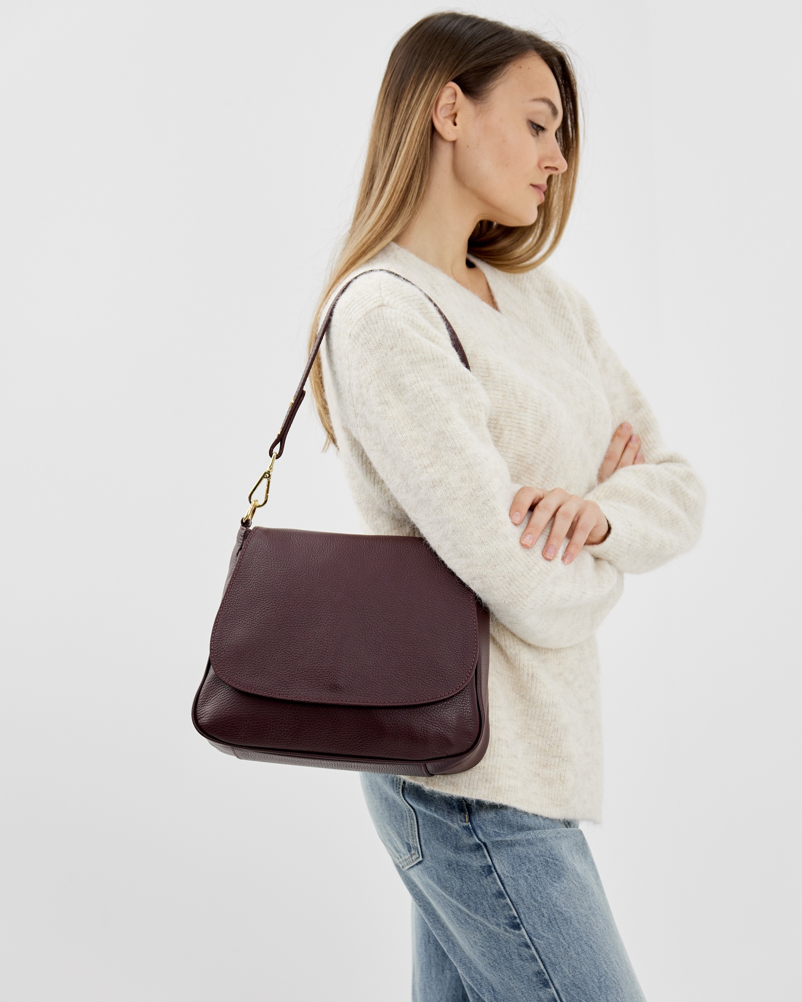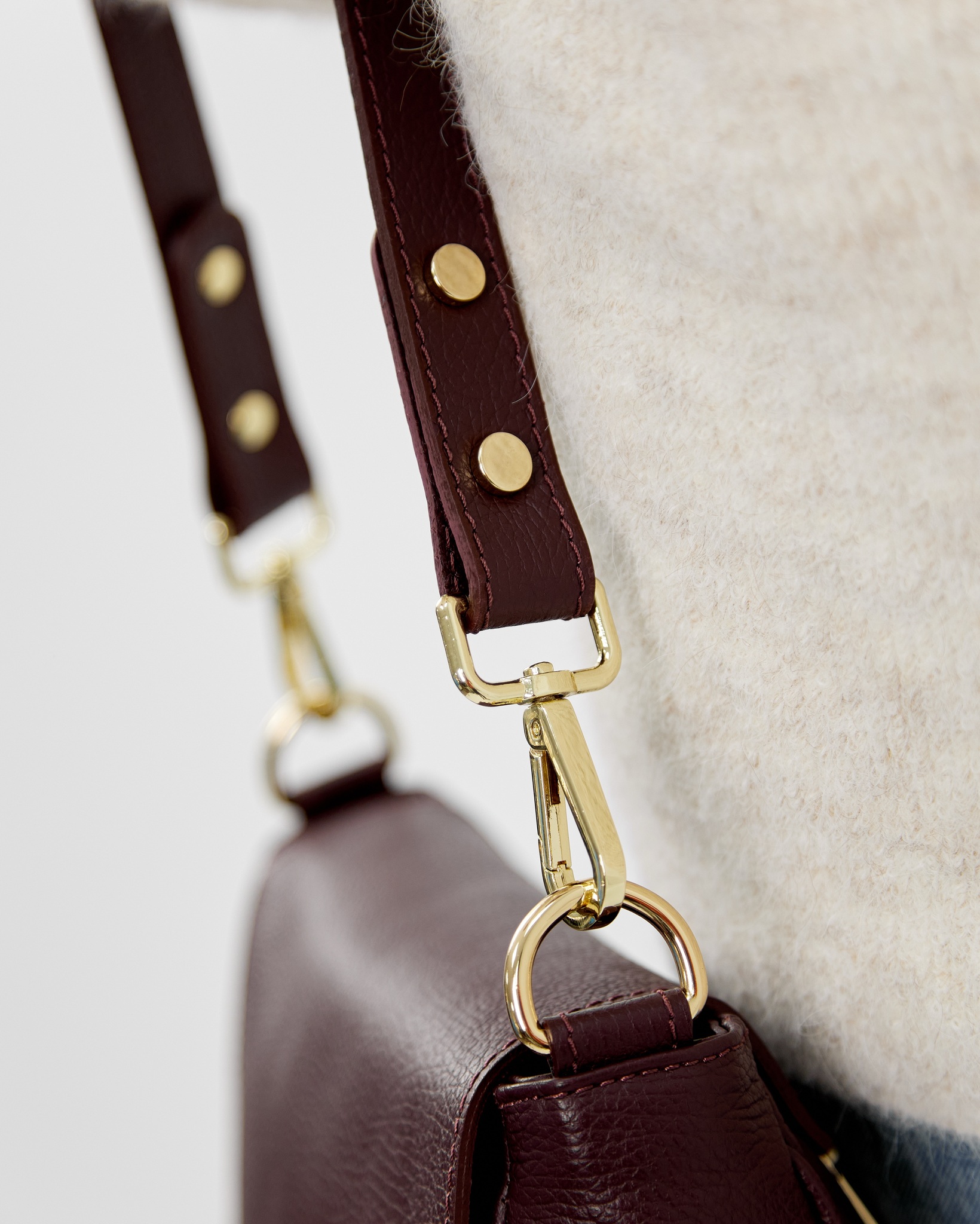 Базовая модель для ежедневного использования выполнена из натуральной зернистой кожи и декорирована фурнитурой золотого цвета.