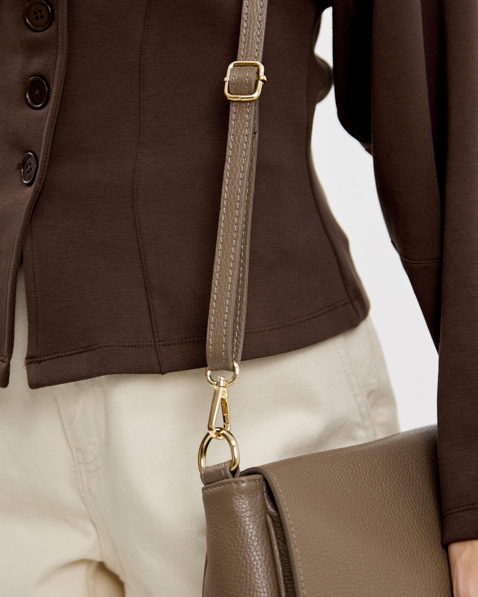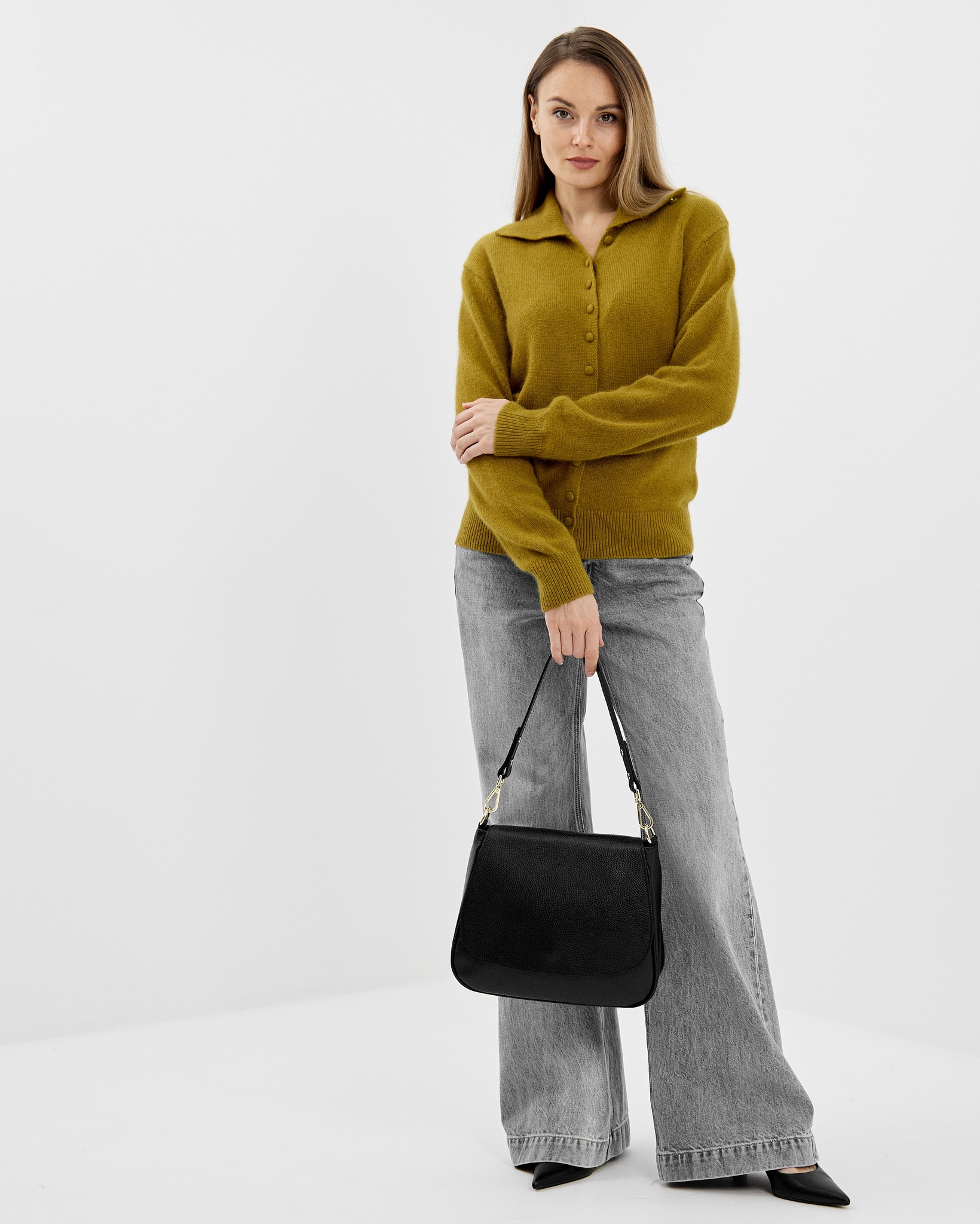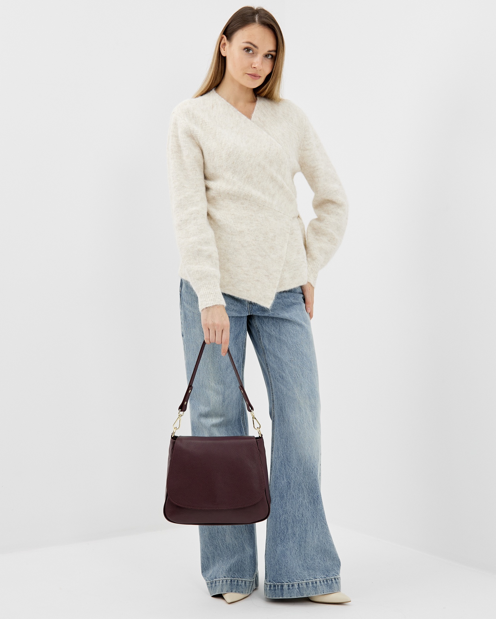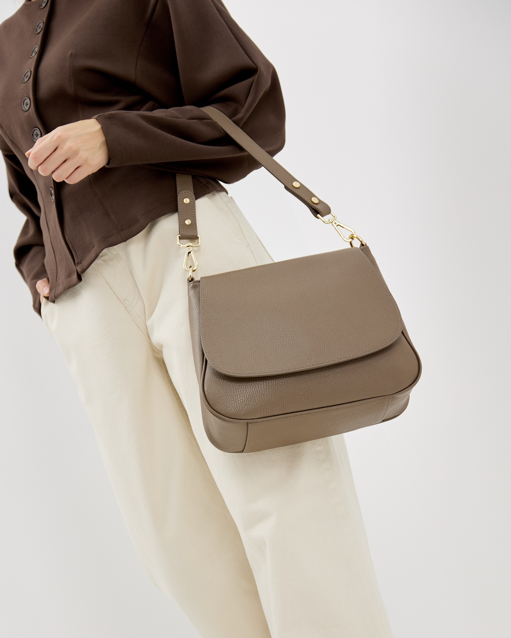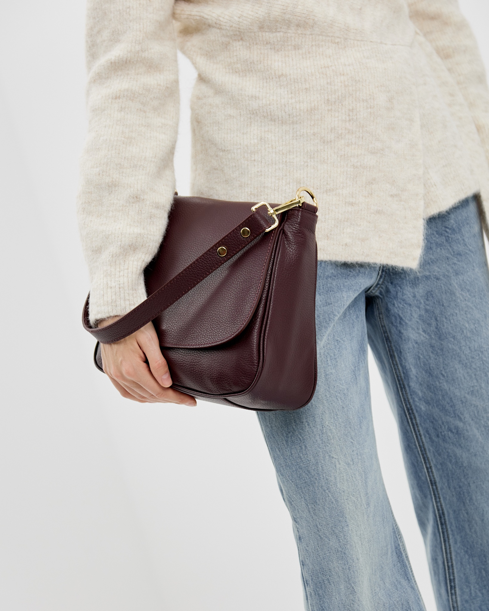 Базовая модель для ежедневного использования выполнена из натуральной зернистой кожи и декорирована фурнитурой золотого цвета.