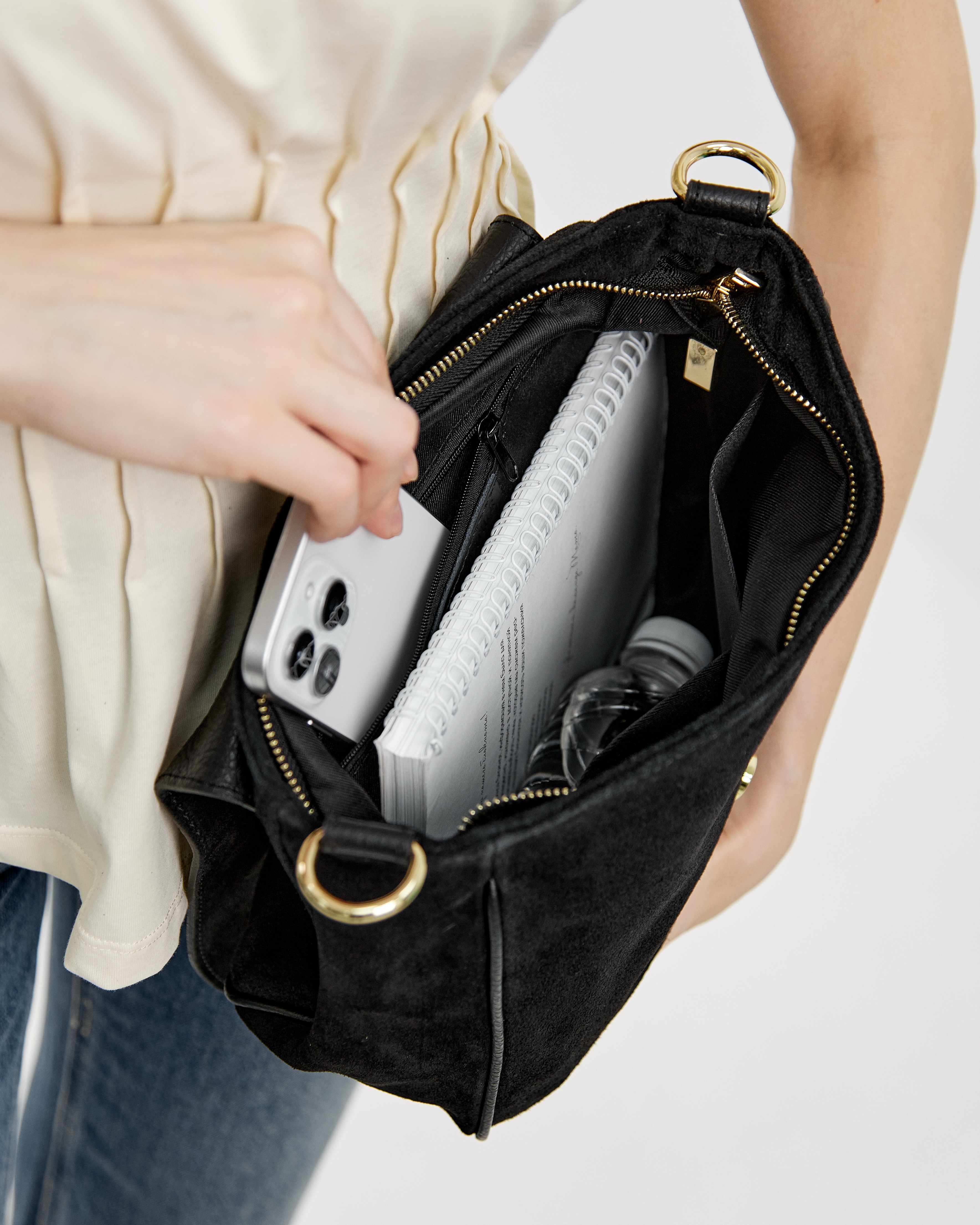 Сумка выполнена из натуральной замши и декорирована фурнитурой золотого цвета.
