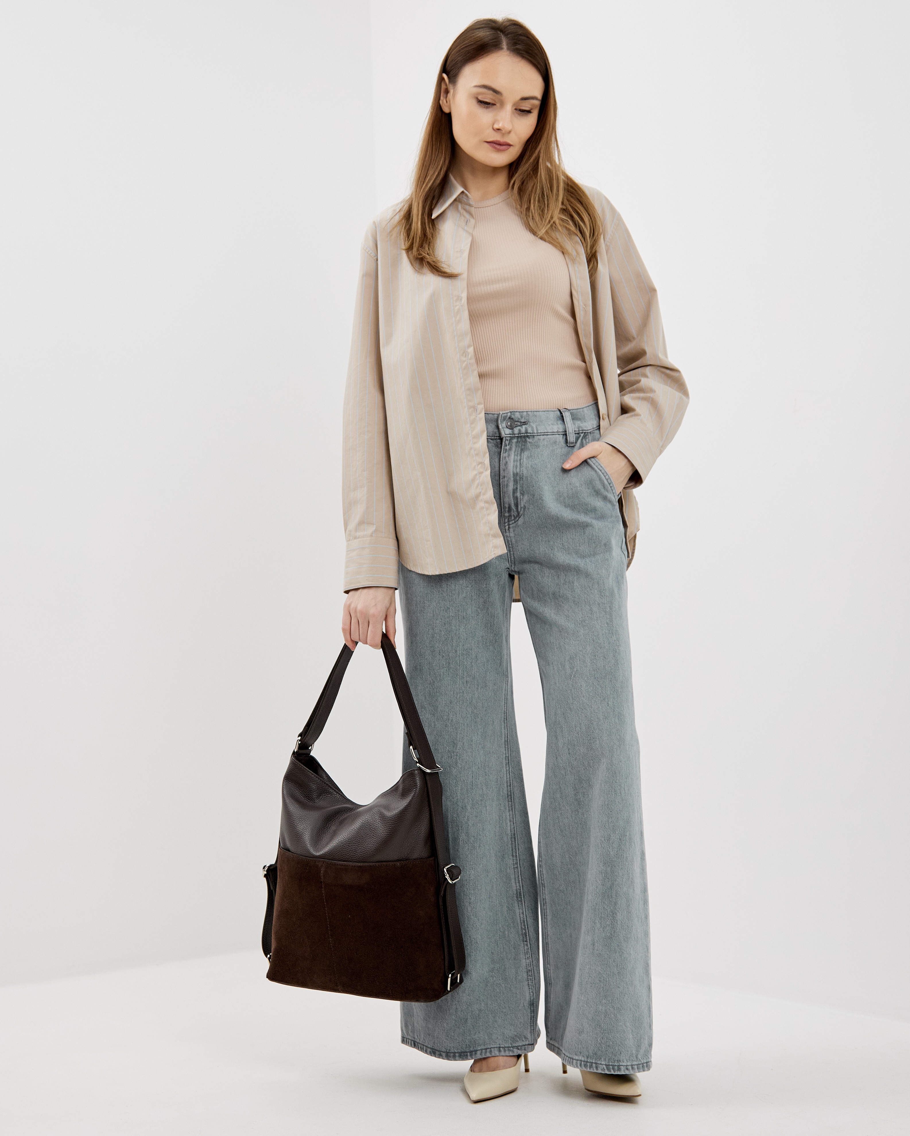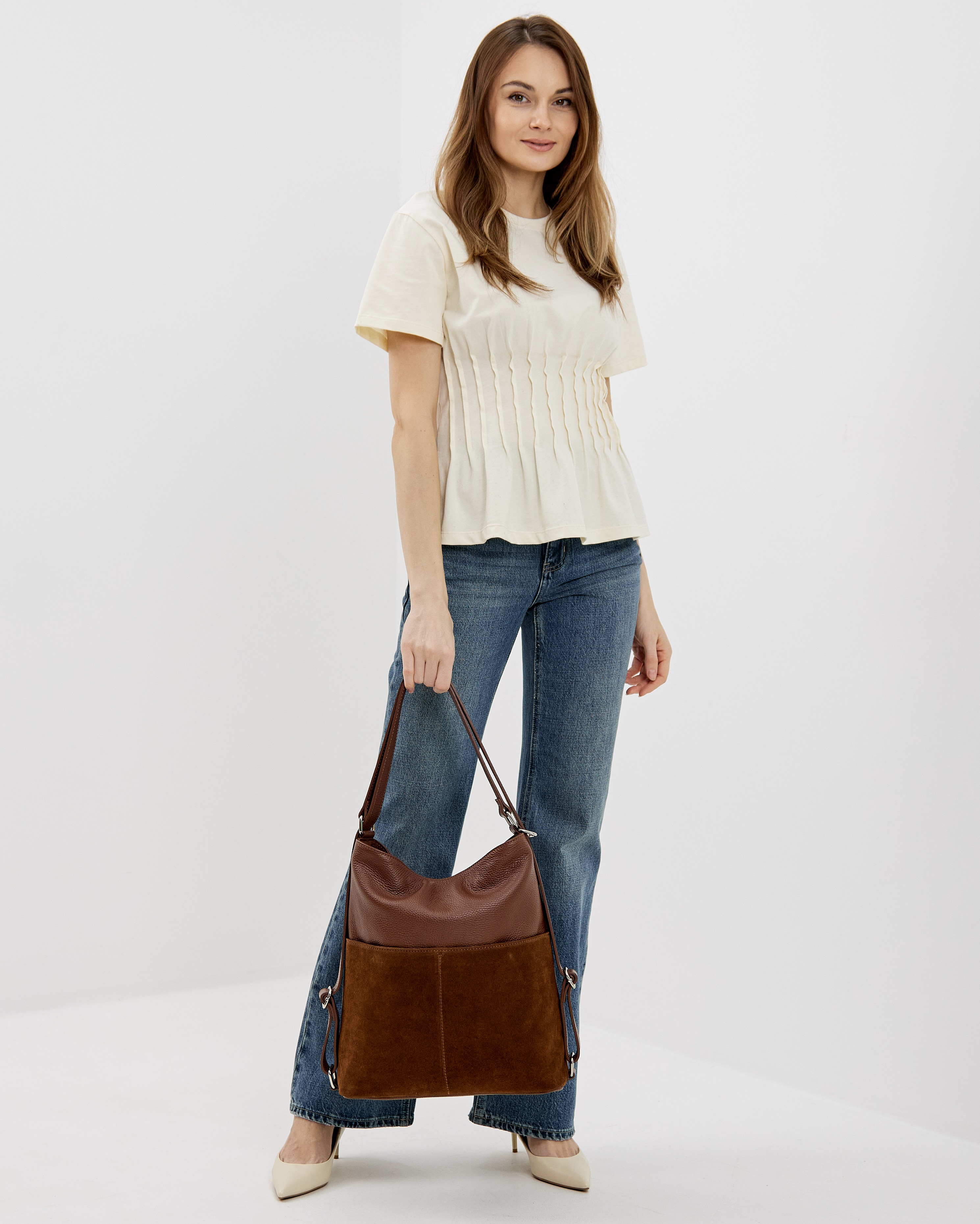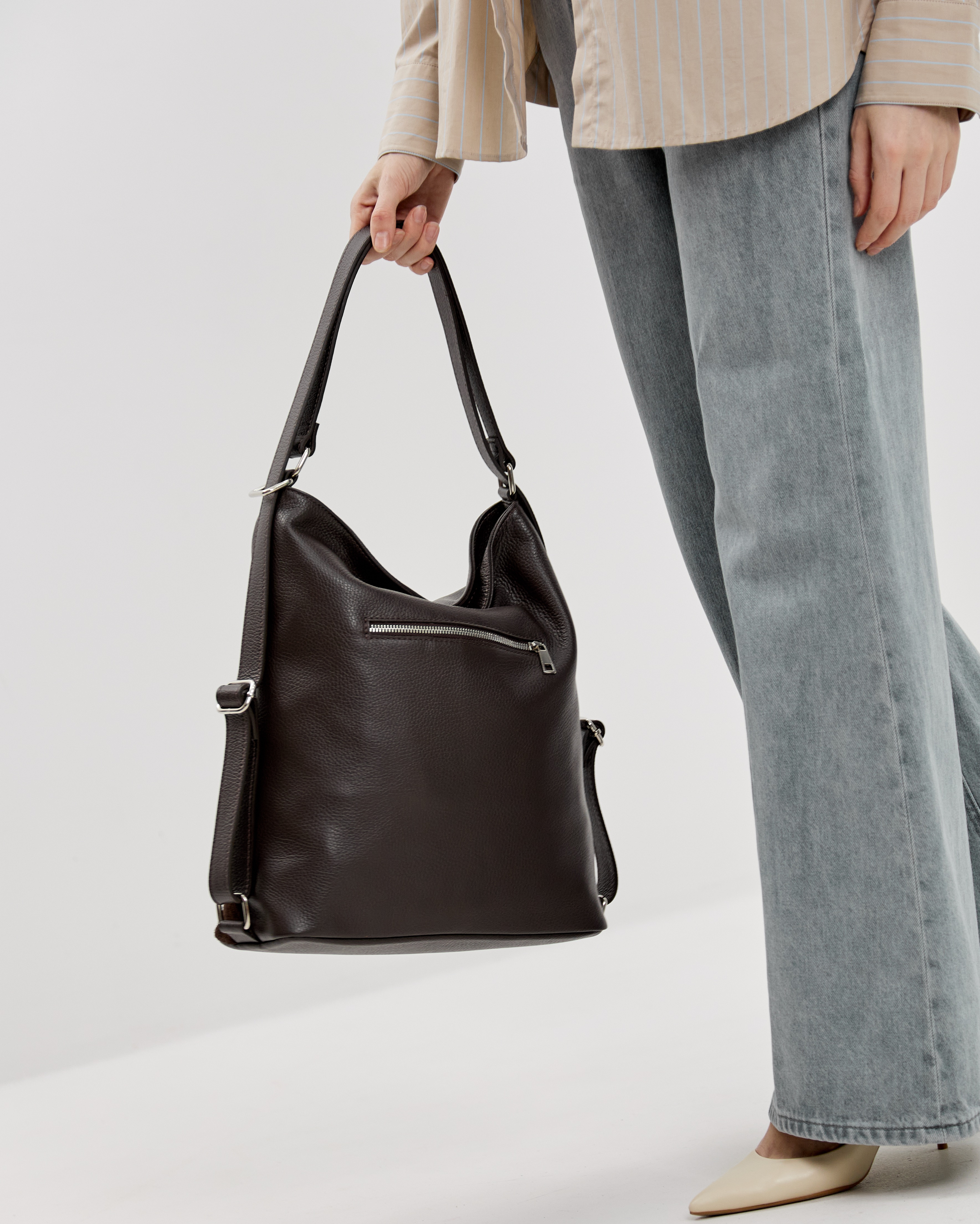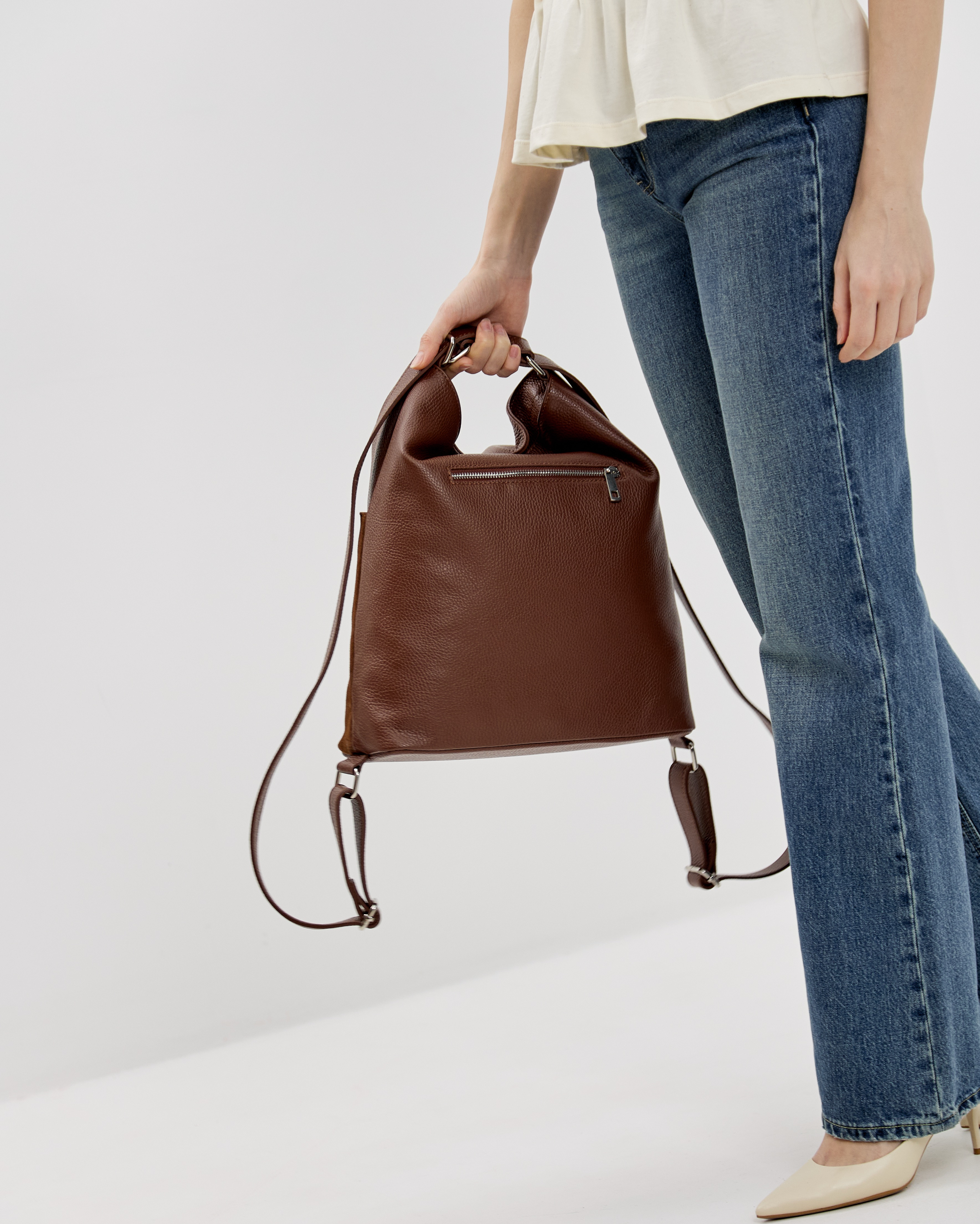 Сумку удобно носить как за короткую ручку в руке или на плече, так и в формате рюкзака, за счет устройства ручек. Закрывается надежно с помощью молнии.