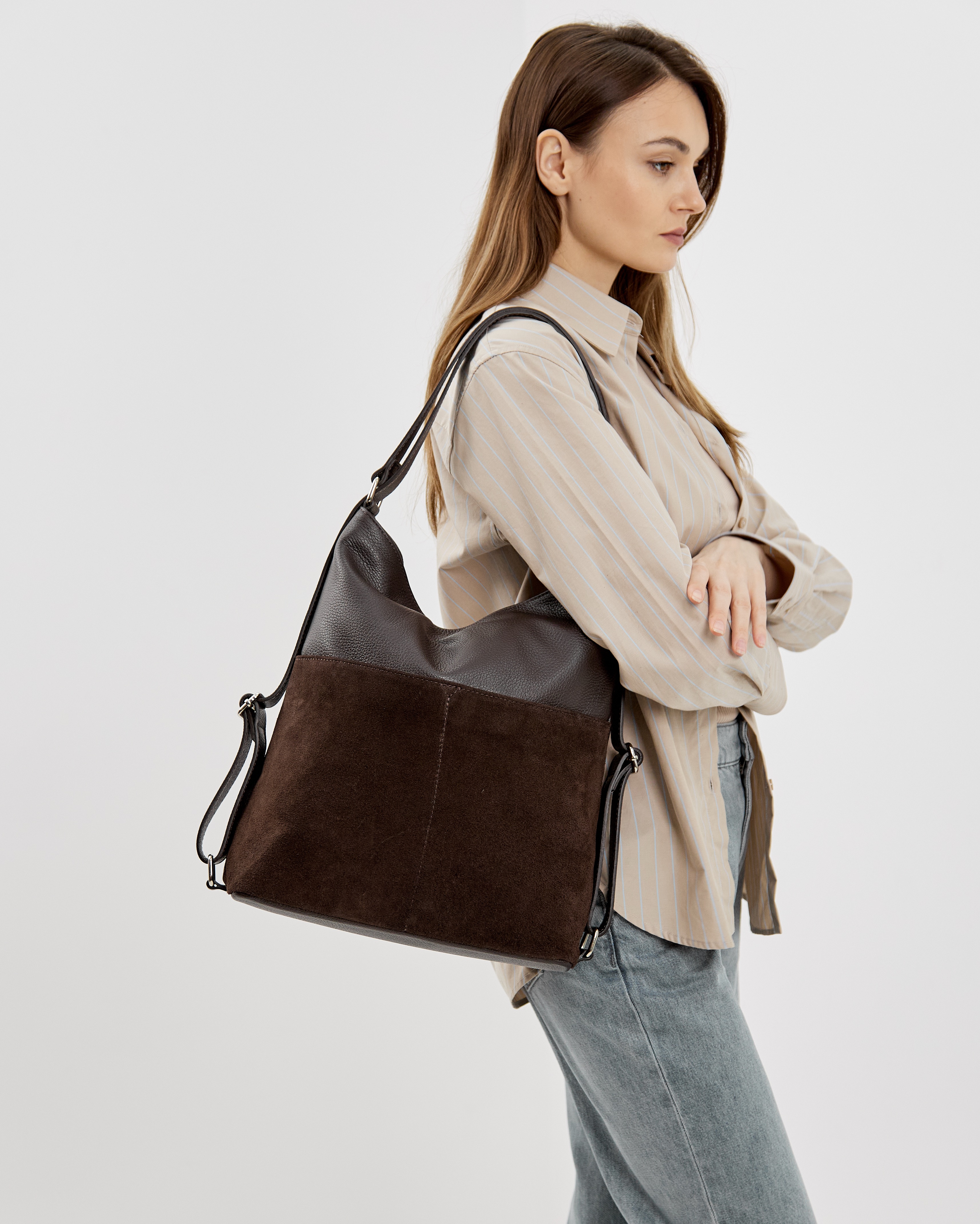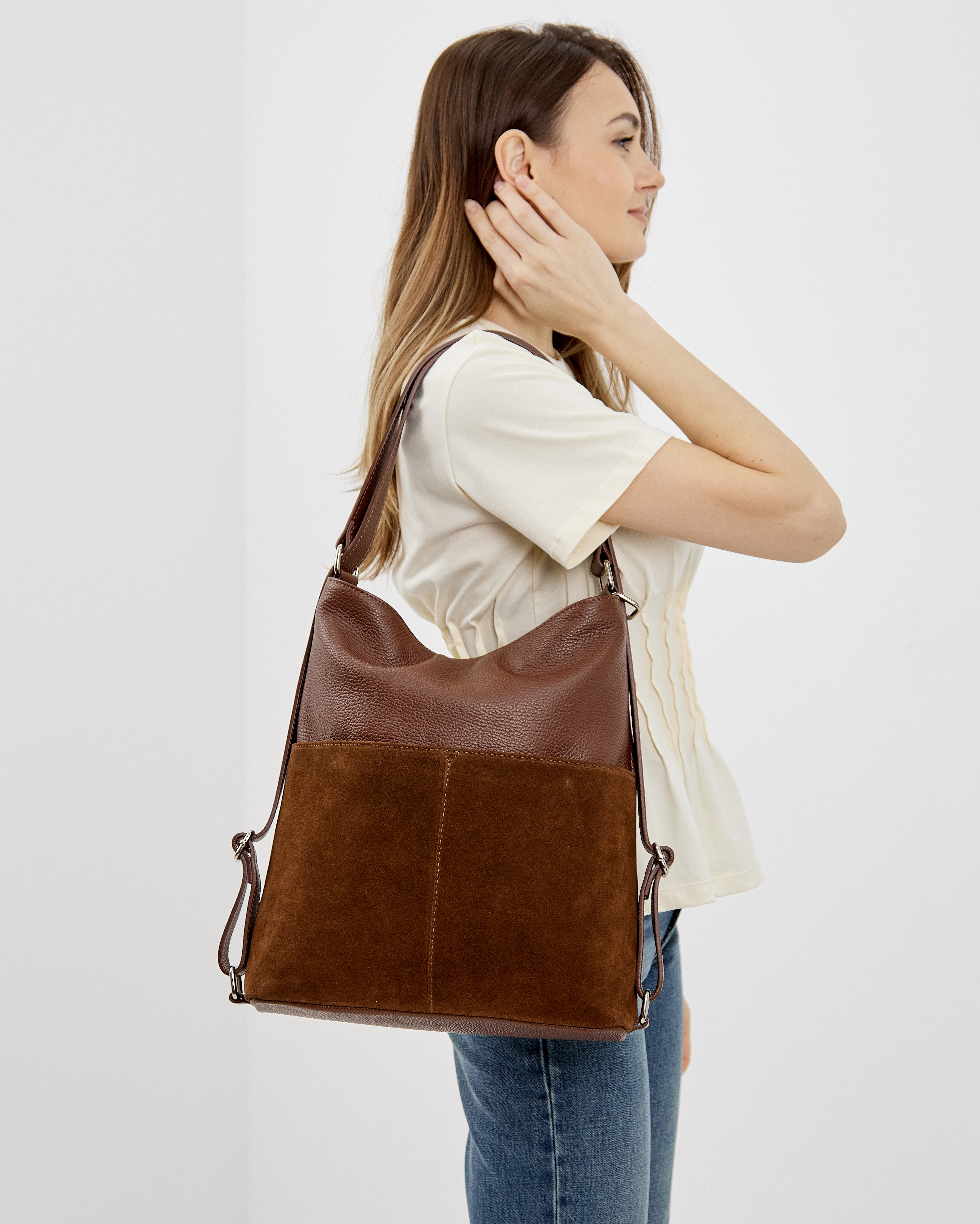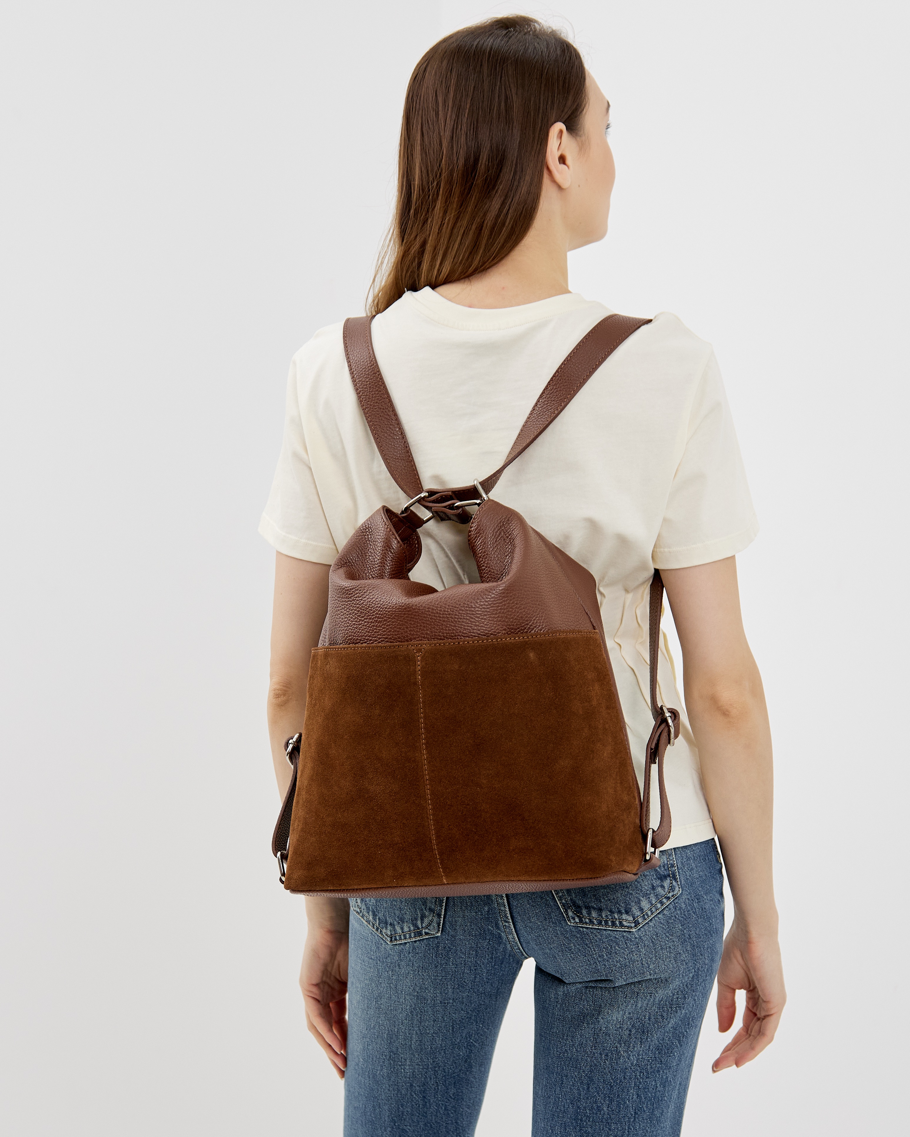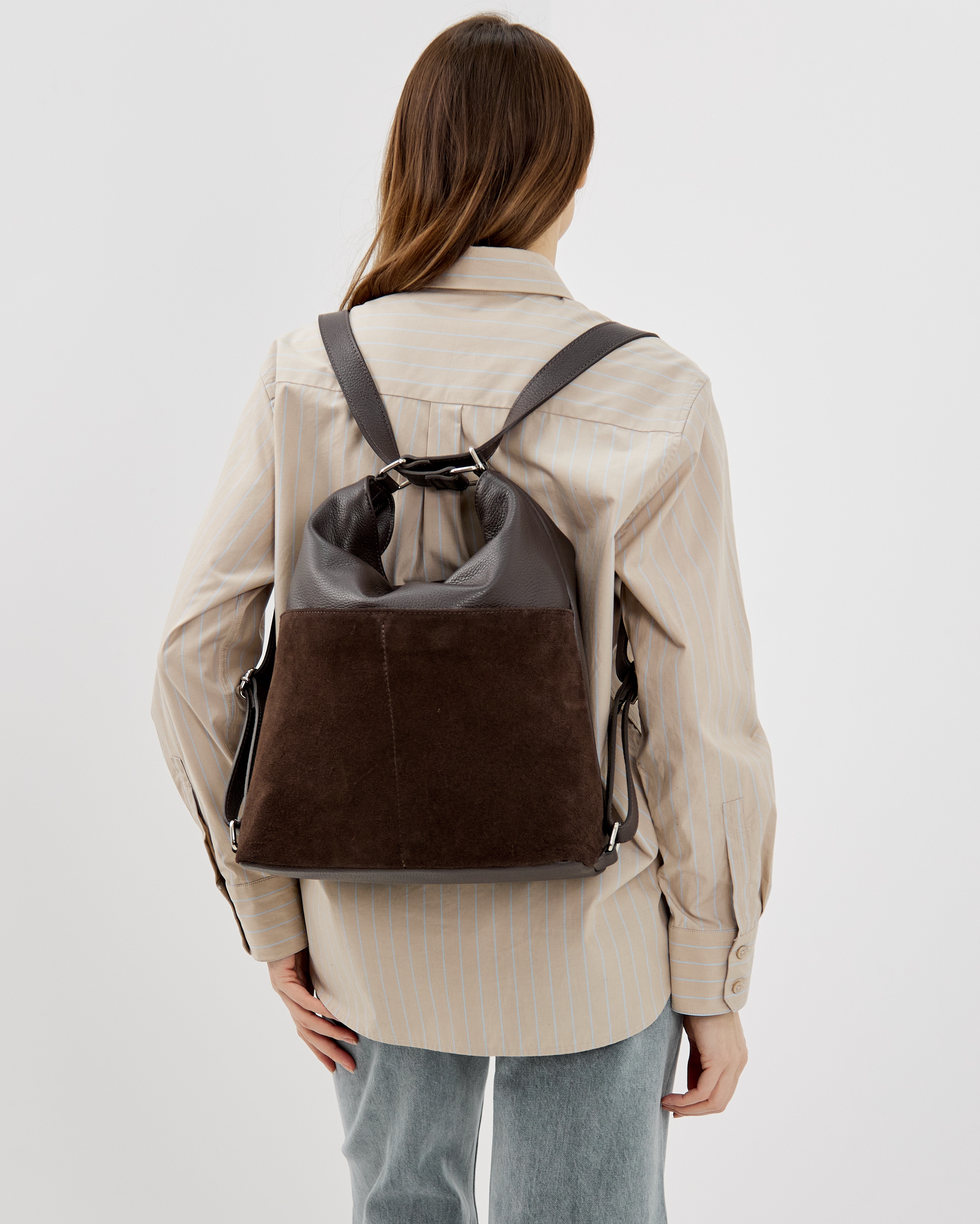 Сумка-рюкзак выполнена из натуральной зернистой кожи и замши, декорирована фурнитурой серебряного цвета.
